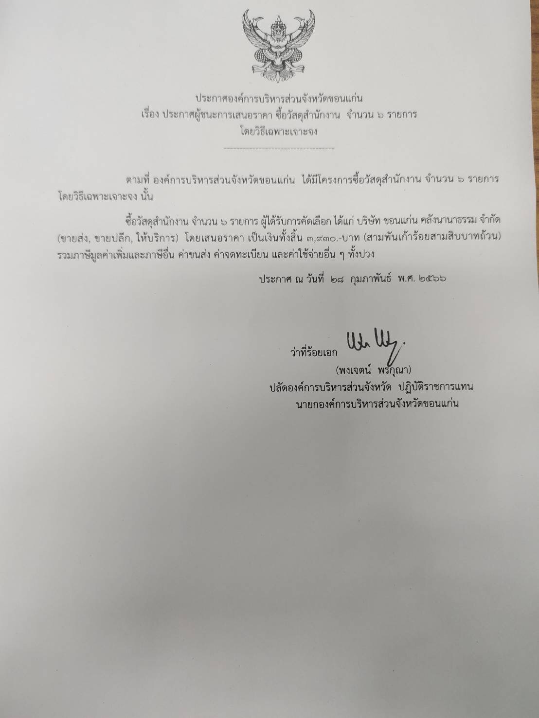 ประกาศผู้ชนะการเสนอราคาซื้อวัสดุสำนักงาน จำนวน 6 รายการ (3,930)