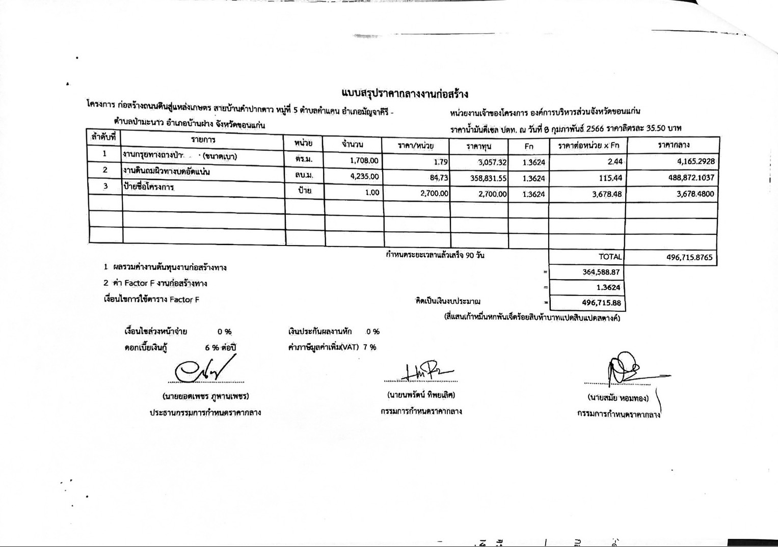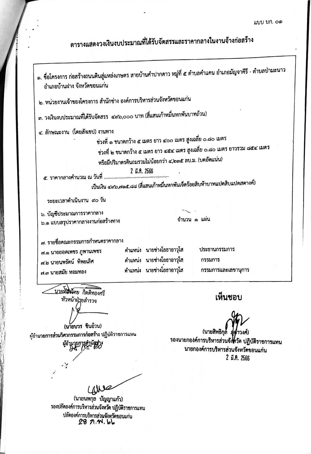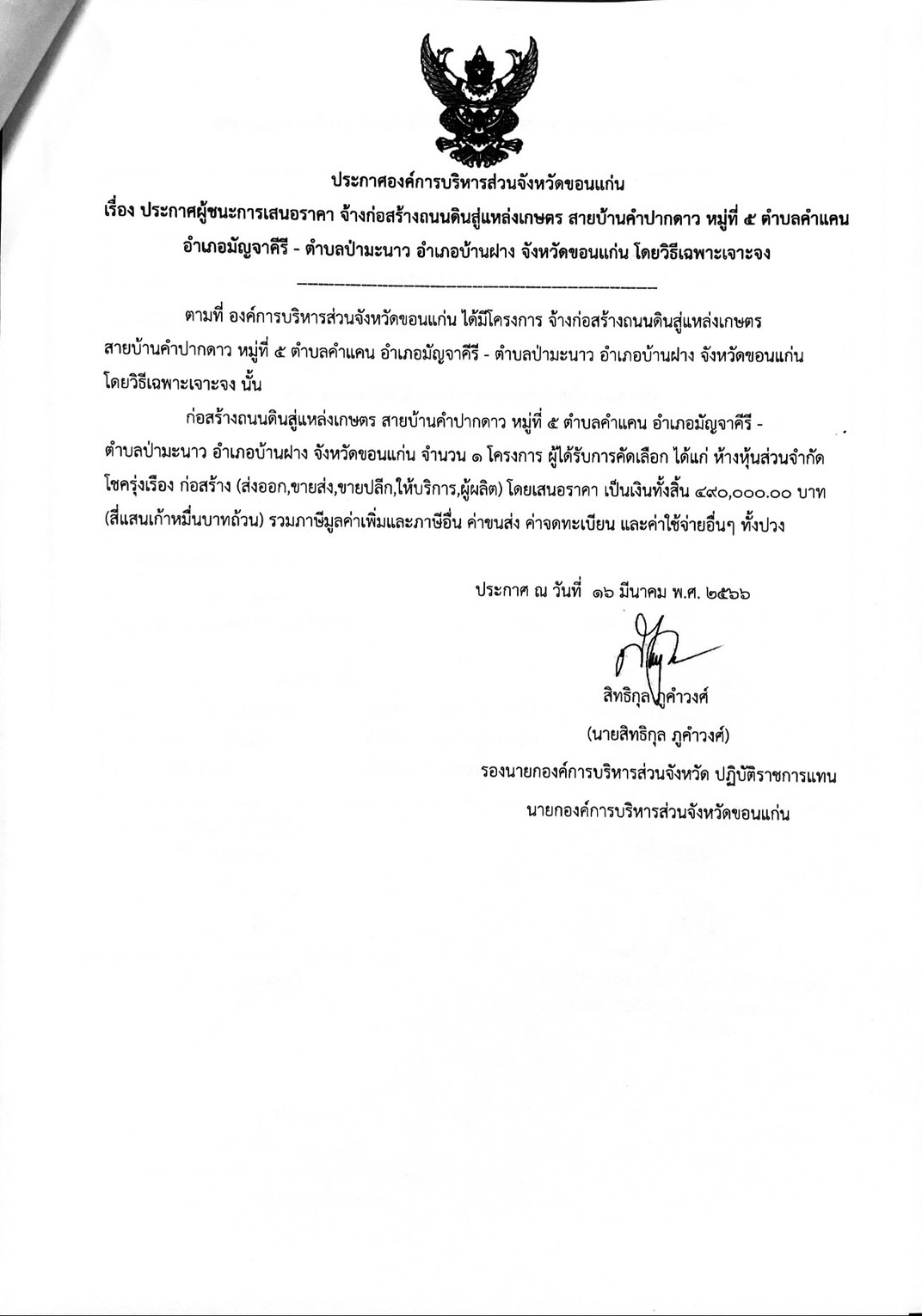 ประกาศผู้ชนะการเสนอราคาและราคากลางจ้างก่อสร้างถนนดินสู่แหล่งเกษตร สาย บ.คำปากดาว ม.5 ต.คำแคน อ.มัญจาคีรี-ต.ป่ามะนาว อ.บ้านฝาง จ.ขอนแก่น (490,000)