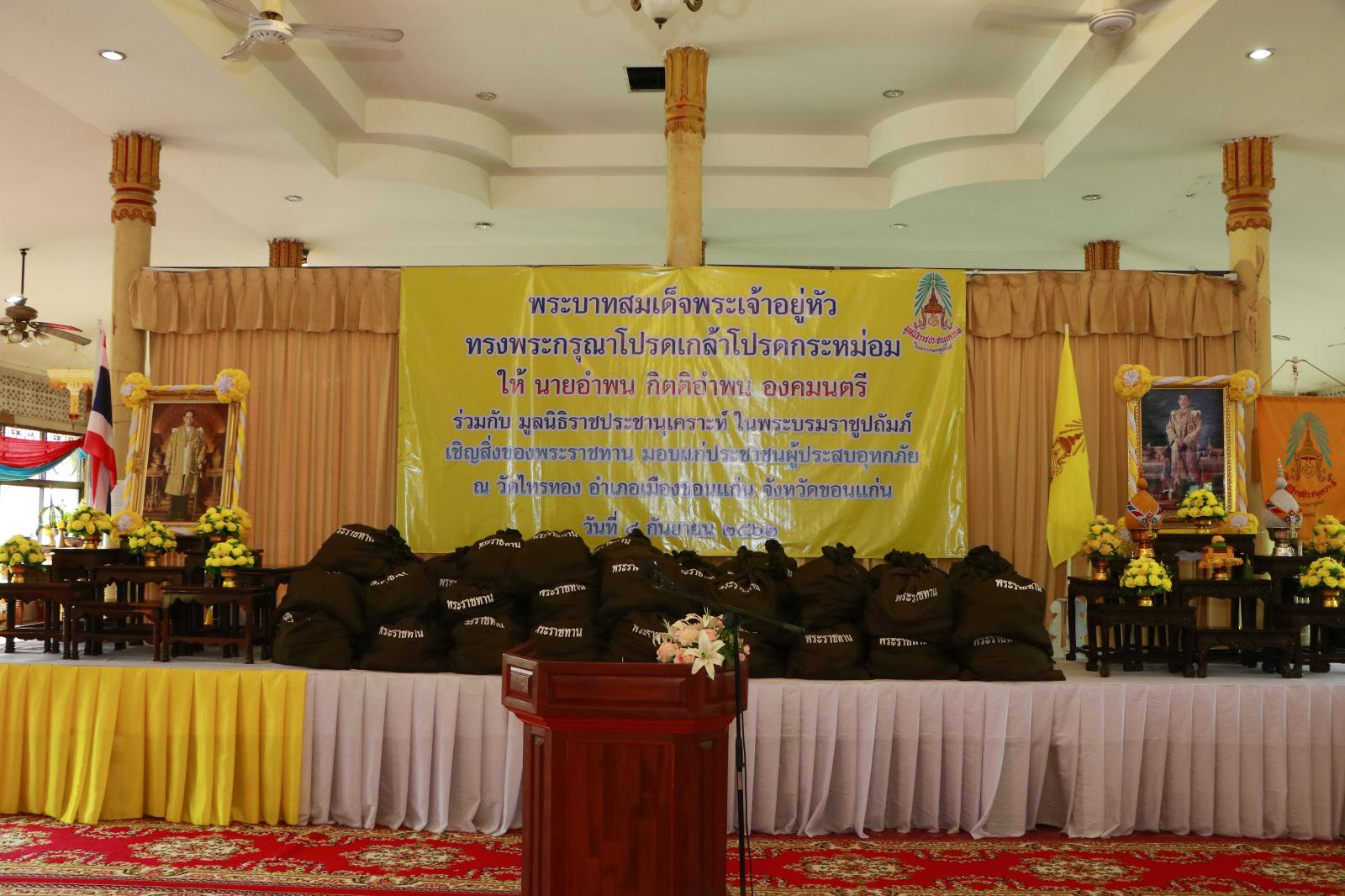 ในการนี้ ดร.พงษ์ศักดิ์ ตั้งวานิชกพงษ์ นายก อบจ.ขอนแก่น มอบหมายให้ นายสิทธิกุล ภูคำวงศ์ รองนายก อบจ.ขอนแก่น ร่วมมอบสิ่งของพระราชทานแก่ผู้ประสบอุทกภัย พื้นที่อำเภอบ้านไผ่ และอำเมืองขอนแก่น โดยมี นายอำพน กิตติอำพน องคมนตรี กล่าวถึงวัตถุประสงค์และเชิญพระราชกระแสรับสั่งของพระบาทสมเด็จพระเจ้าอยู่หัว ดร.สมศักดิ์ จังตระกุล ผู้ว่าราชการจังหวัดขอนแก่น และนายฉัตรชัย อุ่นเจริญ นายอำเภอเมืองขอนแก่น กล่าวสำนึกในพระมหากรุณาธิคุณ ทั้งนี้มีผู้แทนจากหน่วยงานภาครัฐ เอกชน และประชาชน เข้าร่วมพิธี ณ หอประชุมเทศบาลเมืองบ้านไผ่ อ.บ้านไผ่ และ วัดไทรทอง บ้านคำไฮ-หัวทุ่ง ต.บ้านเป็ด อ.เมืองขอนแก่น จ.ขอนแก่น