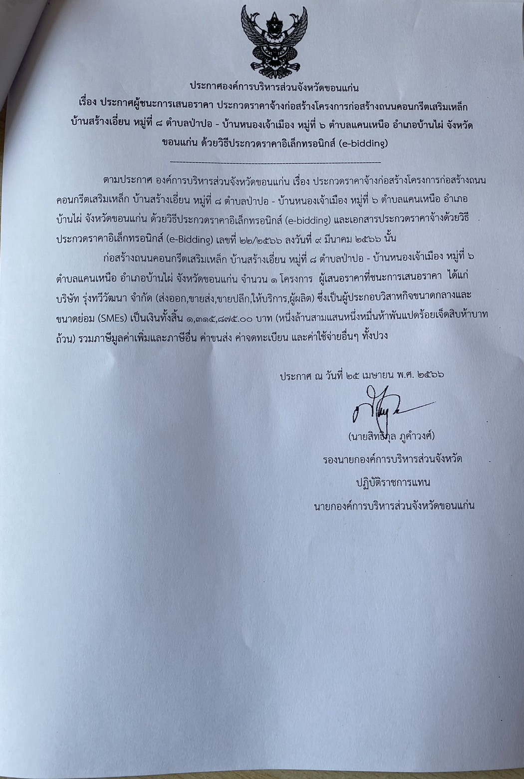 ประกาศผู้ชนะการเสนอราคาประกวดราคาจ้างก่อสร้างโครงการก่อสร้างถนน คสล. บ.สร้างเอี่ยน ม.8 ต.ป่าปอ-บ.หนองเจ้าเมือง ม.6 ต.แคนเหนือ อ.บ้านไผ่ ฯ (e-bidding)(1,315,875)