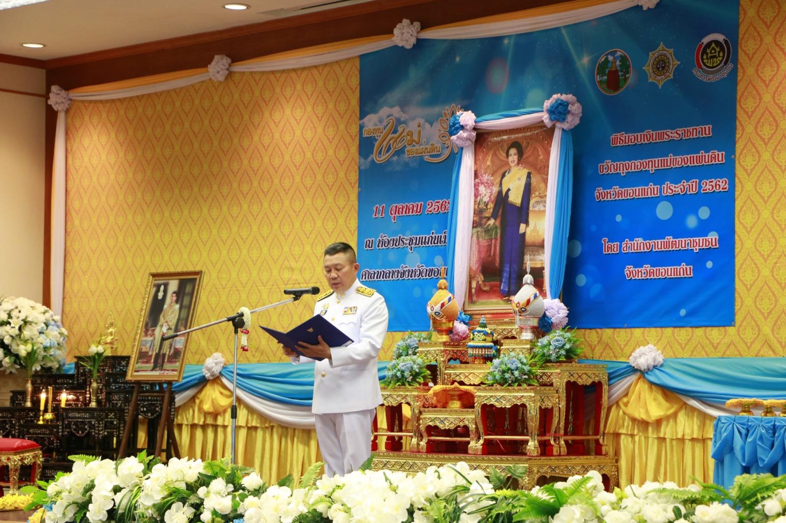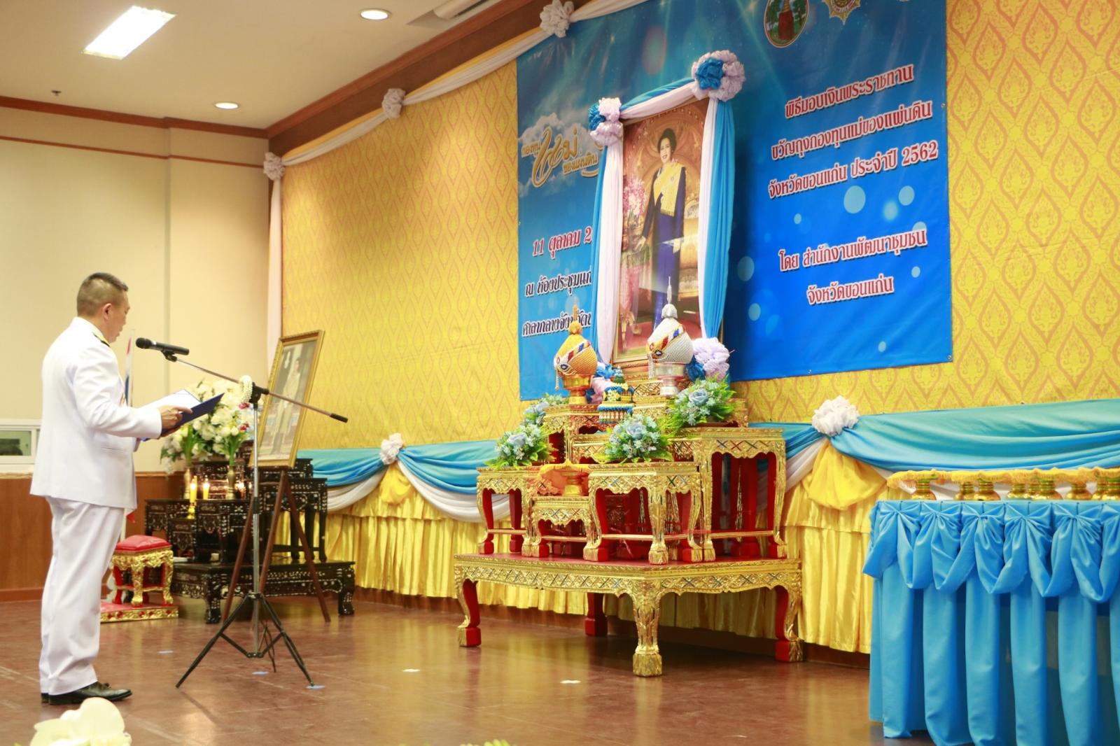 เมื่อวันที่ 11 ต.ค. 62 เวลา 09.30 น. ดร.พงษ์ศักดิ์ ตั้งวานิชกพงษ์ ได้มอบหมายให้ นางพัฒนาวดี วิริยปิยะ ปลัด อบจ.ขอนแก่น เข้าเป็นเกียรติในพิธีมอบเงินพระราชทานขวัญถุงกองทุนแม่ของแผ่นดิน ระดับจังหวัดขอนแก่น ประจำปี 2562 โดยมี ดร.สมศักดิ์ จังตระกุล ผู้ว่าราชการจังหวัดขอนแก่น เป็นประธานในพิธี ทั้งนี้มีเจ้าหน้าที่พัฒนาชุมชน องค์กรภาครัฐ เครือข่ายกองทุนแม่ของแผ่นดิน เข้าร่วมในพิธี ณ ห้องประชุมแก่นเมือง ศาลากลางจังหวัดขอนแก่น