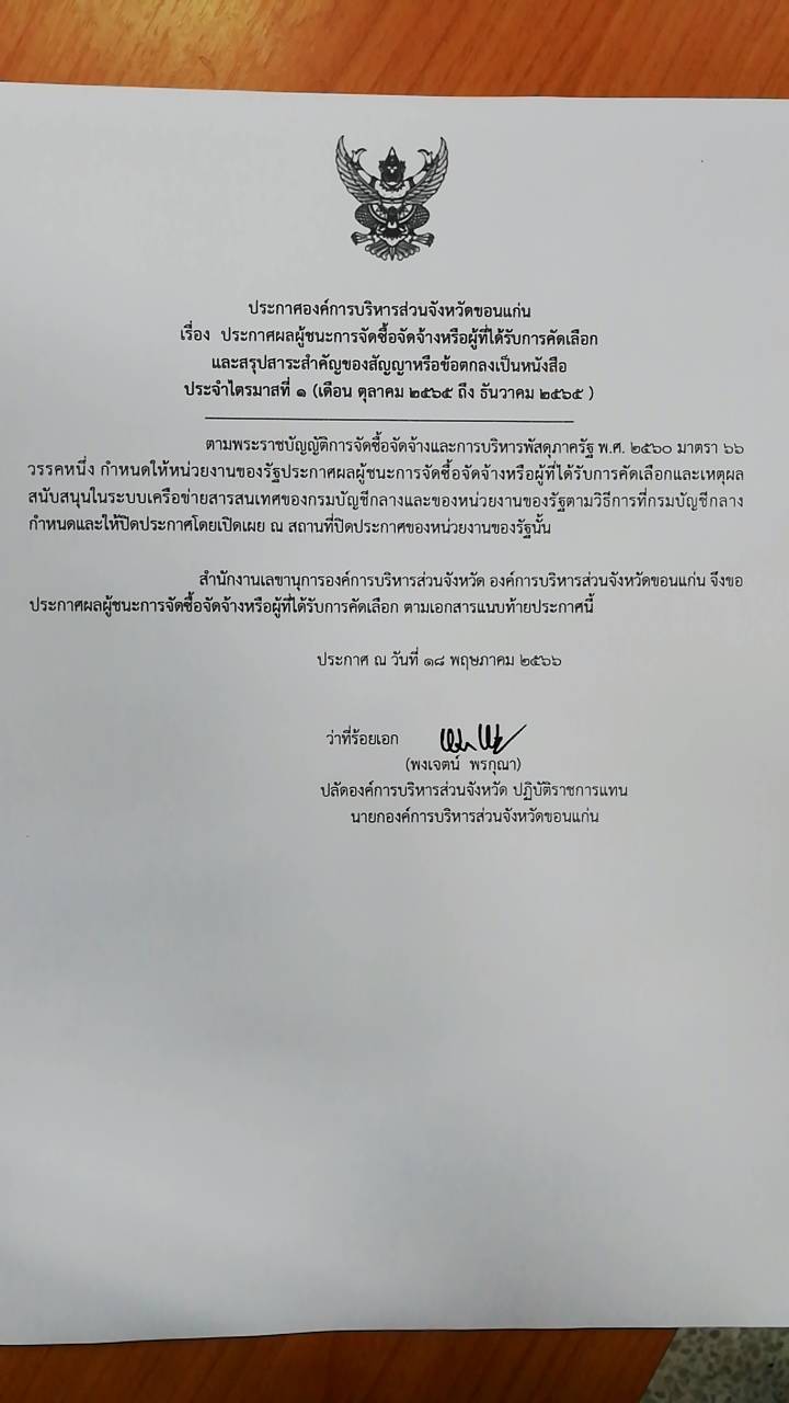 ประกาศผลผู้ชนะการจัดซื้อจัดจ้างหรือผู้ที่ได้รับการคัดเลือกและสรุปสาระสำคัญของสัญญาหรือข้อตกลงเป็นหนังสือประจำไตรมาสที่ 1 (เดือน ต.ค.2565 ถึง ธ.ค.2565)
