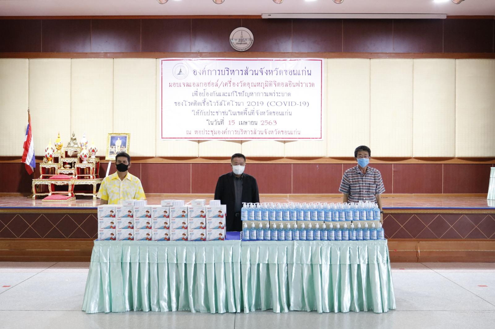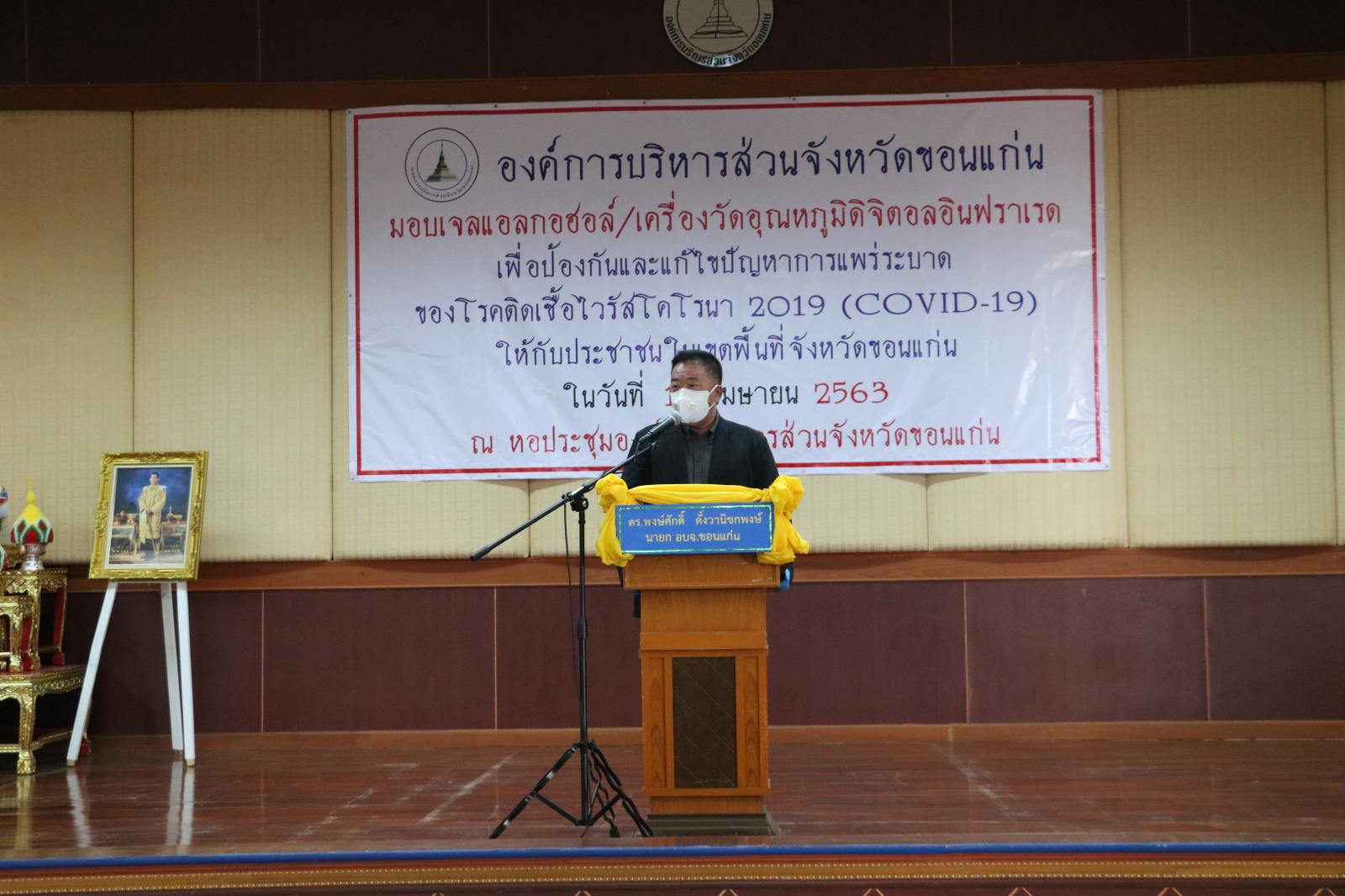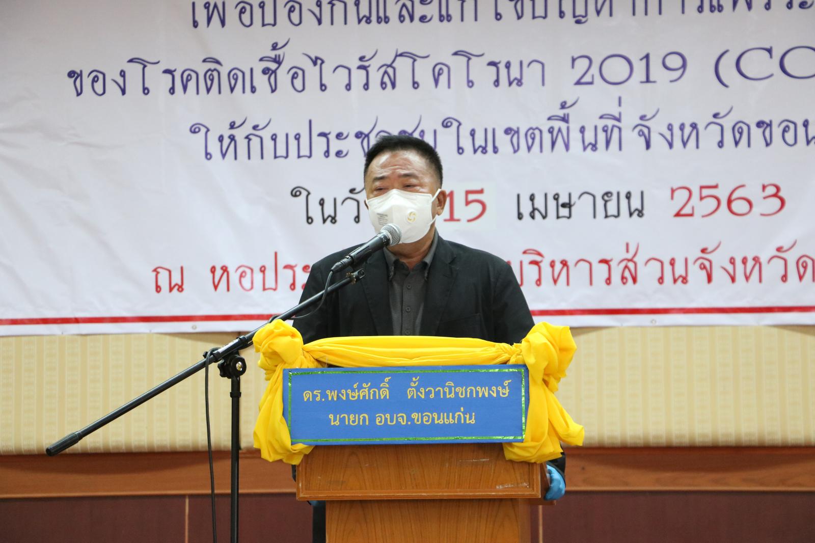 เมื่อวันที่ 15 เมษายน 2563 เวลา 13.30 น. ดร.พงษ์ศักดิ์ ตั้งวานิชกพงษ์ นายก อบจ.ขอนแก่น เป็นประธานในการมอบเจลล้างมือแอลกอฮอล์ เครื่องวัดอุณหภูมิดิจิตอลอินฟาเรด และแผ่นพับประชาสัมพันธ์ ตามโครงการป้องกันและควบคุมการแพร่ระบาดของโรคติดเชื้อไวรัสโคโรนา 2019 โดยมี นายสิทธิกุล ภูคำวงศ์ รองนายก อบจ.ขอนแก่น, ดร.สุชาติ ไตรองค์ถาวร ประธานสภา อบจ.ขอนแก่น, นายอำเภอ และผู้แทนนายอำเภอทั้ง 26 อำเภอ, สมาชิกสภา อบจ.ขอนแก่น, นางพัฒนาวดี วิริยปิยะ ปลัดอบจ.ขอนแก่น คณะผู้บริหาร หัวหน้าส่วนราชการ อบจ.ขอนแก่น เข้าร่วมเป็นเกียรติ ณ หอประชุมองค์การบริหารส่วนจังหวัดขอนแก่น อ.เมืองขอนแก่น จ.ขอนแก่น
