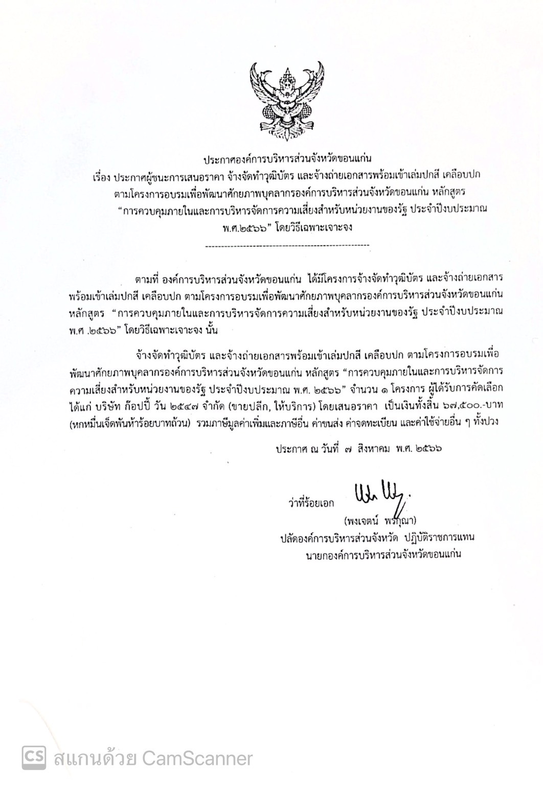 ประกาศผู้ชนะการเสนอราคาจ้างจัดทำวุฒิบัตร และจ้างถ่ายเอกสารพร้อมเข้าเล่มปกสี เคลือบปกตามโครงการอบรมเพื่อพัฒนาศักยภาพบุคลากรองค์การบริหารส่วนจังหวัดขอนแก่น ฯ (67,500)