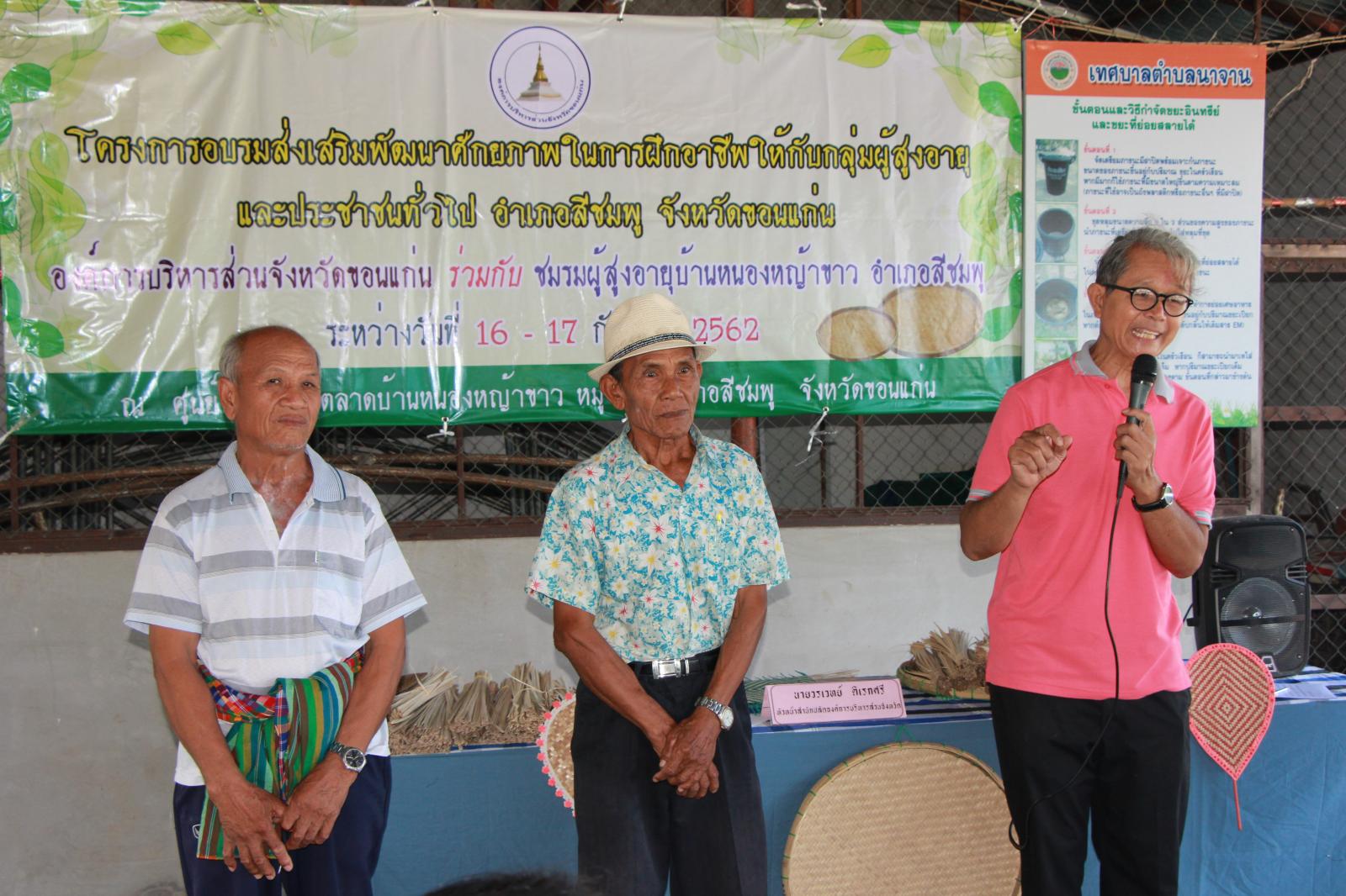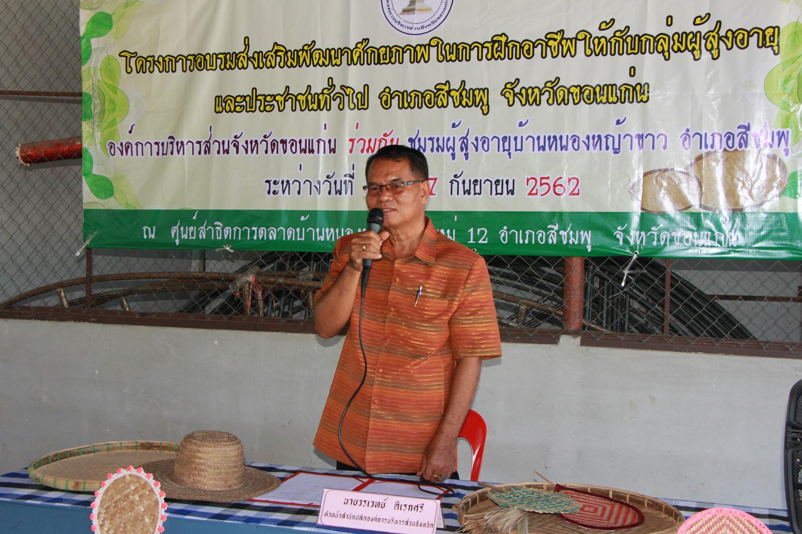 เมื่อวันที่ 16 กันยายน 2562 เวลา 10.00 น. ดร.พงษ์ศักดิ์ ตั้งวานิชกพงษ์ นายก อบจ.ขอนแก่น มอบหมายให้ นายวรเวทย์ ดิเรกศรี หัวหน้าสำนักปลัด อบจ.ขอนแก่น ประธานพิธีเปิดโครงการอบรมส่งเสริมพัฒนาศักยภาพในการฝึกอาชีพให้กับกลุ่มผู้สูงอายุและประชาชนทั่วไป อำเภอสีชมพู จังหวัดขอนแก่น โดยมี นายสามารถ ทองภู ประธานชมรมผู้สูงอายุบ้านหนองหญ้าขาว หมู่12 กล่าวรายงาน ณ ศูนย์สาธิตการตลาดบ้านหนองหญ้าขาว หมู่12 อ.สีชมพู จ.ขอนแก่น