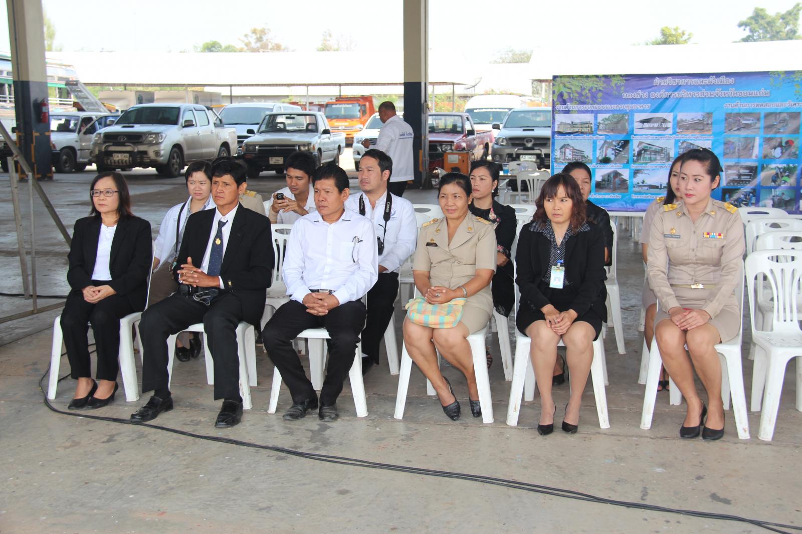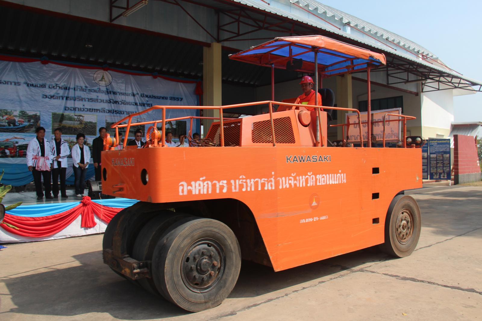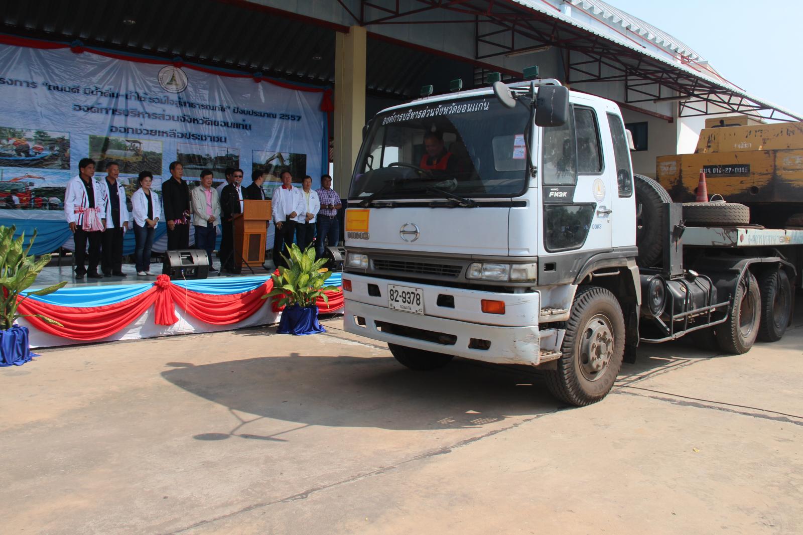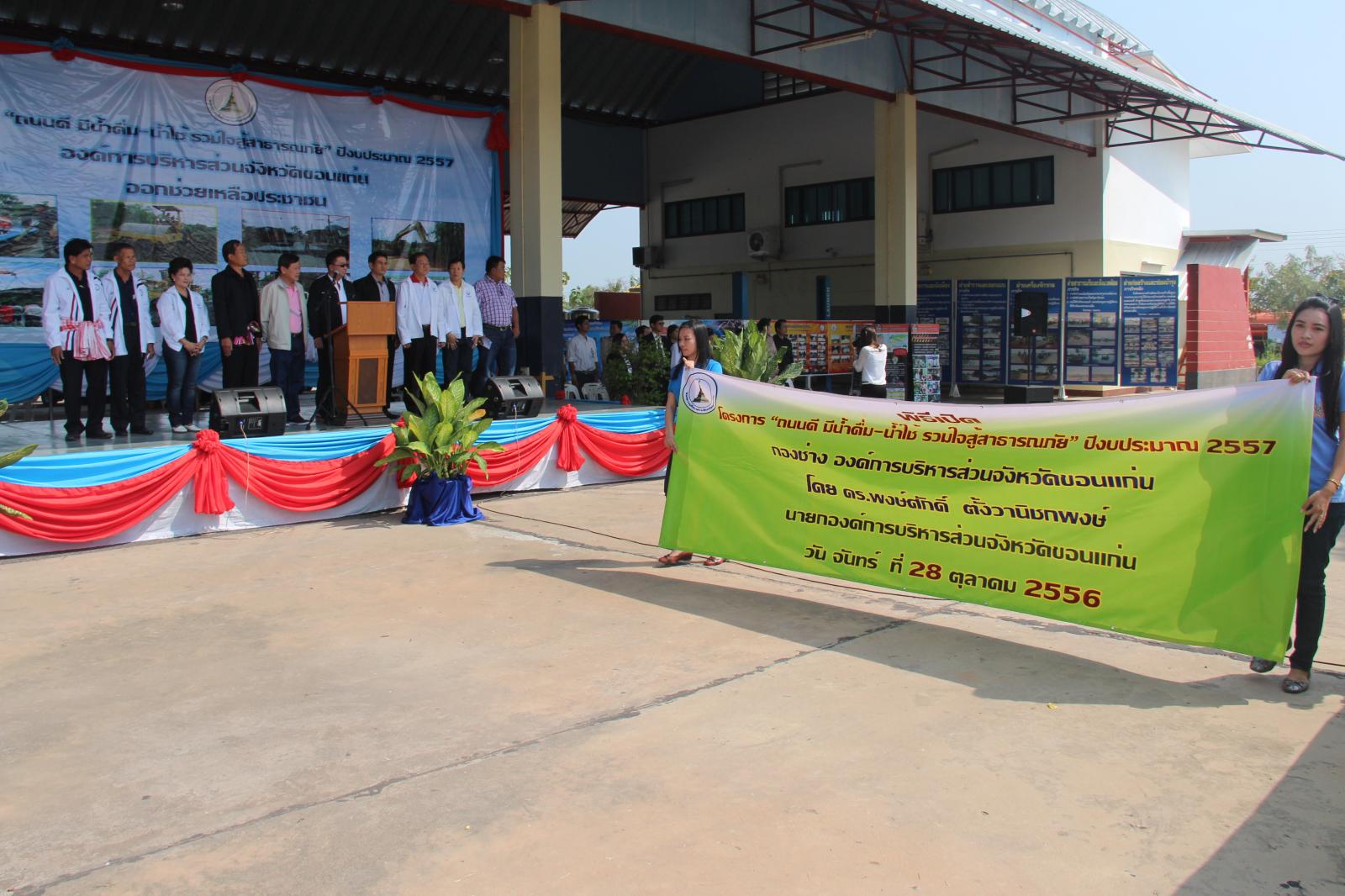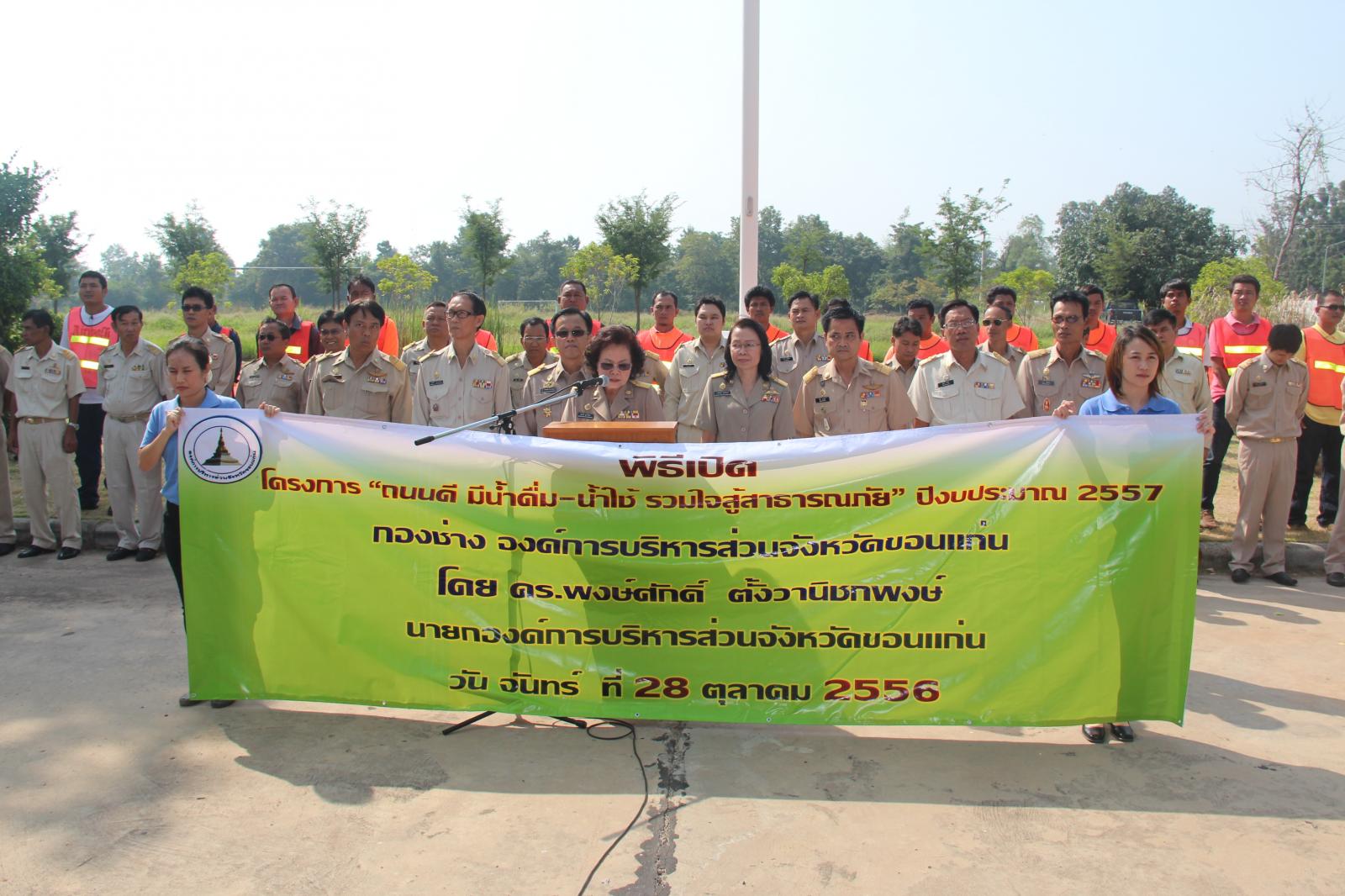 กองช่าง อบจ.ขอนแก่นได้จัดส่งเครื่องจักรกล พร้อมเจ้าหน้าที่ออกปฎิบัติงานตามโครงการ “ถนนดี มีน้ำดื่ม-น้ำใช้ รวมใจสู้สาธารณภัย” ประจำปีงบประมาณ 2557 ในวันที่ 28 ตุลาคม 2556 โดยได้รับเกียรติจาก ดร.พงษ์ศักดิ์ ตั้งวานิชกพงษ์ นายกองค์การบริหารส่วนจังหวัดขอนแก่น เป็นประธานในพิธีเปิดโครงการ ณ ศูนย์เครื่องจักรกล กองช่าง อบจ.ขอนแก่น โดยมีเป้าหมายและชุดเครื่องจักรกลดังนี้ ชุดปรับเกรดผิวจราจรลูกรัง ชุดซ่อมปะ ผิวจราจรลาดยาง ชุดปฏิบัติการเครื่องสูบน้ำ ชุดพัฒนาบ่อบาดาล ชุดแจกจ่ายน้ำอุปโภค-บริโภค ชุดซ่อมถนนที่ชำรุดจากอุทกภัยและชุดพัฒนาสิ่งแวดล้อม โดยมีเป้าหมายดังนี้ ปรับเกรดผิวจราจรลูกรัง และซ่อมแซมผิวจราจรถนนลาดยางในเขตพื้นที่ 26 อำเภอ, สนับสนุนเครื่องสูบน้ำช่วยเหลือพื้นที่ ประสบภัยแล้งหรืออุทกภัย, ปรับปรุงพัฒนาบ่อบาดาล, แจกจ่ายน้ำเพื่ออุปโภค-บริโภค, ซ่อมแซมถนน คอสะพาน ท่อระบายน้ำที่ชำรุดหรือถูกน้ำกัดเซาะ, เสริมสร้างมาตราการความปลอดภัยทางถนน ให้มีความปลอดภัยแก่ผู้ใช้ถนน ระยะเวลาดำเนินโครงการระหว่างวันที่ 1 พ.ย. 56 ถึงวันที่ 30 ก.ย. 57