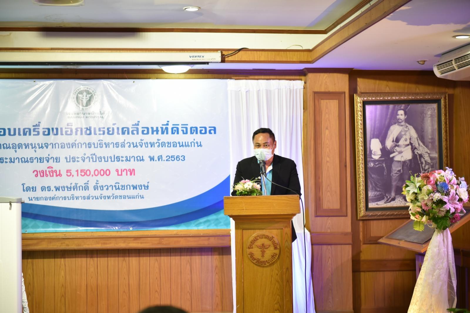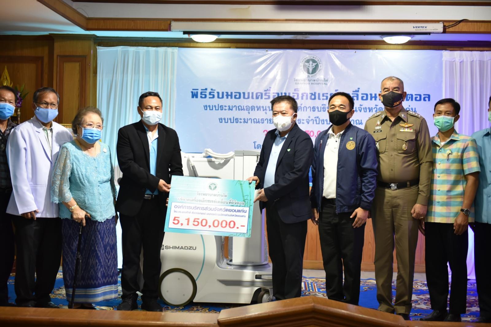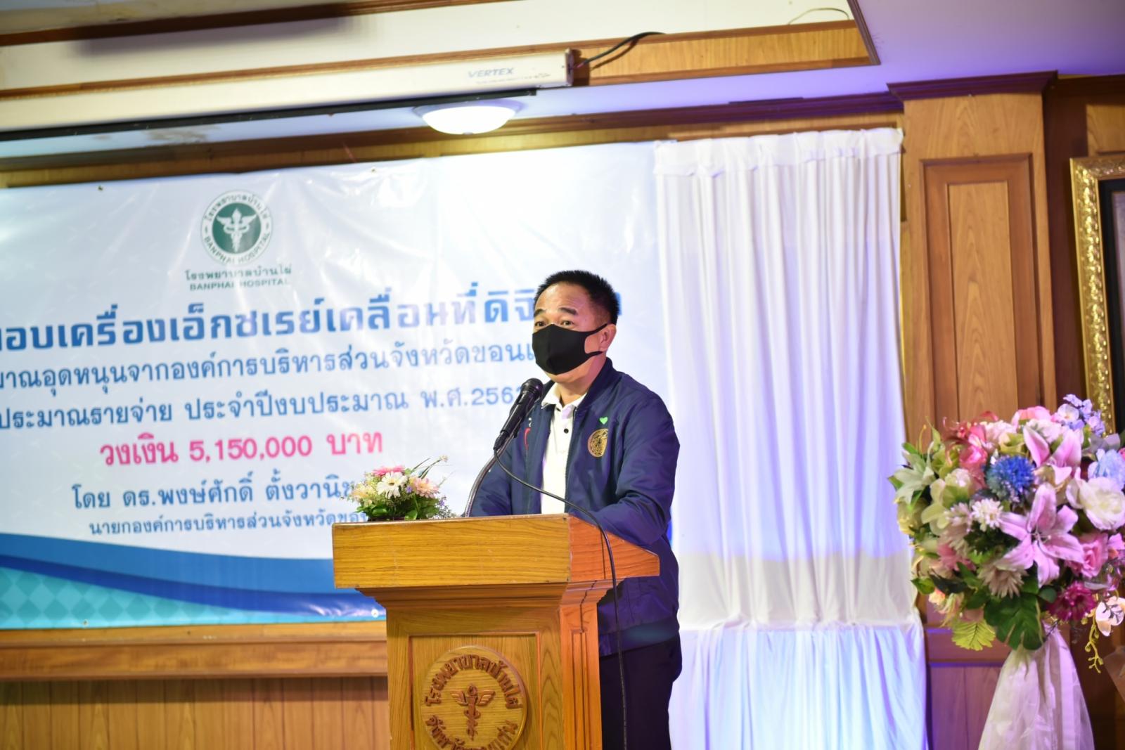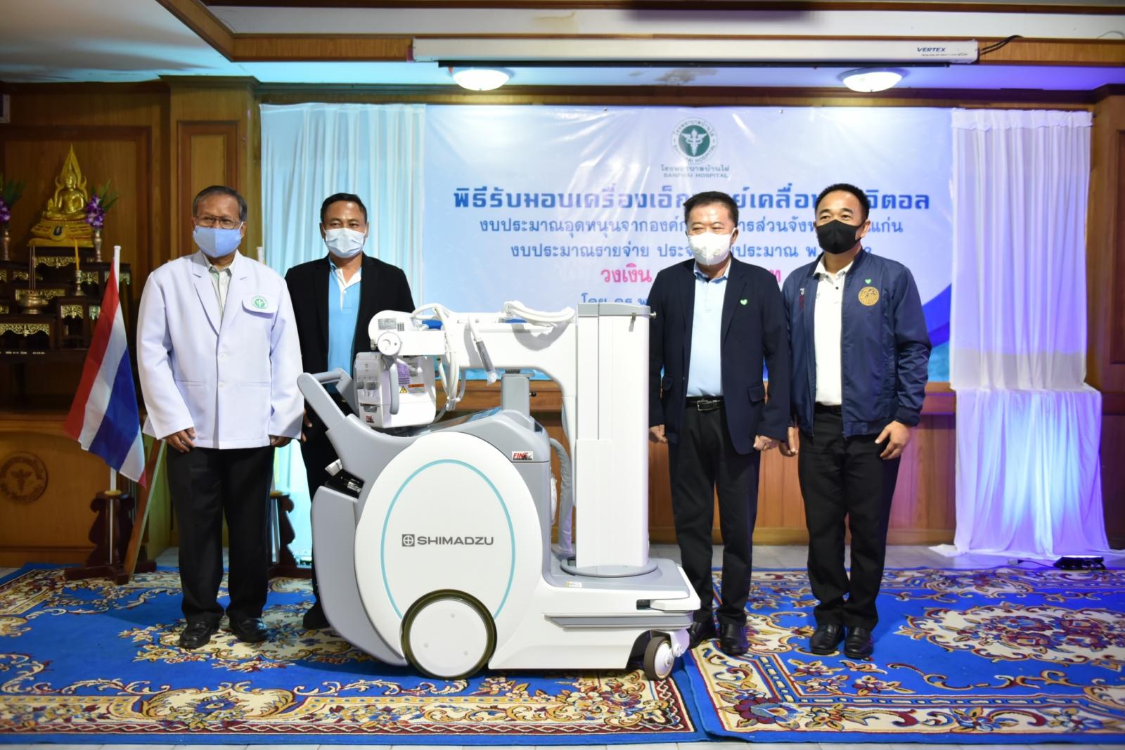 วันที่ 11 สิงหาคม 2563 เวลา 14.00 น. ดร.พงษ์ศักดิ์ ตั้งวานิชกพงษ์ นายกองค์การบริหารส่วนจังหวัดขอนแก่น เป็นประธานในพิธีส่งมอบครุภัณฑ์ทางการแพทย์ เครื่องเอ็กซเรย์เคลื่อนที่ดิจิตอล พร้อมแผ่นรับภาพแบบดิจิตอล จำนวน 1 เครื่อง ให้กับโรงพยาบาลบ้านไผ่ โดยมี นายแพทย์อดุลย์ บำรุง ผู้อำนวยการโรงพยาบาลบ้านไผ่ พร้อมด้วย คณะแพทย์ พยาบาล และเจ้าหน้าที่ รับมอบ ในโอกาสนี้มี นายรุจน์ รังษี นายอำเภอบ้านไผ่ นายองอาจ ฉัตรชัยพลรัตน์ โฆษกประจำรัฐมนตรีว่าการกระทรวงคมนาคม ร่วมเป็นเกียรติ ณ ห้องประชุมไพจิตร ปวะบุตร โรงพยาบาลบ้านไผ่ อำเภอบ้านไผ่ จังหวัดขอนแก่น