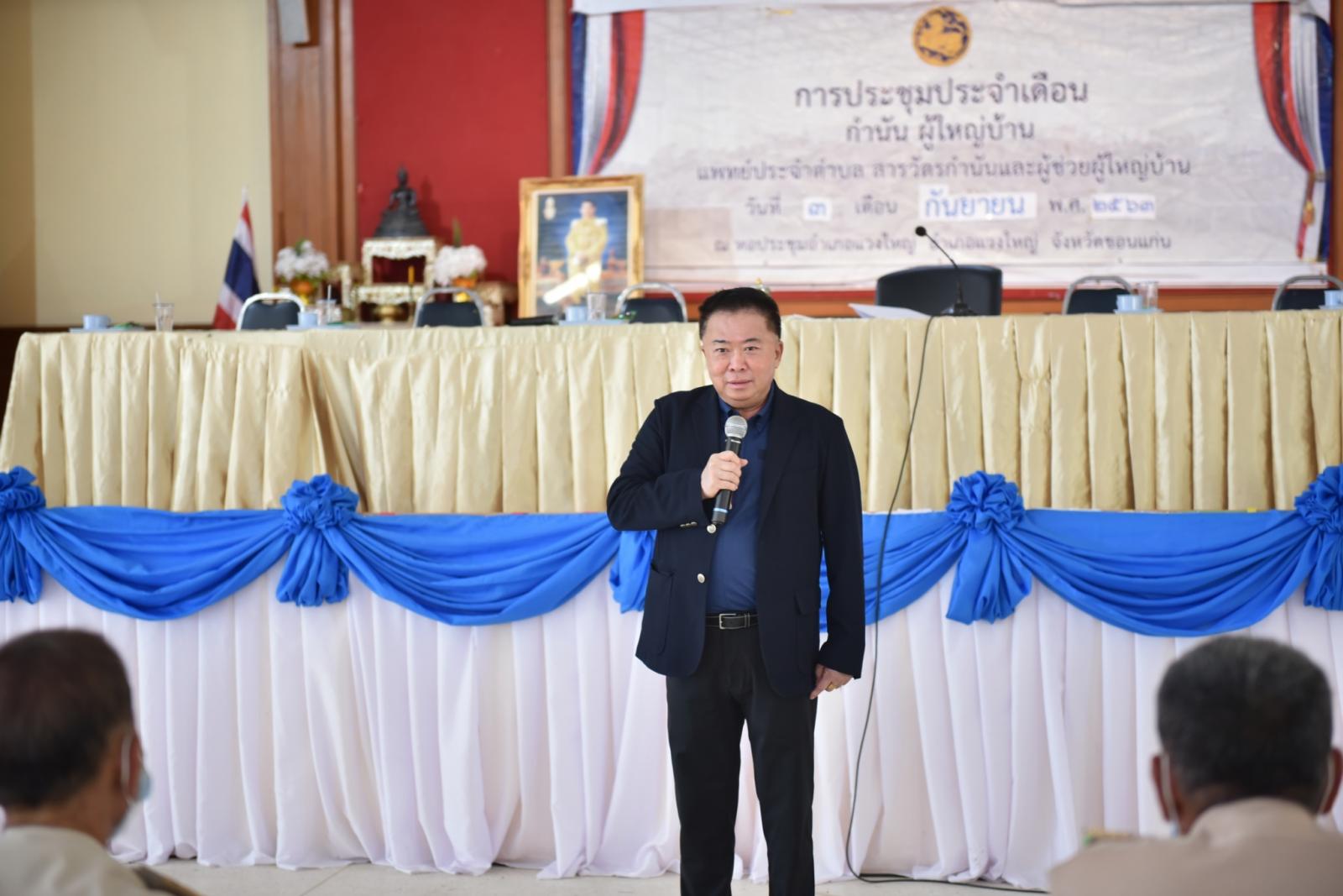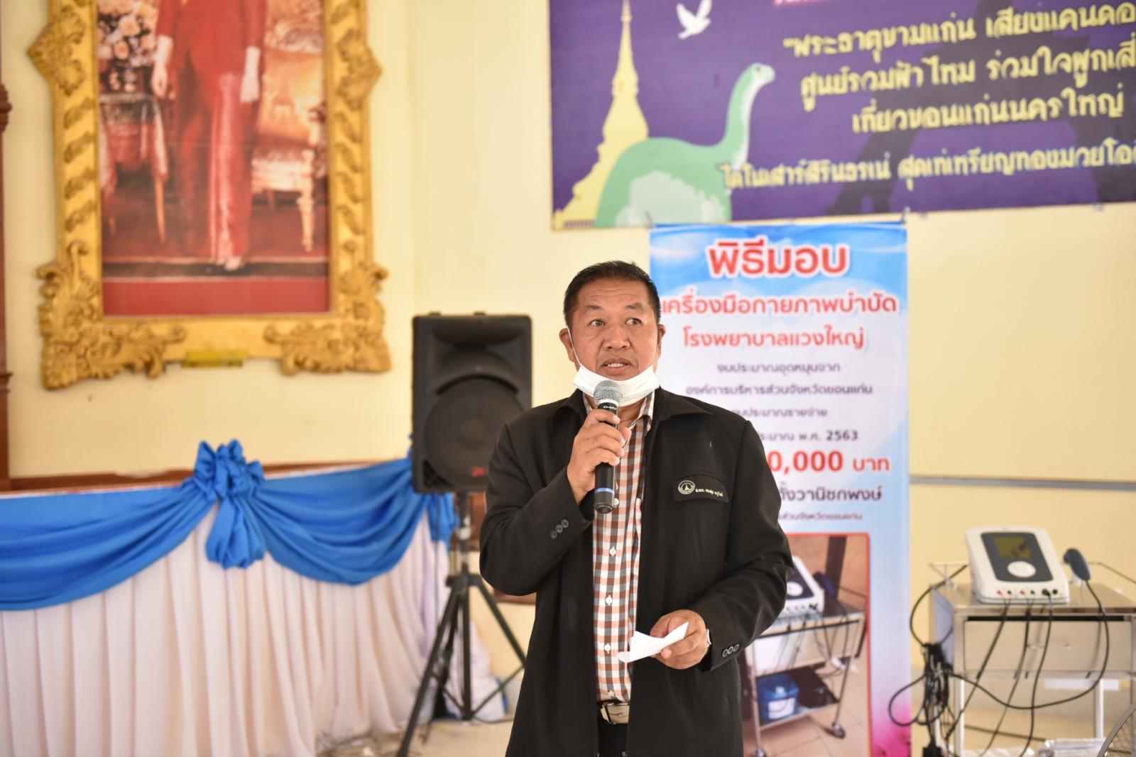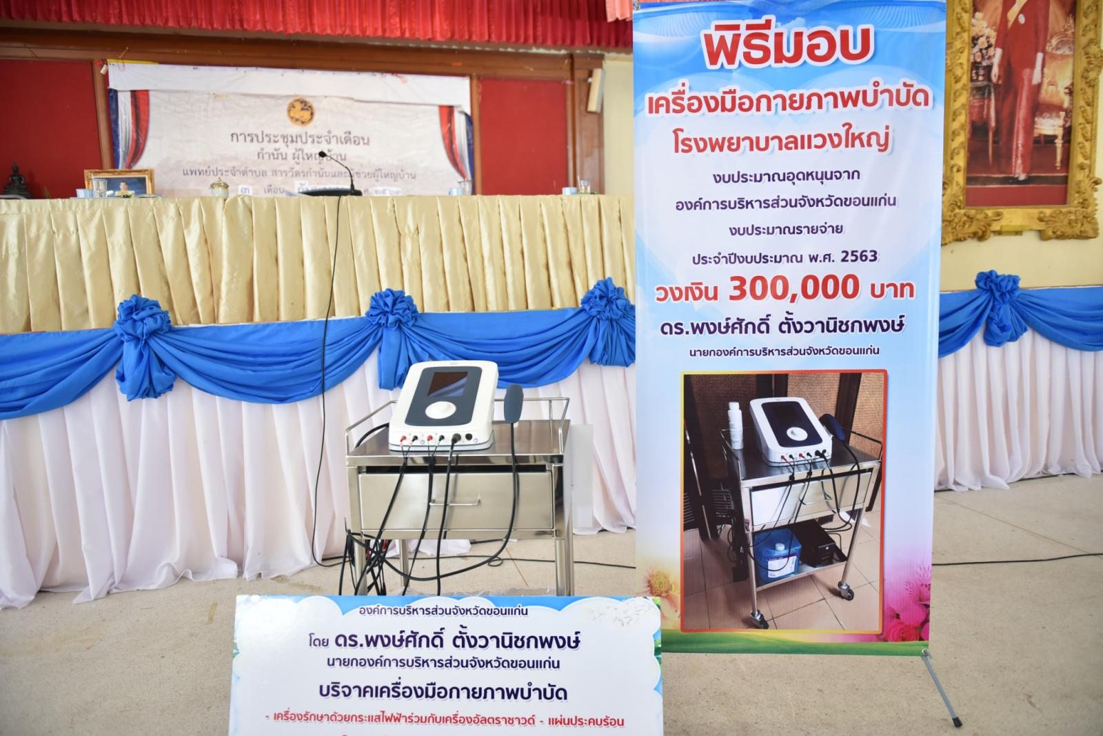 วันที่ 3 กันยายน 2563 เวลา 09.00 น. ดร.พงษ์ศักดิ์ ตั้งวานิชกพงษ์ นายกองค์การบริหารส่วนจังหวัดขอนแก่น เป็นประธานในพิธีส่งมอบเครื่องมือกายภาพบำบัด ให้แก่โรงพยาบาลแวงใหญ่ และร่วมพบปะกำนัน ผู้ใหญ่บ้าน ผู้ช่วยผู้ใหญ่บ้าน สารวัตรกำนัน และแพทย์ประจำตำบล ในการประชุมประจำเดือนกำนันผู้ใหญ่บ้านฯ โดยมี นายทองสุข ธนูรัตน์ สมาชิกสภาอบจ.ขอนแก่น เขต อ.แวงใหญ่ กล่าวต้อนรับ ในโอกาสนี้มี นายปรัตถกร บุสาวรรณกร นายอำเภอแวงใหญ่ นายแพทย์สารสิน กิตติโพวานนท์ ผู้อำนวยการโรงพยาบาลแวงใหญ่ คณะพยาบาล เจ้าหน้าที่รพ.แวงใหญ่ ร่วมในพิธี ณ หอประชุมที่ว่าการอำเภอแวงใหญ่ จังหวัดขอนแก่น