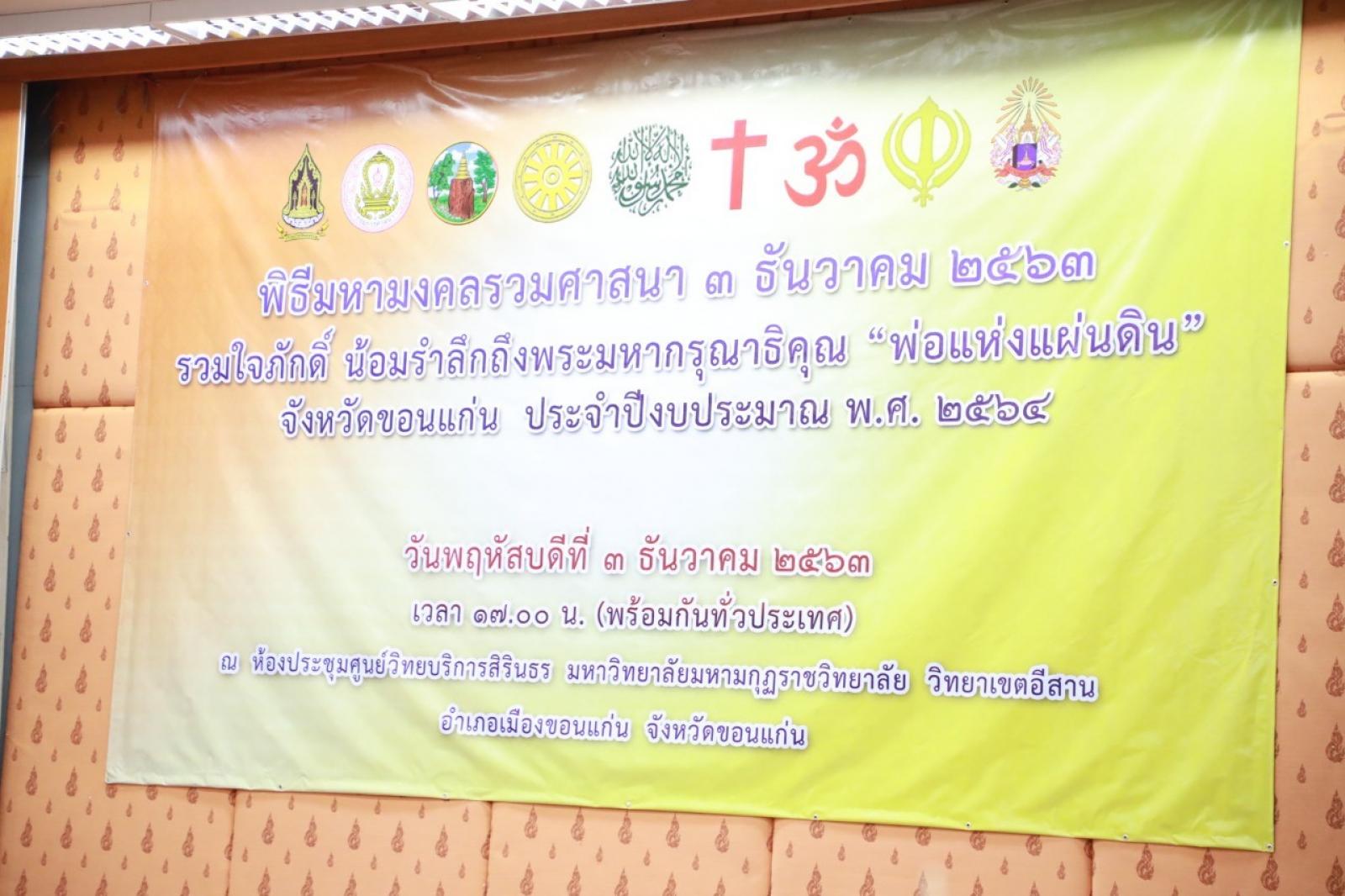 วันที่ 3 ธันวาคม 2563 เวลา 17.00 น. นางพัฒนาวดี วิริยปิยะ ปลัดองค์การบริหารส่วนจังหวัด ปฏิบัติหน้าที่นายกองค์การบริหารส่วนจังหวัดขอนแก่น มอบหมายให้ นายนำศิลป์ วิเศษ ผอ.สำนักการศึกษาฯ รักษาการรองปลัด อบจ.ขก เข้าร่วมพิธีมหามงคลรวมศาสนา 3 ธันวาคม 2563 รวมใจภักดิ์ น้อมรำลึกถึงพระมหากรุณาธิคุณ "พ่อแห่งแผ่นดิน" โดยมีนายจารึก เหล่าประเสริฐ รองผู้ว่าราชการจังหวัดขอนแก่น เป็นประธาน ณ ห้องประชุมอาคารศูนย์วิทยบริการสิรินธรมหาวิทยาลัยมหามกุฏราชวิทยาลัย วิทยาเขตอีสาน อำเภอเมืองขอนแก่น จังหวัดขอนแก่น