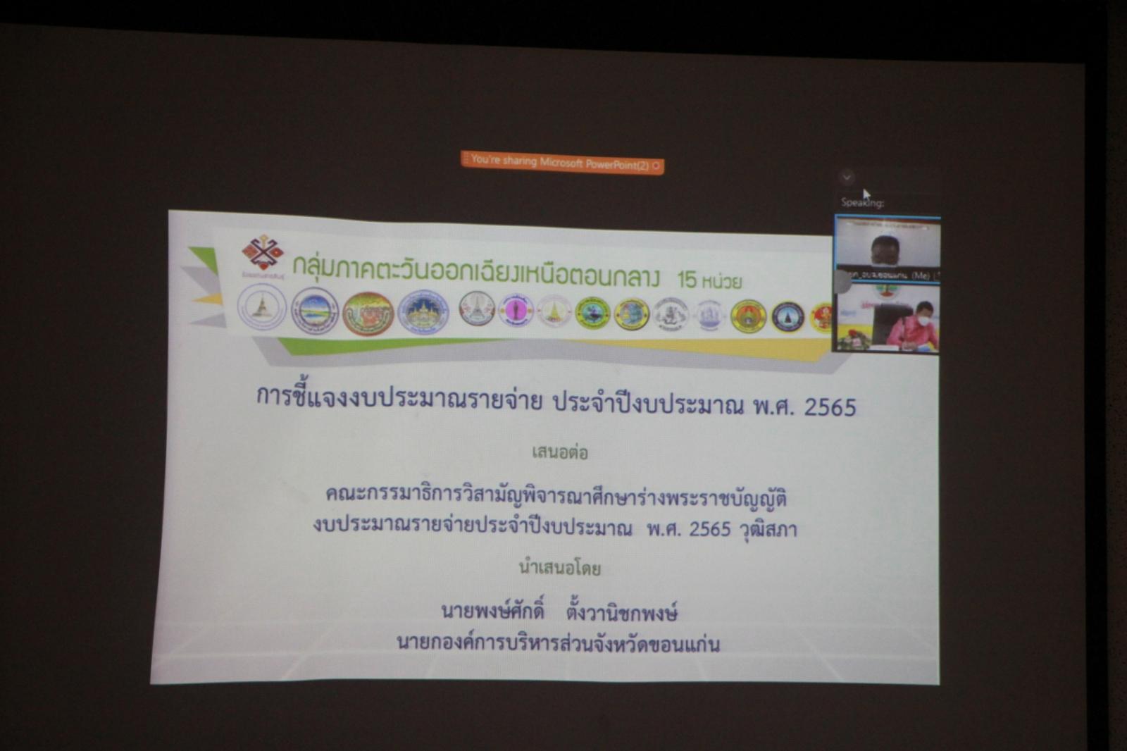 ในวันที่ 3 สิงหาคม 2564 เวลา 09.00 น. ดร.พงษ์ศักดิ์ ตั้งวานิชกพงษ์ นายก อบจ.ขอนแก่น พร้อมด้วย นายสิทธิกุล ภูคำวงศ์ รองนายก อบจ.ขอนแก่น, นายเพ็ชร มูลป้อม ผอ.กองยุทธศาสตร์และงบประมาณ ร่วมประชุมการชี้แจงงบประมาณรายจ่าย ประจำปีงบประมาณ พ.ศ.2565 เสนอต่อ คณะกรรมาธิการวิสามัญพิจารณาศึกษาร่างพระราชบัญญัติ งบประมาณรายจ่ายประจำปีงบประมาณ พ.ศ.2565 วุฒิสภา (กลุ่มภาคตะวันออกเฉียงเหนือตอนกลาง 15 หน่วย โดยการประชุมผ่านสื่ออิเล็กทรอนิกส์ ด้วยโปรแกรม Zoom Meeting ณ ห้องประชุมชั้น 2 องค์การบริหารส่วนจังหวัดขอนแก่น