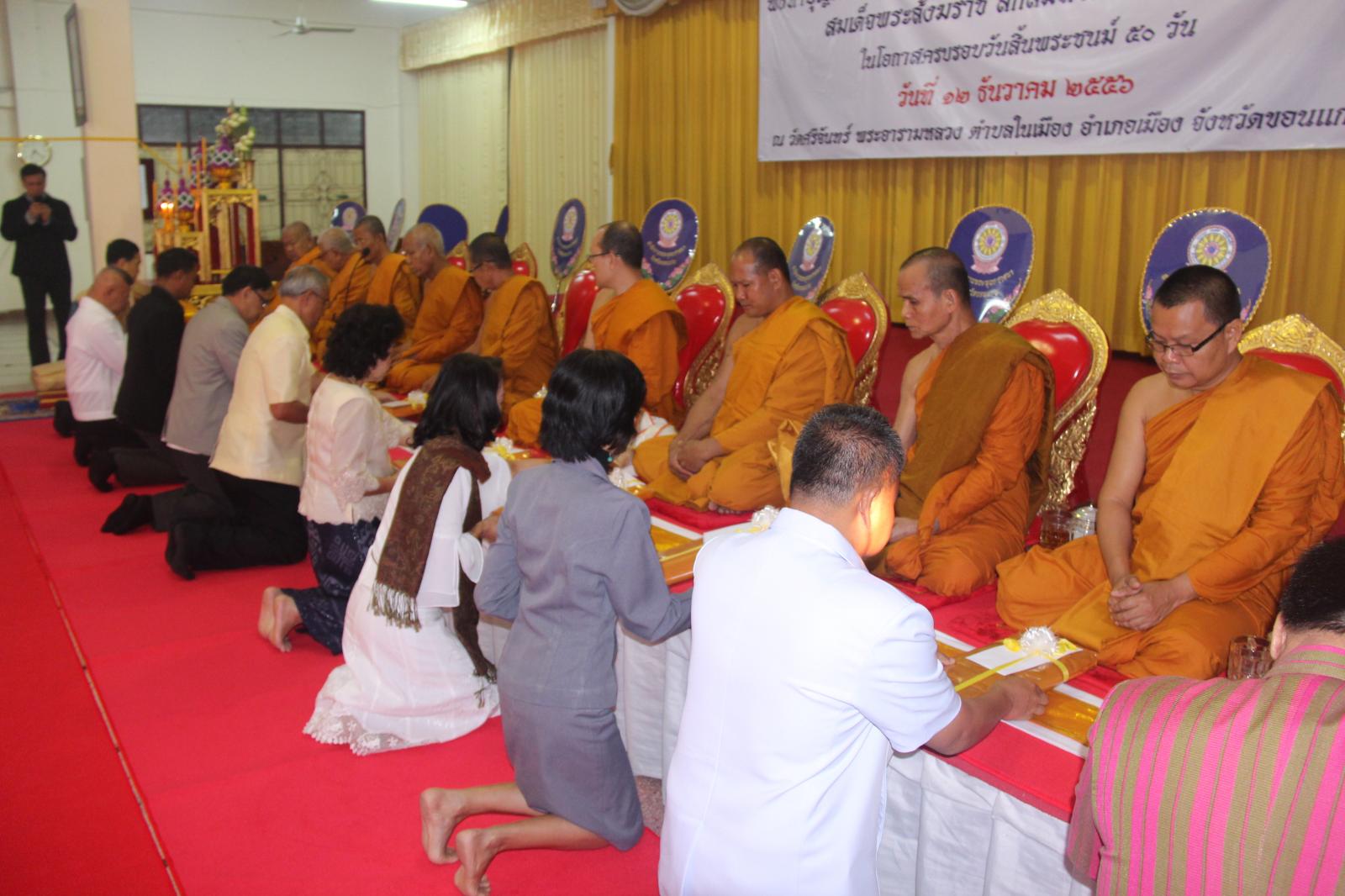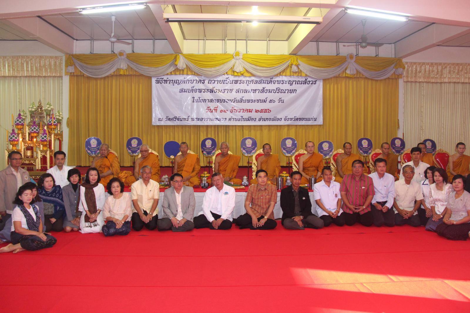 เมื่อเวลา 07.00 น.วันที่ 12 ธันวาคม 2556 นายกองค์การบริหารส่วนจังหวัดขอนแก่น ดร.พงษ์ศักดิ์ ตั้งวานิชกพงษ์ ได้มอบหมายให้ ปลัดองค์การบริหารส่วนจังหวัดขอนแก่น นางสุมาลี ฐานวิเศษ เข้าร่วมพิธีทำบุญตักบาตร ถวายเป็นพระกุศลสมเด็จพระญาณสังวร สมเด็จพระสังฆราช สกลมหาสังฆปริณายก ในโอกาสครบรอบวันสิ้นพระชนม์ 50 วัน โดยมี นายวินัย สิทธิมณฑล รองผู้ว่าราชการจังหวัดขอนแก่น เป็นประธานในพิธี ณ วัดศรีจันทร์ พระอารามหลวง ตำบลในเมือง อำเภอเมือง จังหวัดขอนแก่น