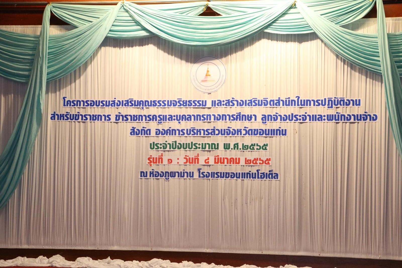 เมื่อวันที่ 8 มีนาคม 2565 เวลา 09.00 น. ดร.พงษ์ศักดิ์ ตั้งวานิชกพงษ์ นายก อบจ.ขอนแก่น มอบหมายให้ นายธาดา พรหมสาขา ณ สกลนคร รองนายก อบจ.ขอนแก่น เป็นประธาน “เมื่อวันที่ 8 มีนาคม 2565 เวลา 09.00 น. ดร.พงษ์ศักดิ์ ตั้งวานิชกพงษ์ นายก อบจ.ขอนแก่น มอบหมายให้ นายธาดา พรหมสาขา ณ สกลนคร รองนายก อบจ.ขอนแก่น เป็นประธาน “โครงการอบรมส่งเสริมคุณธรรม จริยธรรม และสร้างเสริมจิตสำนึก ในการปฏิบัติงานสำหรับข้าราชการ ข้าราชการครู และบุคลากรทางการศึกษา ลูกจ้างประจำและพนักงานจ้าง สังกัดองค์การบริหารส่วนจังหวัดขอนแก่น ประจำปีงบประมาณ พ.ศ.2565” โดยมี นายสุวนัย ภูมาศ ผู้อำนวยการกองการเจ้าหน้าที่ กล่าวรายงาน พร้อมด้วยข้าราชการ พนักงาน สังกัดองค์การบริหารส่วนจังหวัดขอนแก่น เข้าร่วมอบรม ณ ห้องภูผาม่าน โรงแรมขอนแก่นโฮเต็ล อ.เมืองขอนแก่น จ.ขอนแก่น