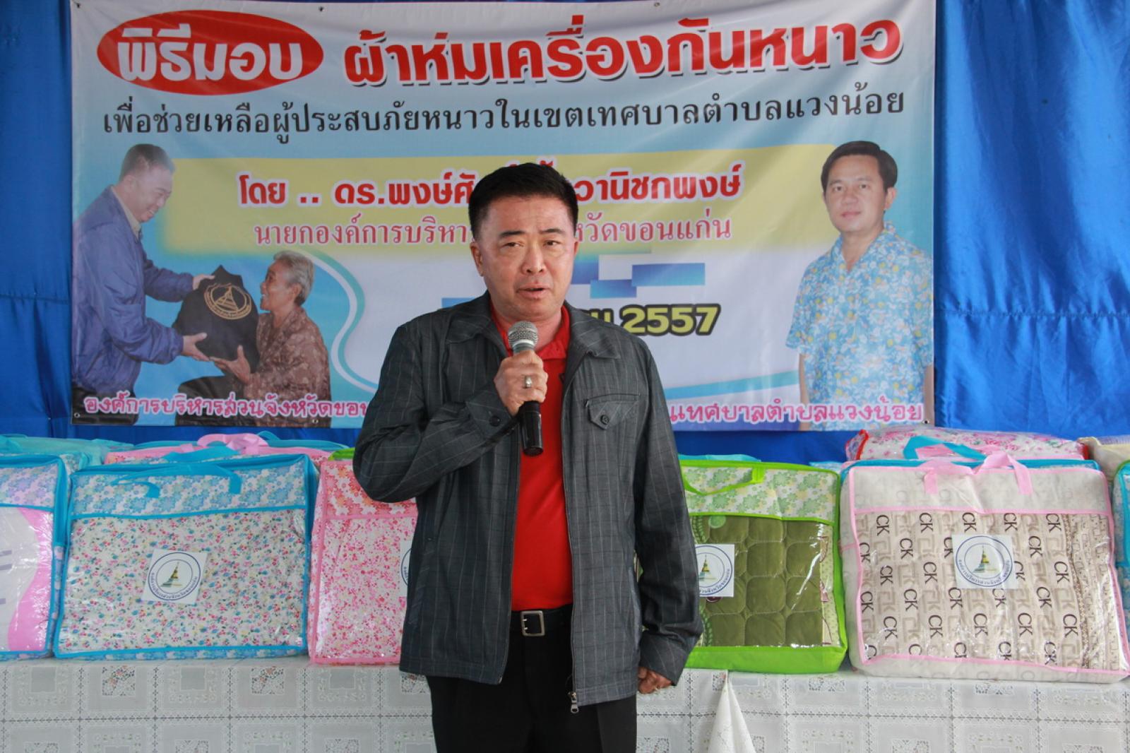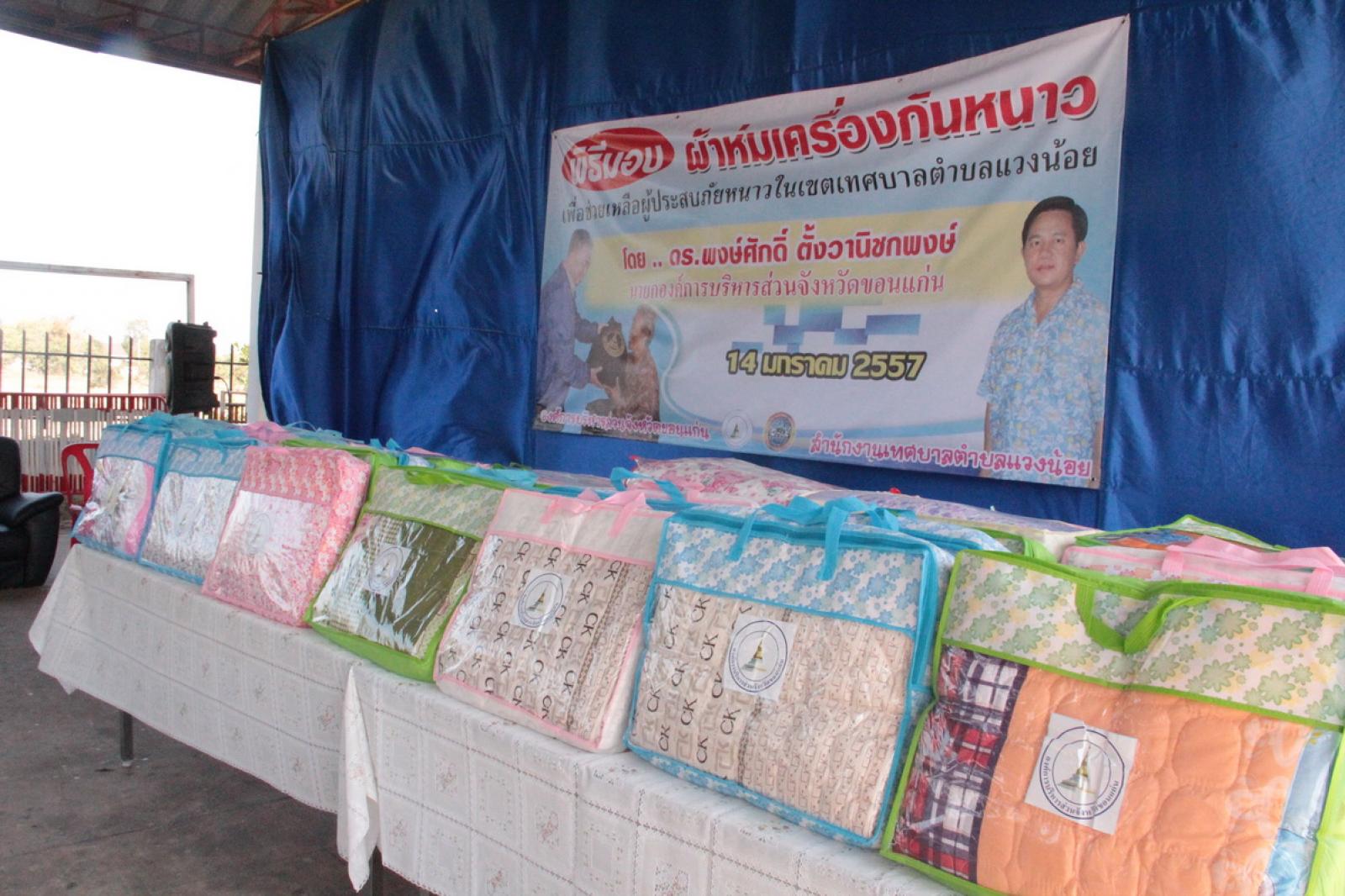 เมื่อวันที่ ๑๔ มกราคม ๒๕๕๗ องค์การบริหารส่วนจังหวัดขอนแก่น นำโดย ดร.พงษ์ศักดิ์ ตั้งวานิชกพงษ์ นายกองค์การบริหารส่วนจังหวัดขอนแก่น พร้อมด้วย นายทองสุข ธนูรัตน์ ส.อบจ. อ.แวงใหญ่ นายคำพันธ์ พรหมวงศ์ ส.อบจ.อ.แวงน้อย นายคจิตร พงษ์คำพันธ์ ส.อบจ.พล เขต 1 นางสาวนงลักษณ์ รัตนจันทร์ รองปลัดองค์การบริหารส่วนจังหวัดขอนแก่น และหัวหน้าส่วนราชการองค์การบริหารส่วนจังหวัดขอนแก่น และข้าราชการองค์การบริหารส่วนจังหวัดขอนแก่น ได้ตระหนักถึงความเดือดร้อนของพี่น้องประชาชนชาวจังหวัดขอนแก่น ที่ประสบภัยหนาว จึงได้ร่วมกันมอบผ้าห่มช่วยเหลือผู้ประสบภัยหนาว จำนวนทั้งสิ้น ๒,๐๐๐ ผืน รายละเอียด ดังนี้