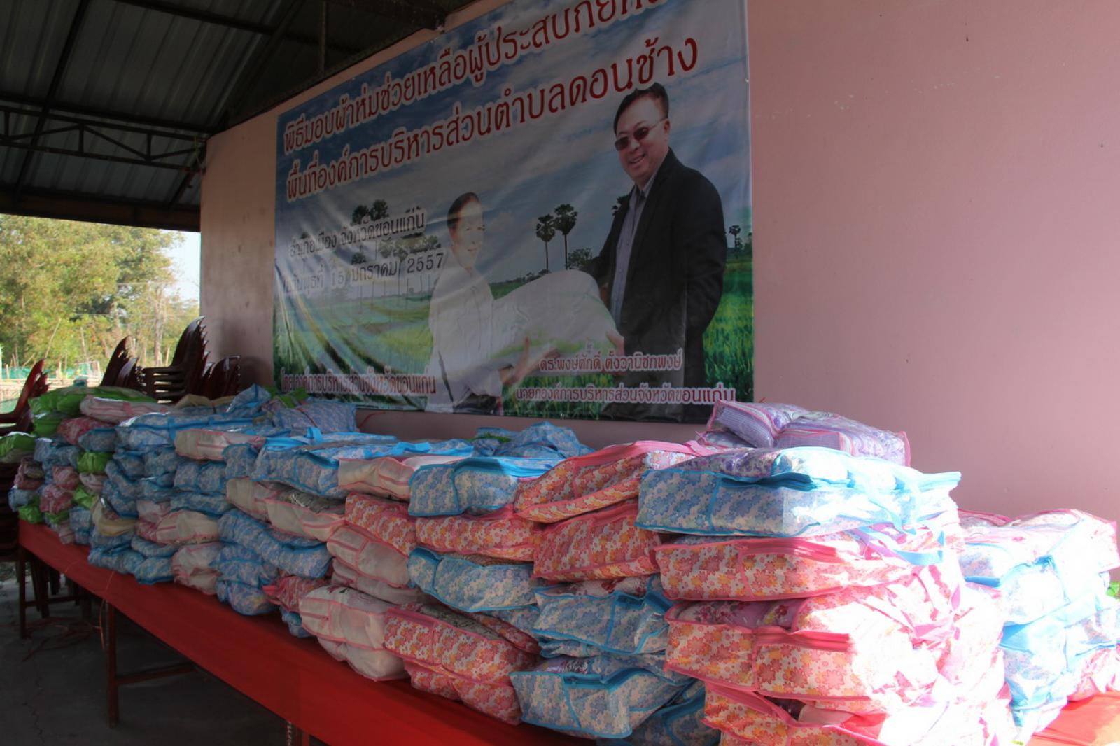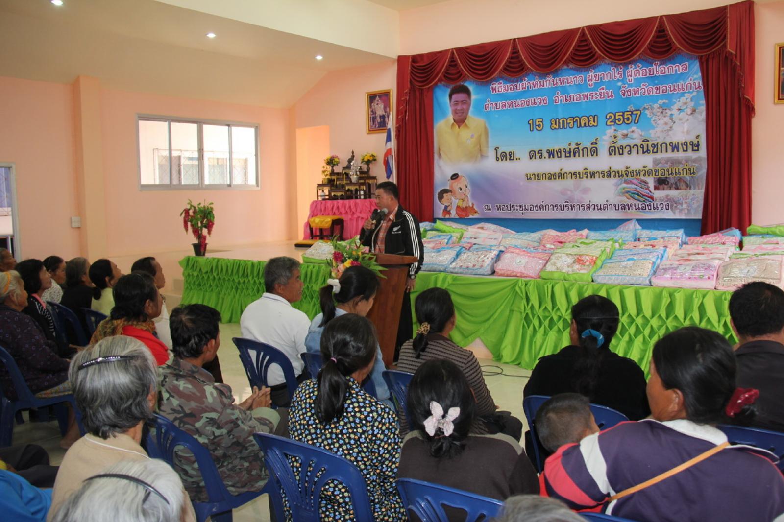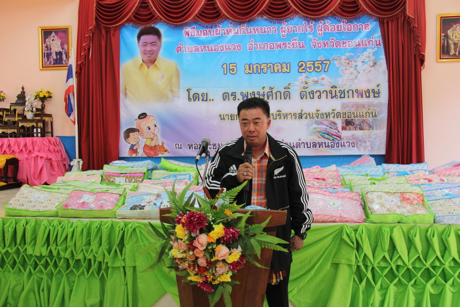 เมื่อวันที่ 1๕ มกราคม ๒๕๕๗ องค์การบริหารส่วนจังหวัดขอนแก่น นำโดย ดร.พงษ์ศักดิ์ ตั้งวานิชกพงษ์ นายกองค์การบริหารส่วนจังหวัดขอนแก่น พร้อมด้วย นายจารุพรรณ ภูวสันติ ส.อบจ. อ.สีชมพู เขต ๒ นายอนุชา ตั้งวานิชกพงษ์ ส.อบจ.อ.เมืองขอนแก่น เขต ๕ นายสมาส นามพิกุล ส.อบจ.พระยืน นางสาวนงลักษณ์ รัตนจันทร์ รองปลัดองค์การบริหารส่วนจังหวัดขอนแก่น และหัวหน้าส่วนราชการองค์การบริหารส่วนจังหวัดขอนแก่น และข้าราชการองค์การบริหารส่วนจังหวัดขอนแก่น ได้ตระหนักถึงความเดือดร้อนของพี่น้องประชาชนชาวจังหวัดขอนแก่น ที่ประสบภัยหนาว จึงได้ร่วมกันมอบผ้าห่มช่วยเหลือผู้ประสบภัยหนาว จำนวนทั้งสิ้น ๑,๓๕๐ ผืน รายละเอียด ดังนี้