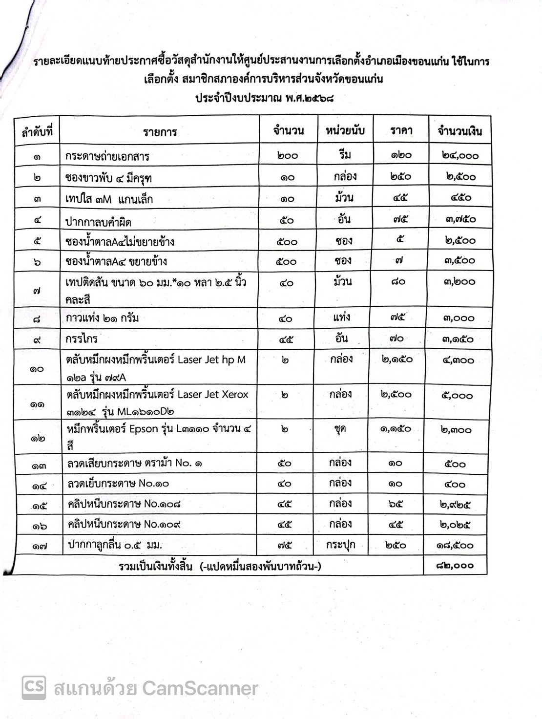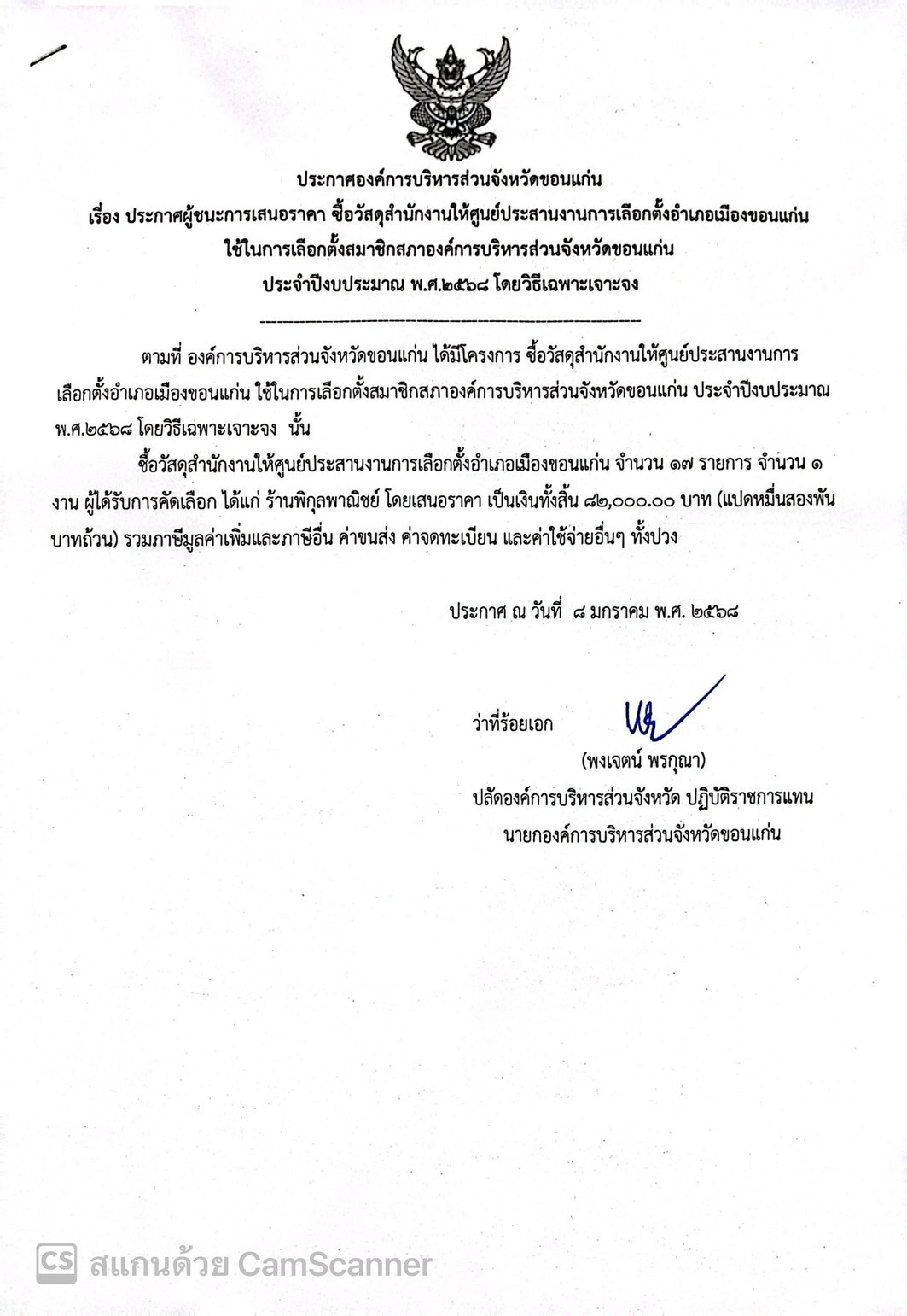 ประกาศผู้ชนะการเสนอราคาซื้อวัสดุสำนักงานให้ศูนย์ประสานงานการเลือกตั้ง อ.เมืองขอนแก่น ใช้ในการจัดการเลือกตั้ง ส.อบจ.ขอนแก่น ประจำปี งบประมาณ พ.ศ.2568(82,000)