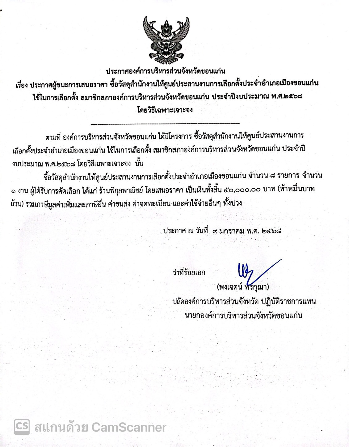 ประกาศผู้ชนะการเสนอราคาซื้อวัสดุสำนักงานให้ศูนย์ประสานงานการเลือกตั้งประจำ อ.เมืองขอนแก่น ใช้ในการเลือกตั้ง ส.อบจ.ขอนแก่น ประจำปีงบประมาณ พ.ศ.2568(50,000)