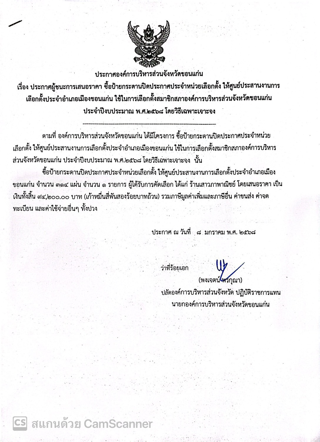 ประกาศผู้ชนะการเสนอราคาซื้อป้ายกระดานปิดประกาศประจำหน่วยเลือกตั้งให้ศูนย์ประสานงานการเลือกตั้งประจำ อ.เมืองขอนแก่น ใช้ในการเลือกตั้ง ส.อบจ.ขอนแก่น ประจำปีงบประมาณ พ.ศ.2568(94,200)