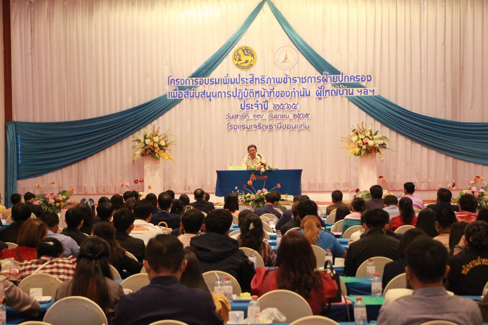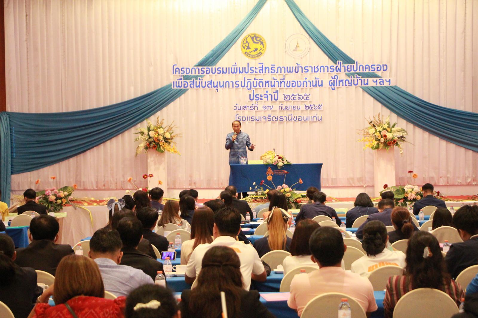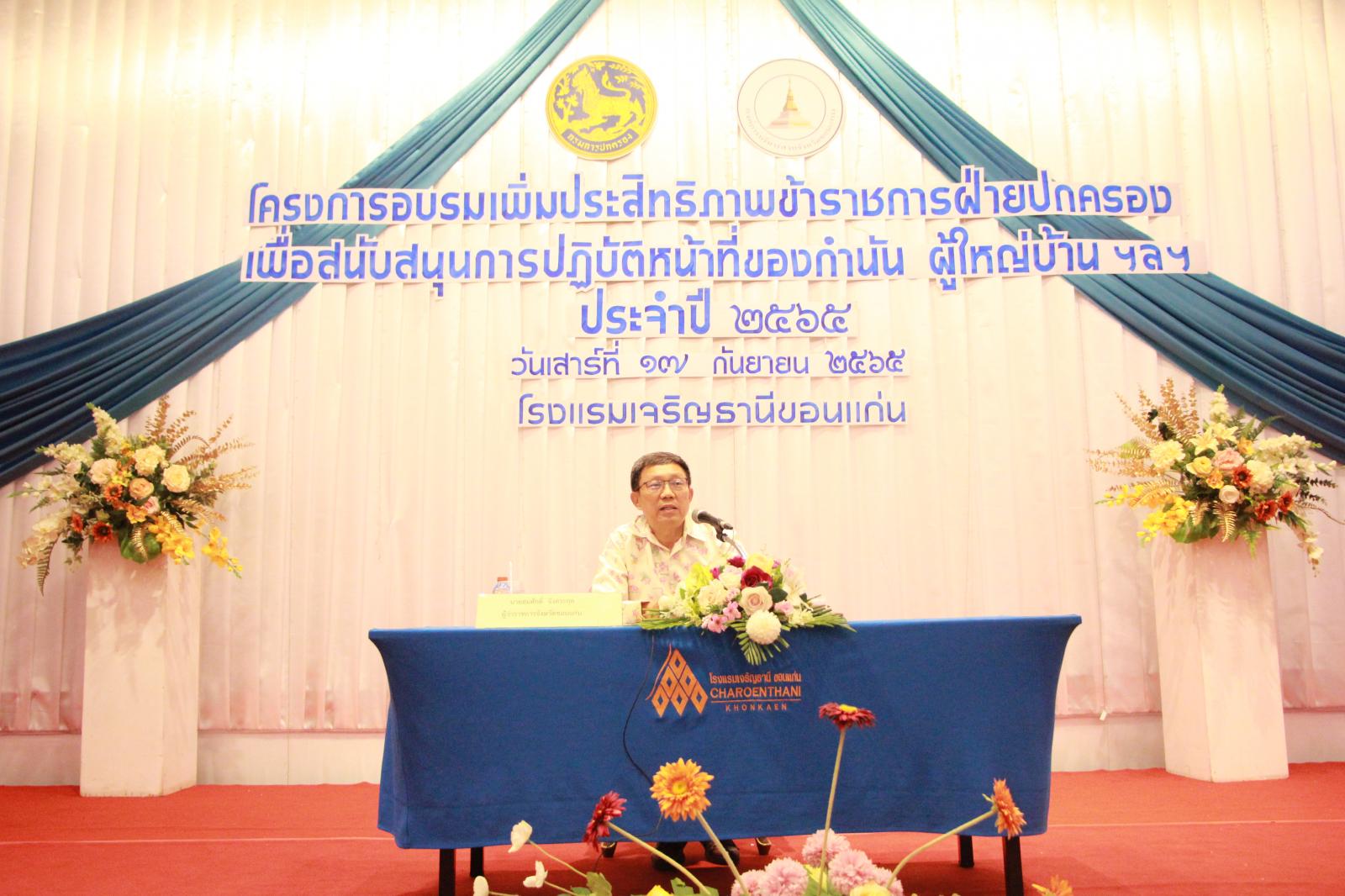 เมื่อวันที่ 17 กันยายน 2565 เวลา 10.30 น. ดร.พงษ์ศักดิ์ ตั้งวานิชกพงษ์ นายก อบจ.ขอนแก่น มอบหมายให้ นายนพกุล ปัญญาแก้ว รองปลัด อบจ.ขอนแก่น ร่วมกล่าวถึงการสนับสนุนโครงการในพิธีเปิดโครงการอบรมเพิ่มประสิทธิภาพข้าราชการฝ่ายปกครองเพื่อสนับสนุนการปฏิบัติหน้าที่ของกำนัน ผู้ใหญ่บ้าน ฯลฯ ประจำปี 2565 ซึ่งองค์การบริหารส่วนจังหวัดขอนแก่นได้สนับสนุนงบประมาณให้แก่ที่ทำการปกครองจังหวัดเพื่อจัดโครงการอบรมในครั้งนี้ โดยมี ดร.สมศักดิ์ จังตระกุล ผู้ว่าราชการจังหวัดขอนแก่น เป็นประธาน ณ โรงแรมเจริญธานี อ.เมืองขอนแก่น จ.ขอนแก่น