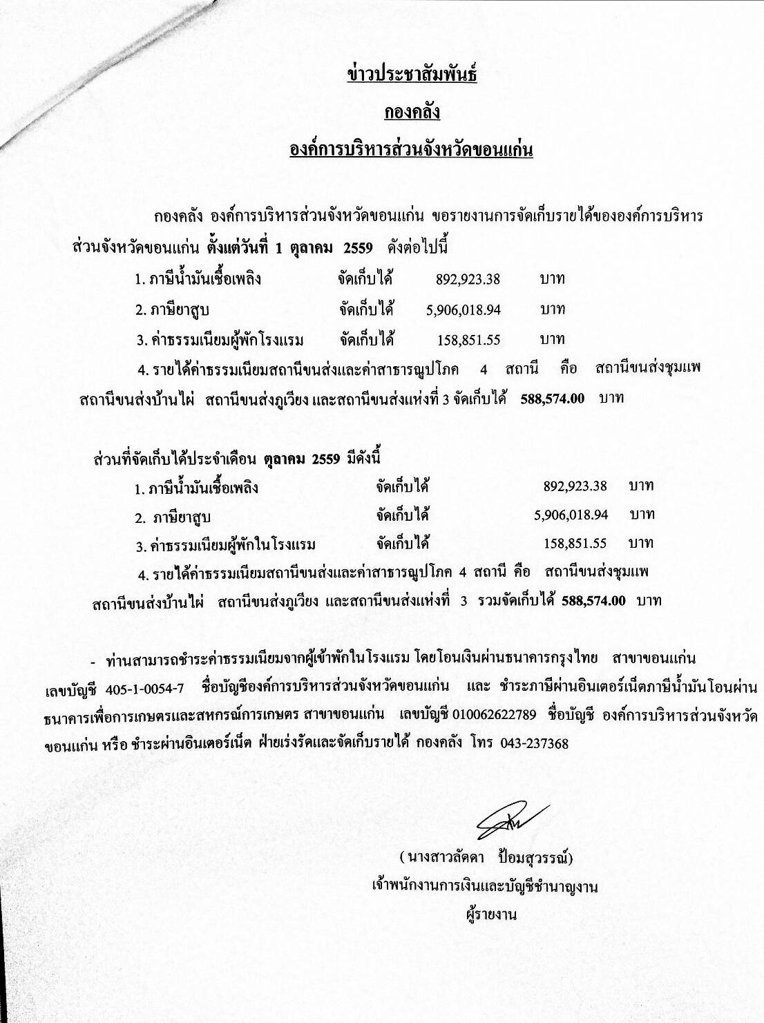 การจัดเก็บรายได้ขององค์การบริหารส่วนจังหวัดขอนแก่น ประจำเดือน ตุลาคม 2559