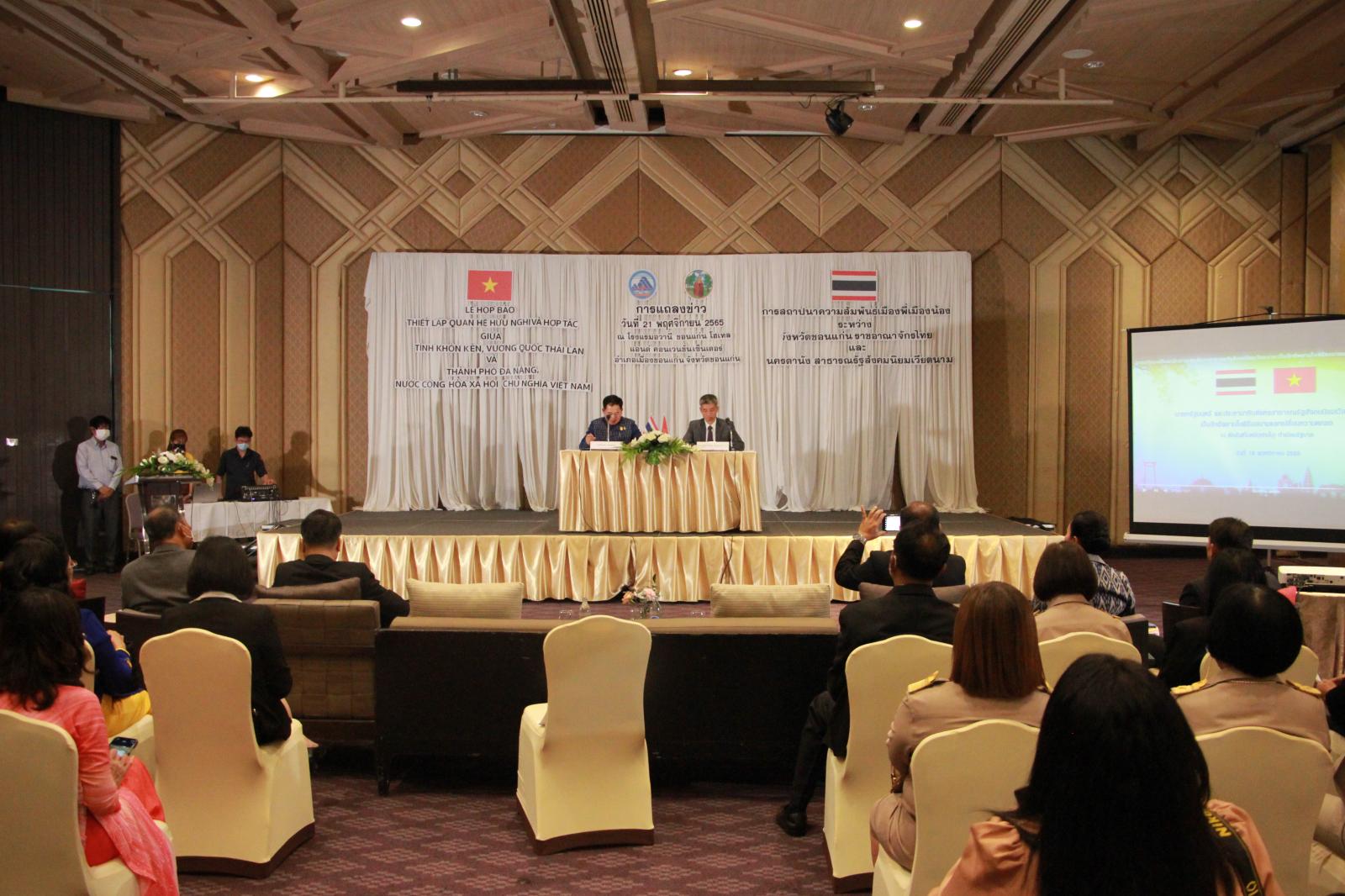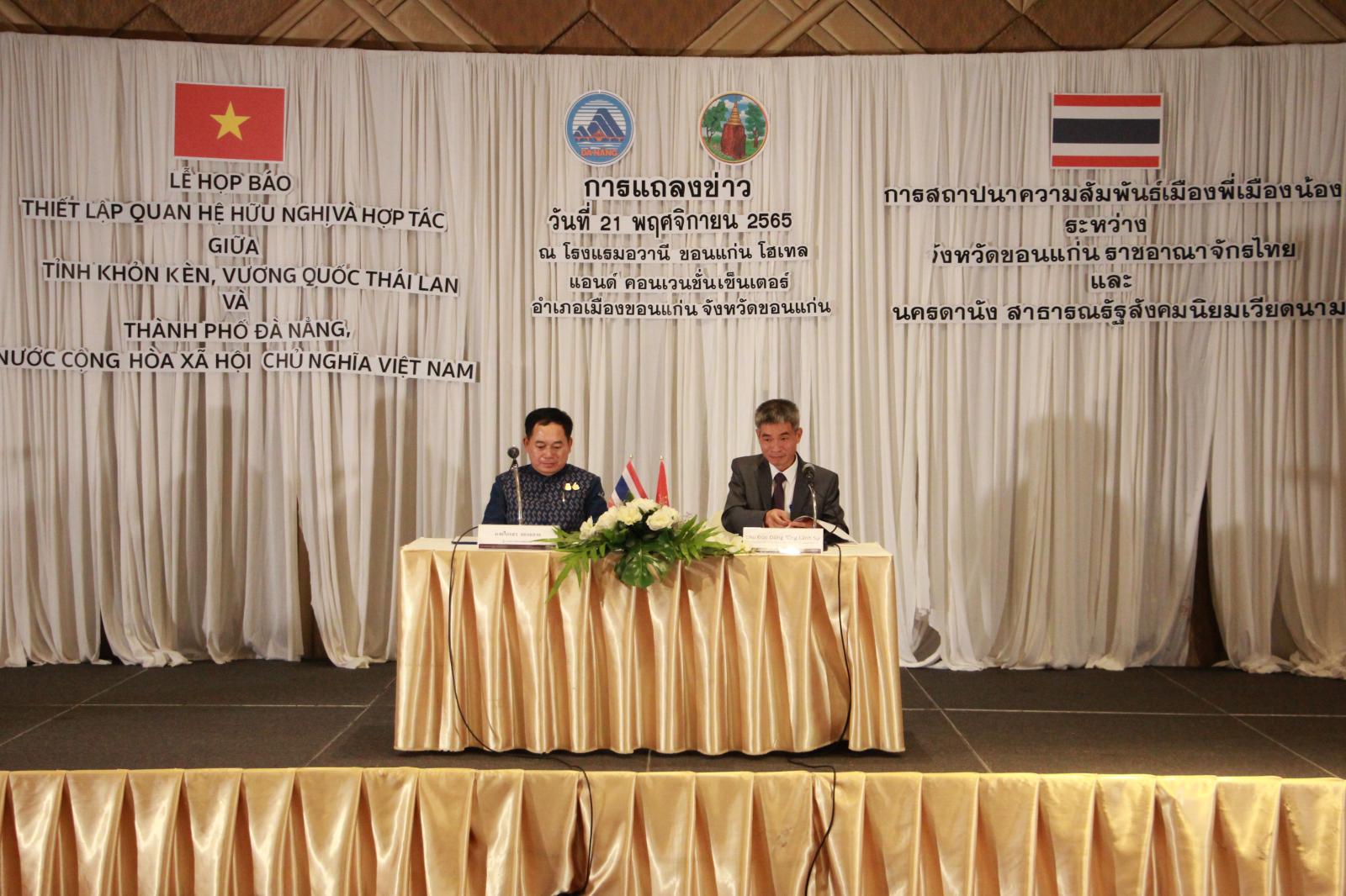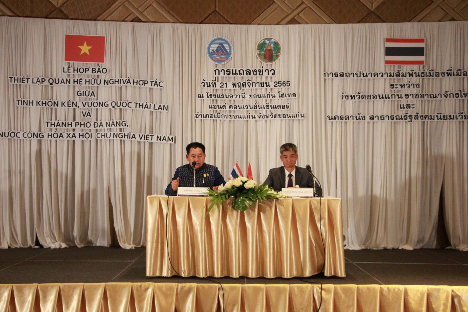 เมื่อวันที่ 21 พฤศจิกายน 2565 เวลา 13.30 น. องค์การบริหารส่วนจังหวัดขอนแก่น นำโดย ดร.พงษ์ศักดิ์ ตั้งวานิชกพงษ์ นายก อบจ.ขอนแก่น มอบหมายให้ นายสิทธิกุล ภูคำวงศ์ รองนายก อบจ.ขอนแก่น ร่วมงานแถลงข่าวการสถาปนาความสัมพันธ์เมืองพี่เมืองน้องระหว่างจังหวัดขอนแก่น ราชอาณาจักรไทย และนครดานัง สาธารณรัฐสังคมนิยมเวียดนาม โดยมี นายไกรสร กองฉลาด ผู้ว่าราชการจังหวัดขอนแก่น และนายจูดึ๊กสุง (Mr.Chu Duc Dung) กงสุลใหญ่สาธารณรัฐสังคมนิยมเวียดนาม ณ จังหวัดขอนแก่น เป็นผู้แถลงข่าวในครั้งนี้ ณ โรงแรมอวานี ขอนแก่น อ.เมืองขอนแก่น จ.ขอนแก่น