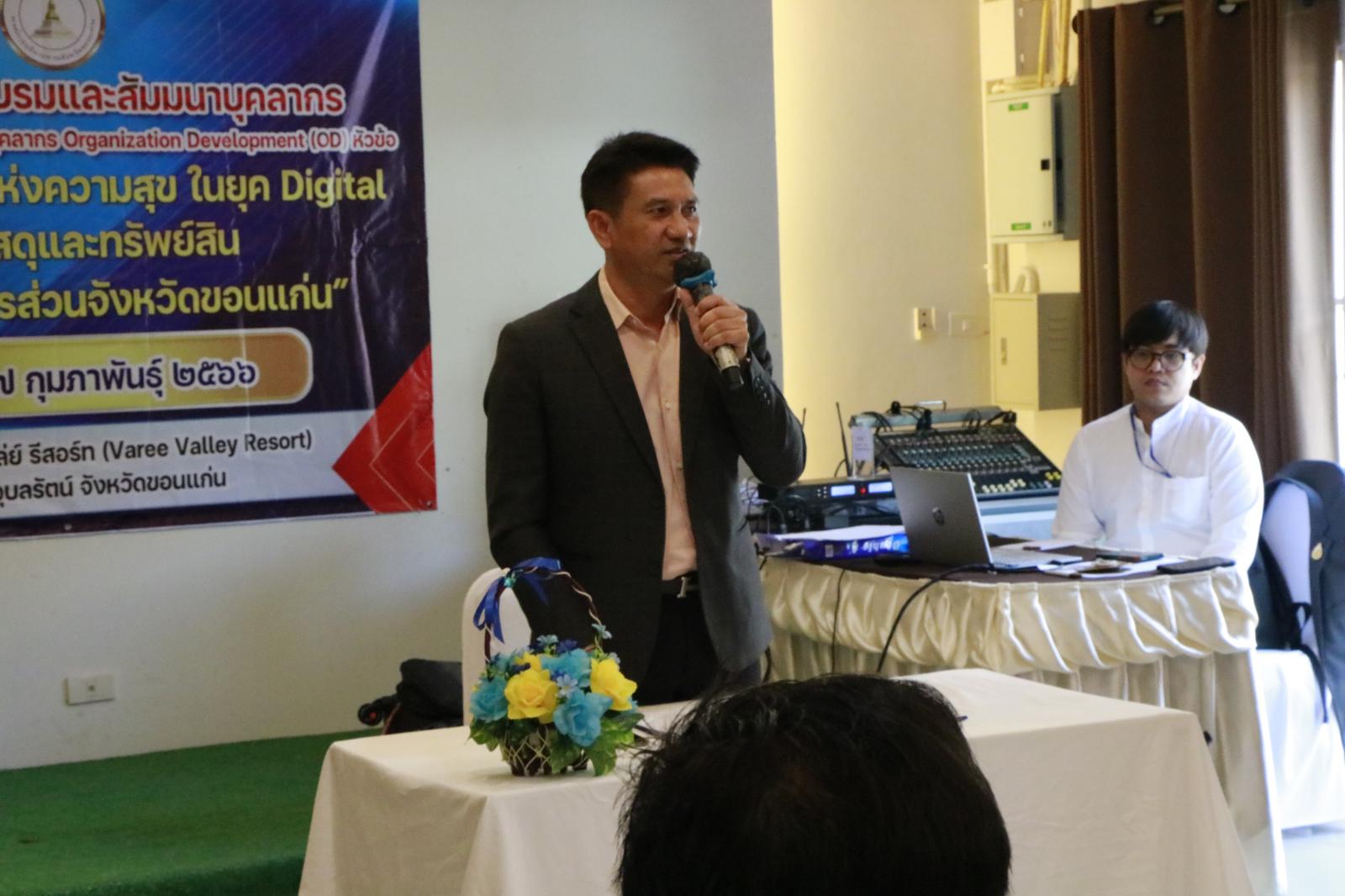 เมื่อวันที่ 6 กุมภาพันธ์ 2566 2566 เวลา 16.30 น. ดร.พงษ์ศักดิ์ ตั้งวานิชกพงษ์ นายกองค์การบริหารส่วนจังหวัดขอนแก่น มอบหมายให้นายสิทธิกุล ภูคำวงศ์ รองนายกองค์การบริหารส่วนจังหวัดขอนแก่น เชิญเป็นประธานเปิดโครงการอบรมและสัมมนาบุคลากร หลักสูตรการเสริมสร้างศักยภาพบุคลากร Organization Development (OD) หัวข้อ “องค์กรบริการแห่งความสุข ในยุค Digital กองพัสดุและทรัพย์สิน องค์การบริหารส่วนจังหวัดขอนแก่น” พร้อมด้วย นางสาวพัชรินทร์ ยิ้มจู ผู้อำนวยการกองพัสดุและทรัพย์สิน ข้าราชการ เจ้าหน้าที่ผู้ที่มีส่วนเกี่ยวข้อง องค์การบริหารส่วนจังหวัดขอนแก่น ณ โรงแรม วารี วัลเล่ย์รีสอร์ท อําเภออุบลรัตน์ จังหวัดขอนแก่น