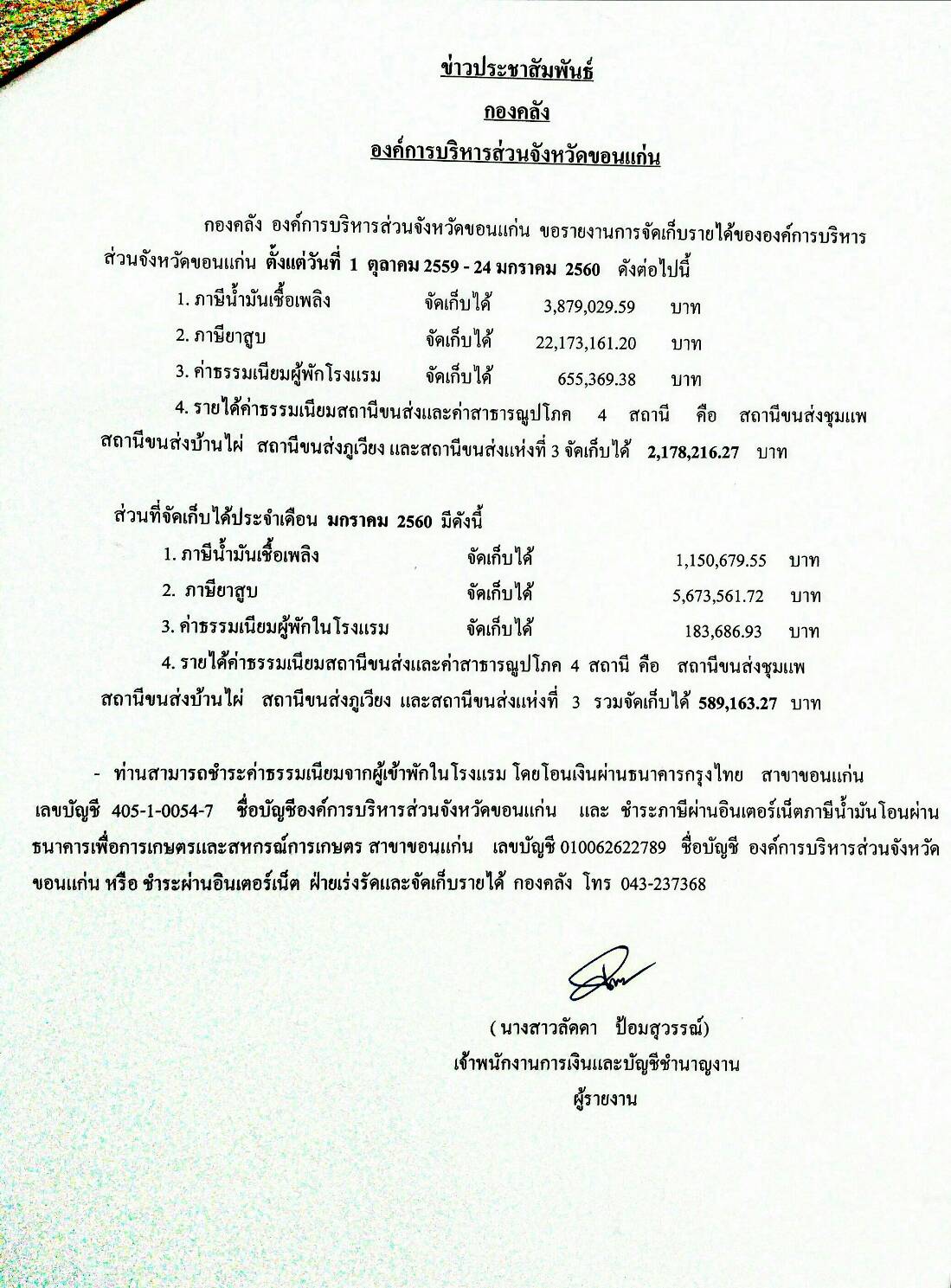 รายงานการจัดเก็บรายได้ขององค์การบริหารส่วนจังหวัดขอนแก่น ประจำเดือน 2560