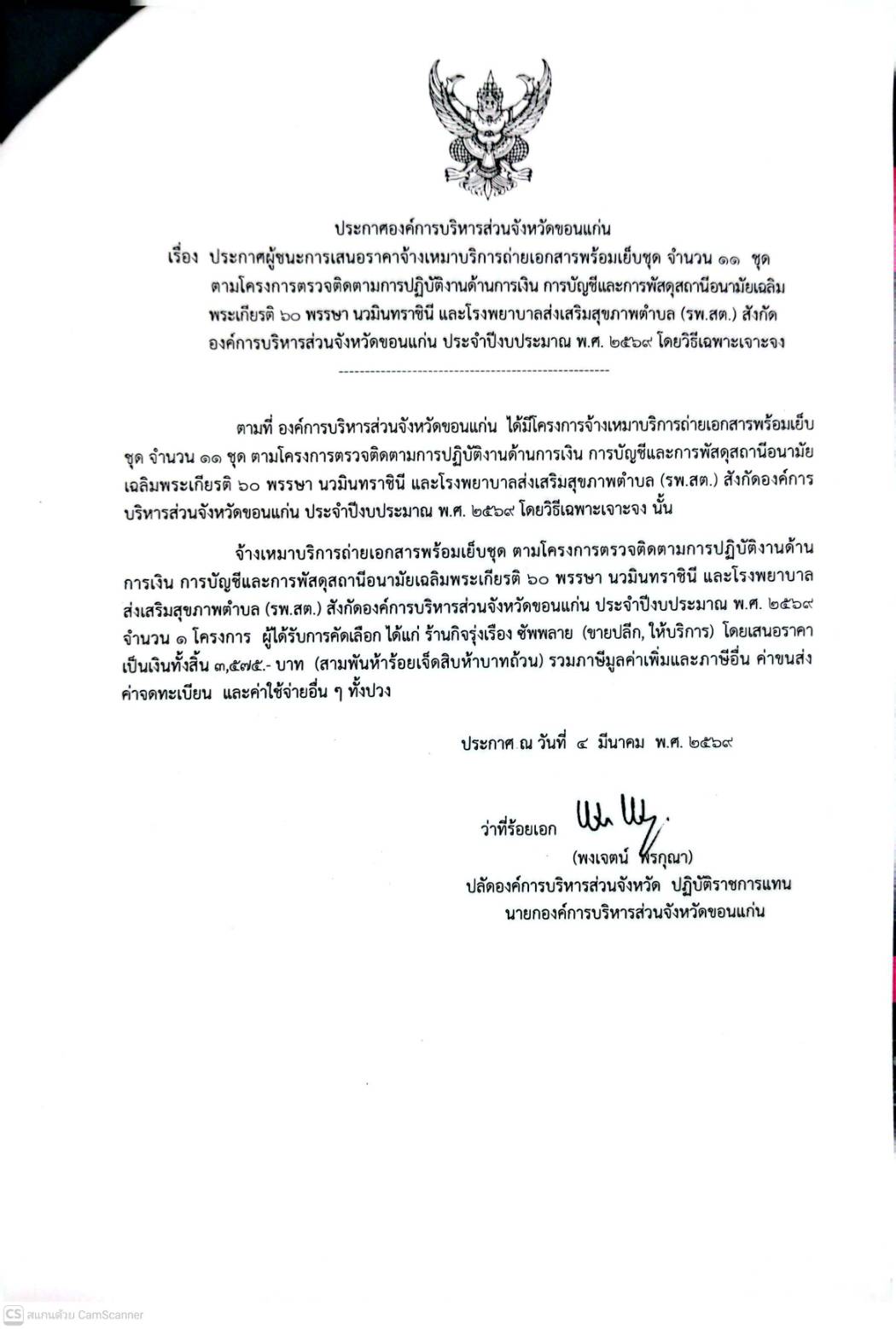ประกาศผู้ชนะการเสนอราคาจ้างเหมาบริการถ่ายเอกสารพร้อมเย็บชุด จำนวน 11 ชุด ตามโครงการตรวจติดตามการปฏิบัตงานด้านการเงิน การบัญชีและการพัสดุสถานีอนามัยเฉลิมพระเกียรติ 60 พรรษา นวนินทราชินี และโรงพยาบาลส่งเสริมสุขภาพตำบล(รพ.สต.)ฯ(3,575)