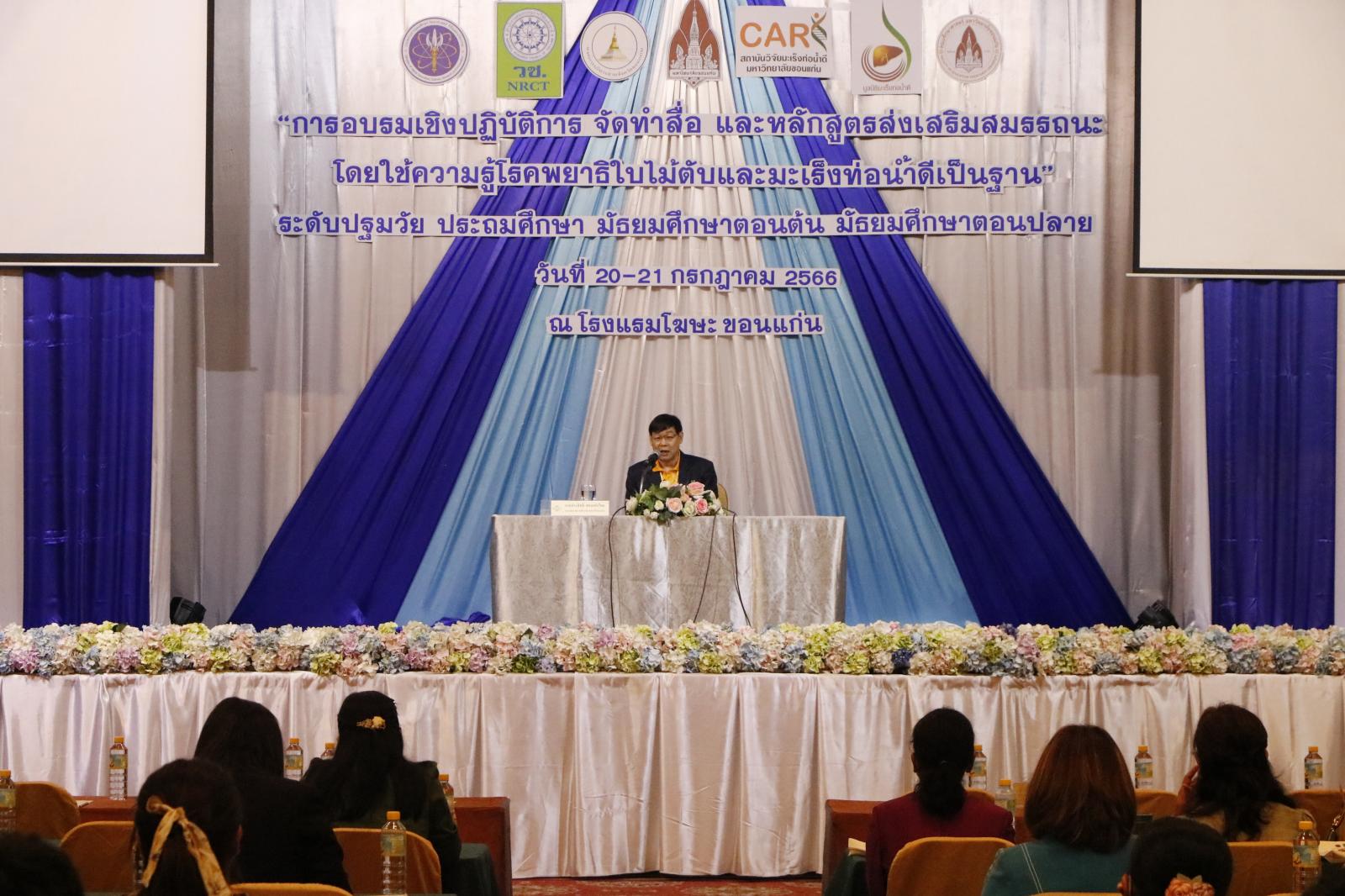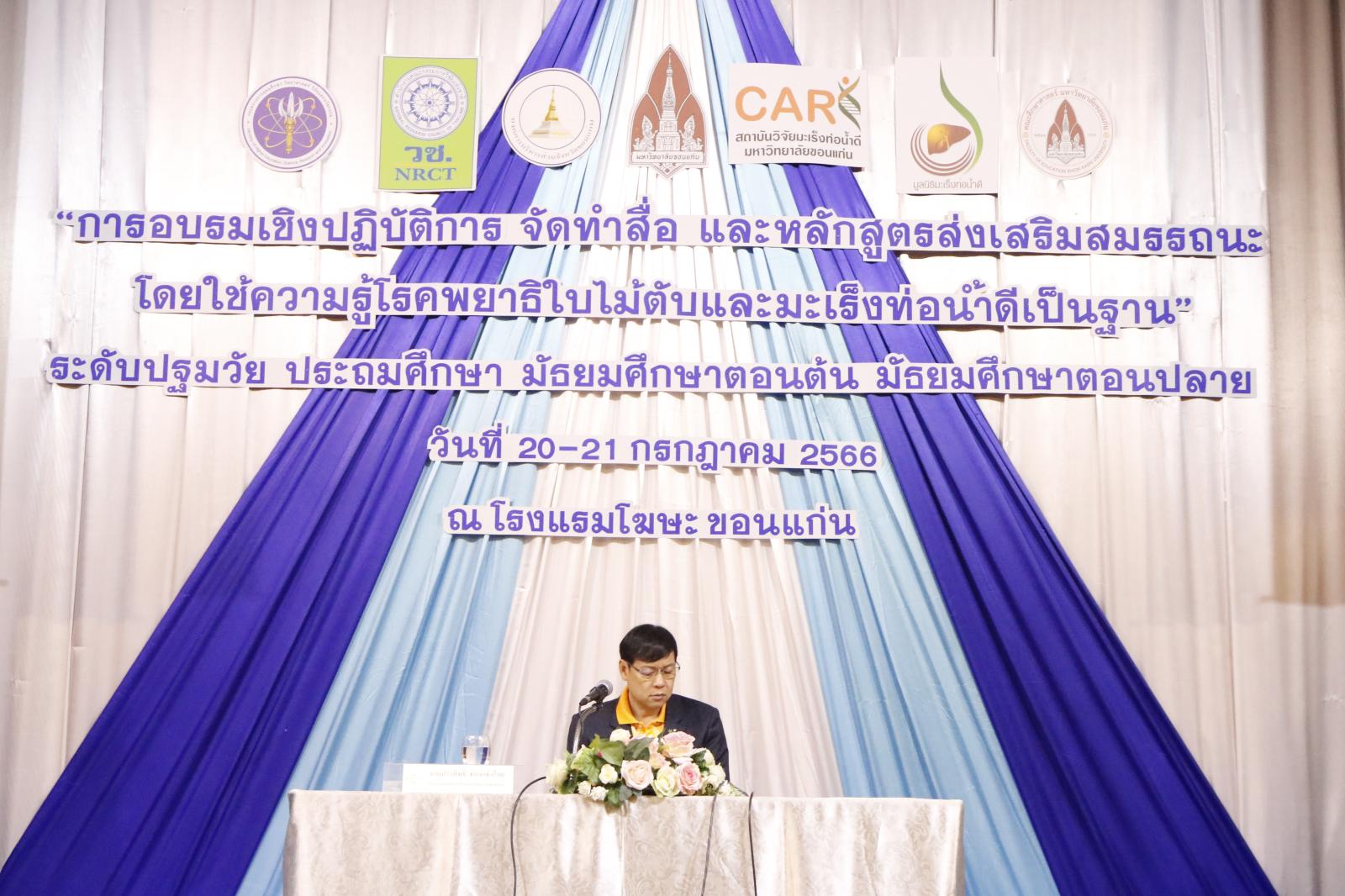 เมื่อวันที่ 20 กรกฎาคม 2566 เวลา 10.00 น. ดร.พงษ์ศักดิ์ ตั้งวานิชกพงษ์ นายกองค์การบริหารส่วนจังหวัดขอนแก่น มอบหมายให้ นายประสิทธิ์ ทองแท่งไทย รองนายกองค์การบริหารส่วนจังหวัด เป็นประธานเปิดการอบรมเชิงปฏิบัติการจัดทำสื่อ และหลักสูตรส่งเสริมสมรรถนะโดยใช้ความรู้โรคพยาธิใบไม้ตับและมะเร็งท่อน้ำดีเป็นฐานระดับปฐมวัย ประถมศึกษา มัธยมศึกษาตอนต้น มัธยมศึกษาตอนปลาย โดยมี รศ.ดร.วัชรินทร์ ลอยลม รักษาการแทนผู้อำนวยการสถาบันวิจัยมะเร็งท่อน้ำดีกล่าวรายงาน นพ.เรืองศิลป์ เถื่อนนาดี ประธานมูลนิธิมะเร็งท่อน้ำดี คณาจารย์มหาวิทยาลัยขอนแก่น คณะแพทยศาสตร์ คณะคุณครูโรงเรียนในสังกัดองค์การบริหารส่วนจังหวัดขอนแก่น สังกัดสำนักงานเขตพื้นที่การศึกษามัธยมศึกษาขอนแก่น สังกัดสำนักงานเขตพื้นที่การศึกษาเขตประถมศึกษาขอนแก่น เข้าร่วมโครงการ ณ ห้องมงกุฎเพชร โรงแรมโฆษะ ขอนแก่น อ.เมืองขอนแก่น จ.ขอนแก่น