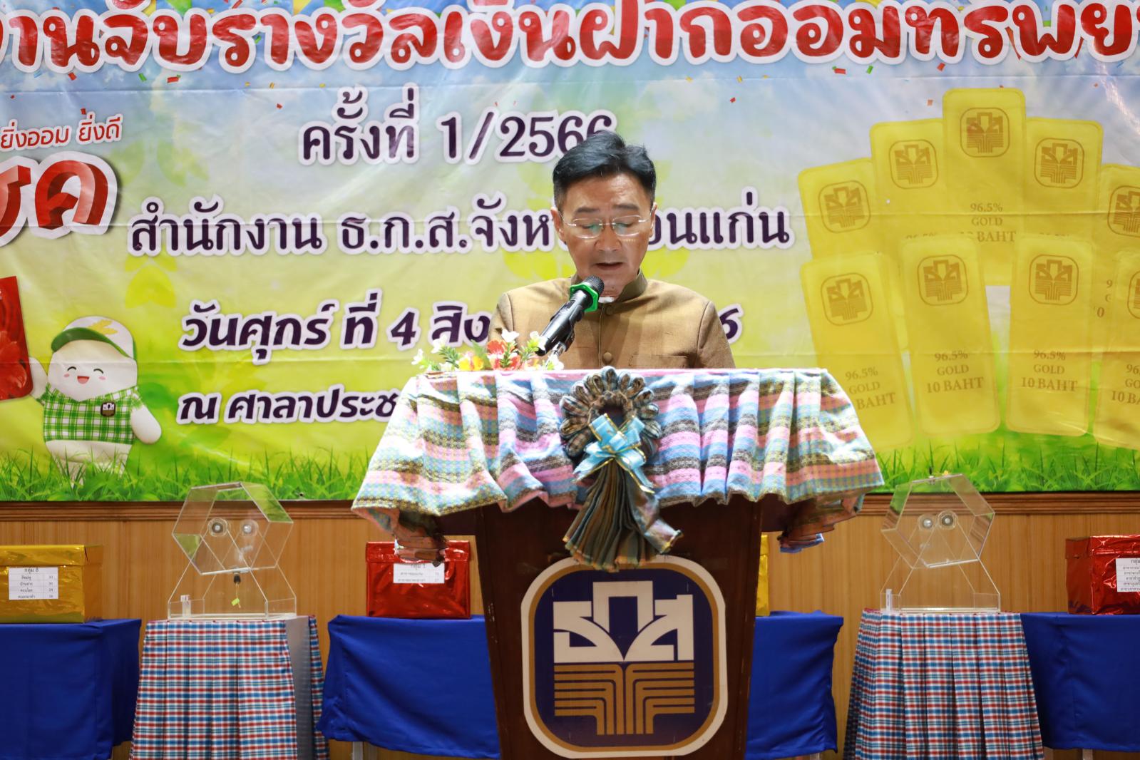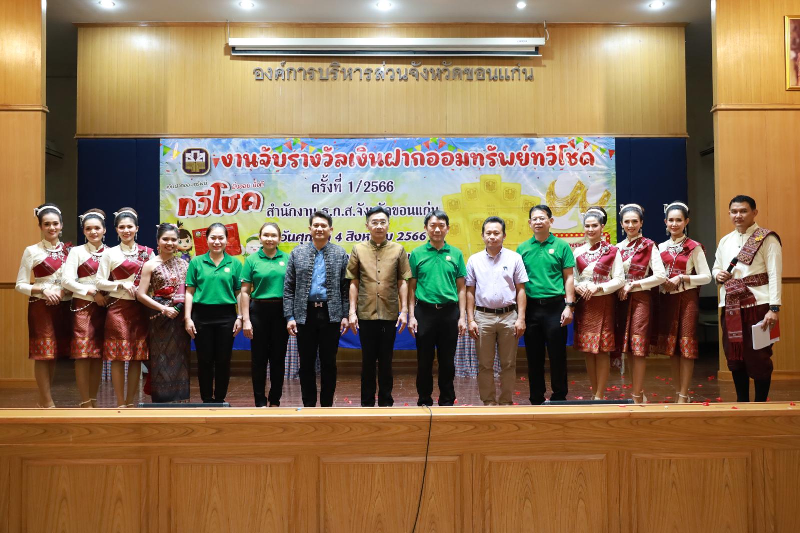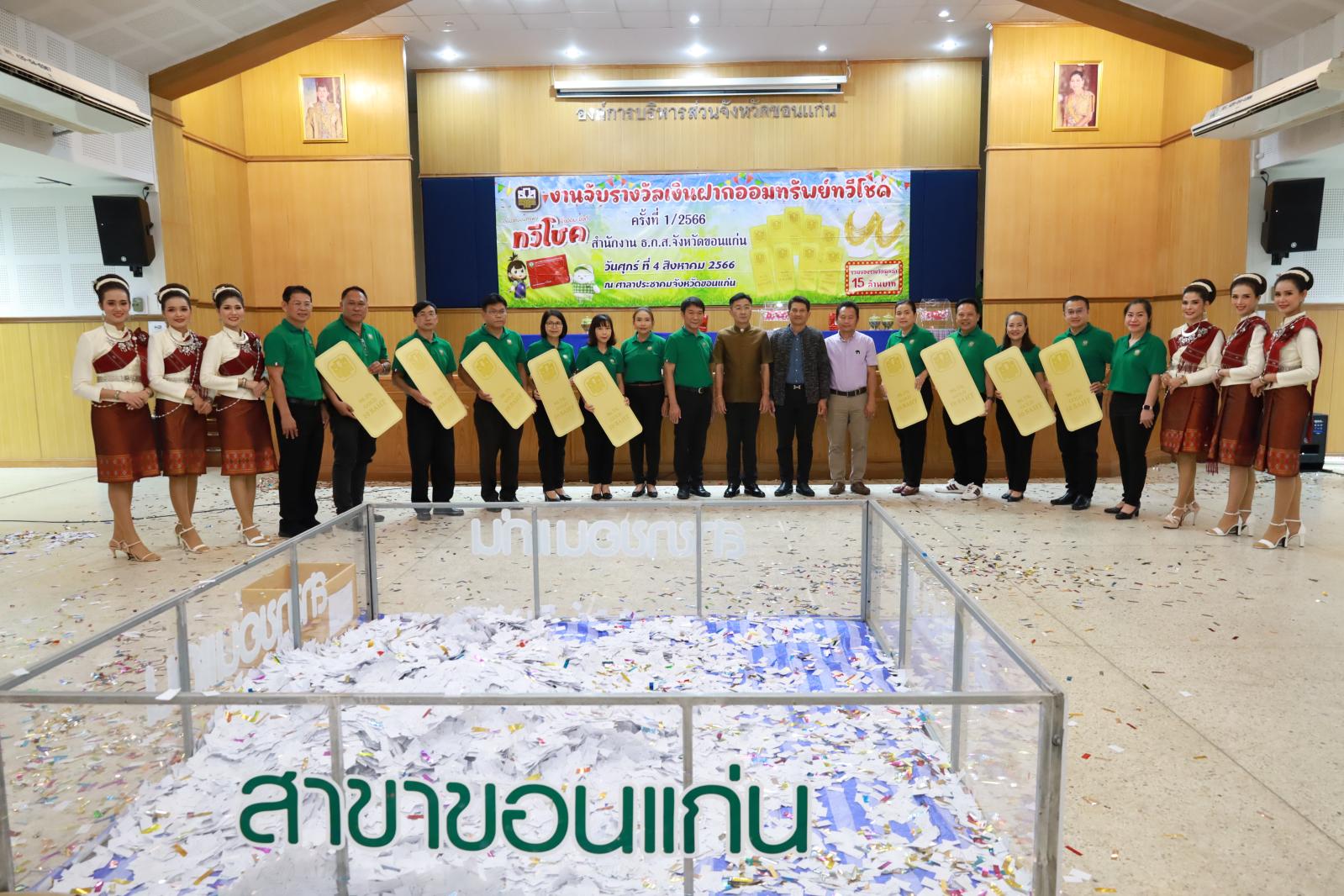 เมื่อวันที่ 4 สิงหาคม 2566 เวลา 11.00 น. ดร.พงษ์ศักดิ์ ตั้งวานิชกพงษ์ นายก อบจ.ขอนแก่น มอบหมายให้ นายสิทธิกุล ภูคำวงศ์ รองนายก อบจ.ขอนแก่น ร่วมงานจับรางวัลเงินฝากออมทรัพย์ทวีโชค ครั้งที่ 1 สำนักงาน ธ.ก.ส.จังหวัดขอนแก่น โดยมี นายชาญชัย ศรศรีวิชัย รองผู้ว่าราชการจังหวัดขอนแก่น เป็นประธาน ณ ศาลาประชาคมจังหวัดขอนแก่น อ.เมืองขอนแก่น จ.ขอนแก่น