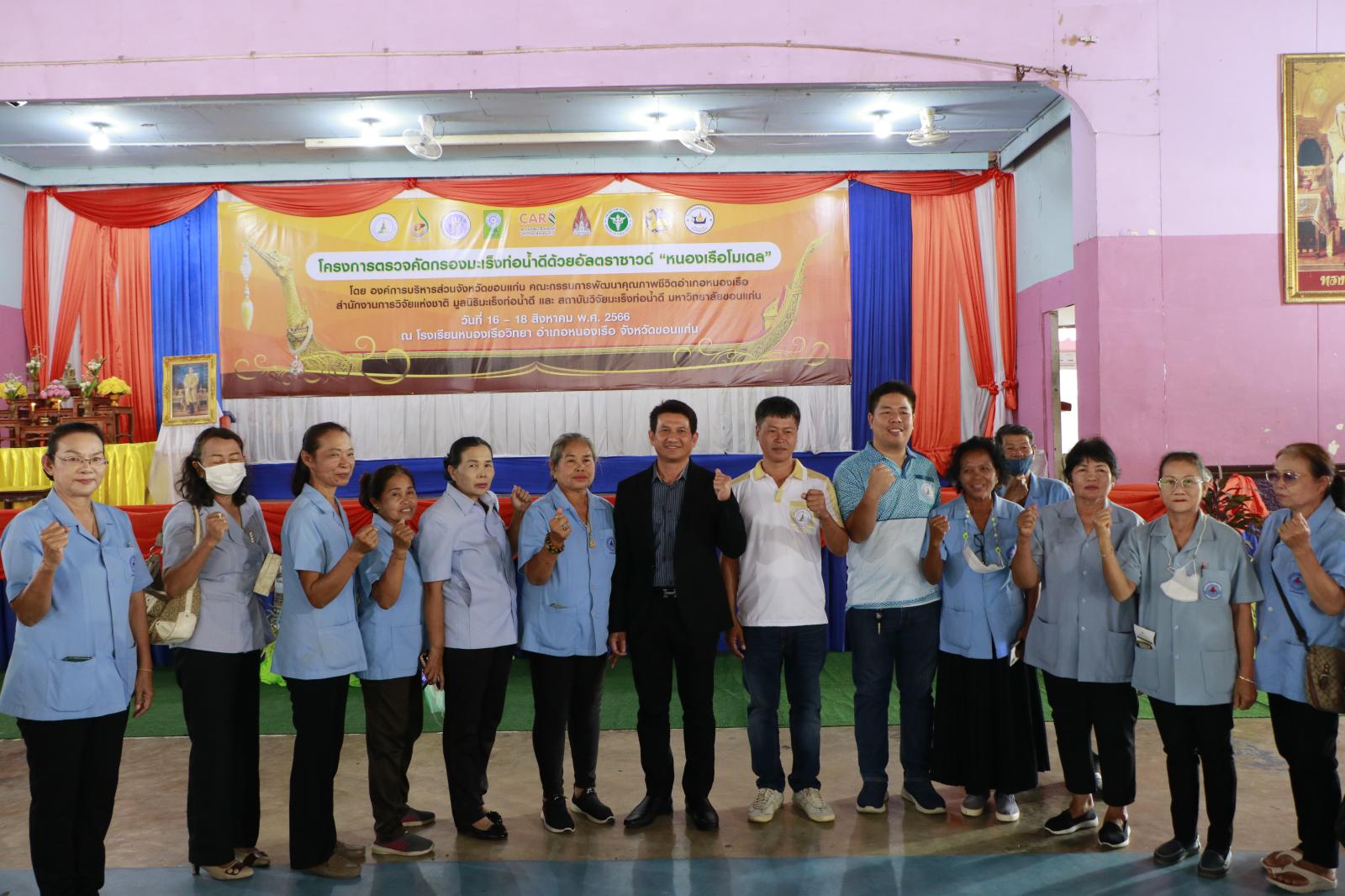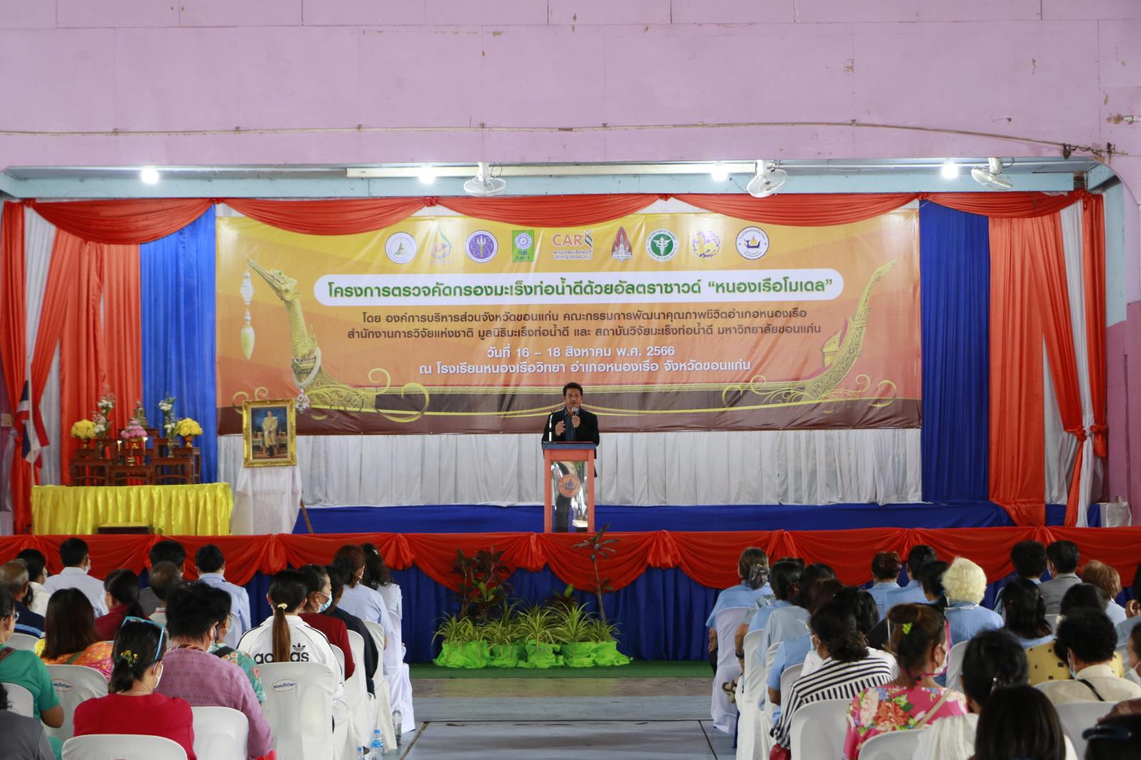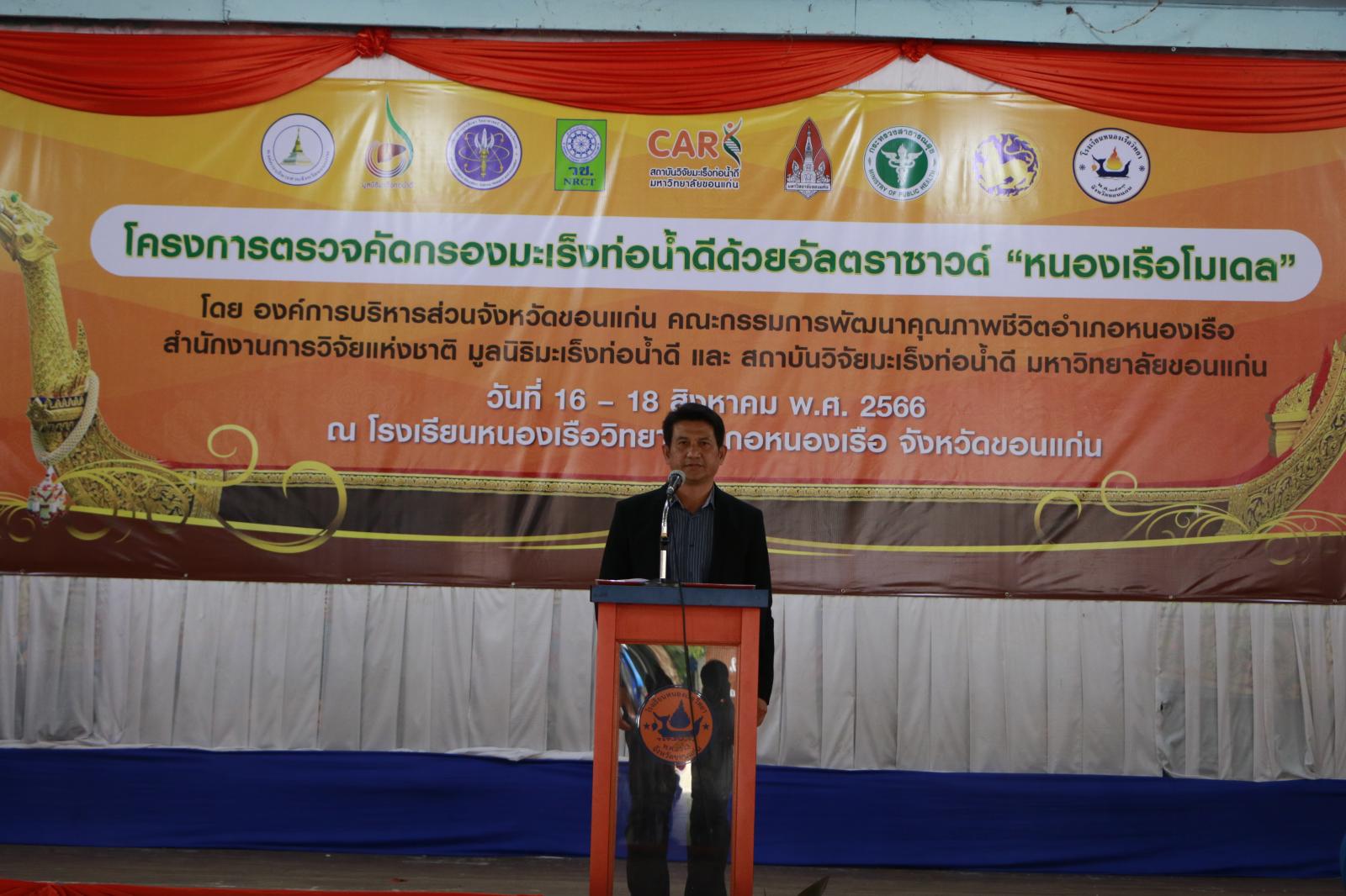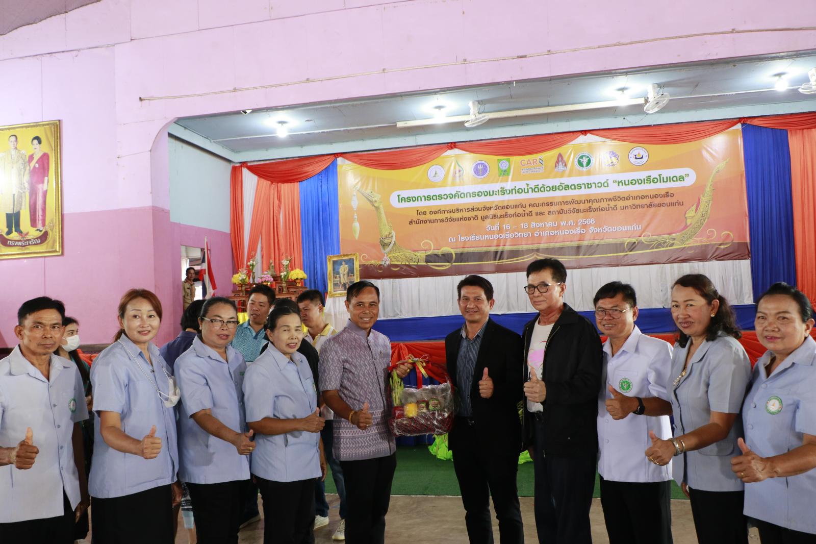 ในวันที่ 16 สิงหาคม 2566 เวลา 09.30 น. ดร.พงษ์ศักดิ์ ตั้งวานิชกพงษ์ นายกองค์การบริหารส่วนจังหวัดขอนแก่น มอบหมายให้ นายสิทธิกุล ภูคำวงศ์ รองนายกองค์การบริหารส่วนจังหวัดขอนแก่น เป็นประธานในพิธีเปิดกิจกรรมตรวจคัดกรองพยาธิใบไม้ตับและมะเร็งท่อน้ำดีด้วยอัลตราซาวด์ “หนองเรือโมเดล” โดยมี รศ.ดร.วัชรินทร์ ลอยลม รักษาการแทนผู้อำนวยการสถาบันวิจัยมะเม็งท่อน้ำดี กล่าวถึงแนวทางแก้ไขปัญหาโรคพยาธิใบไม้ในตับและมะเร็งท่อน้ำดี นพ.เรืองศิลป์ เถื่อนนาดี ประธานมูลนิธิมะเร็งท่อน้ำดี และ นายกองโท พิชัย วันตา นายอำเภอหนองเรือ กล่าวรายงาน พร้อมด้วย นายรัชเดช เตาะเจริญสุข ส.อบจ.ขอนแก่น อ.หนองเรือ เขต 1 นายวุฒิภัทร เตาะเจริญสุข ส.อบจ.ขอนแก่น อ.หนองเรือ เขต 2 หัวหน้าส่วนราชการ ผู้อำนวยการโรงพยาบาลส่งเสริมสุขภาพตำบล อสม. และนักเรียน ร่วมเป็นเกียรติ ณ โรงเรียนหนองเรือวิทยา