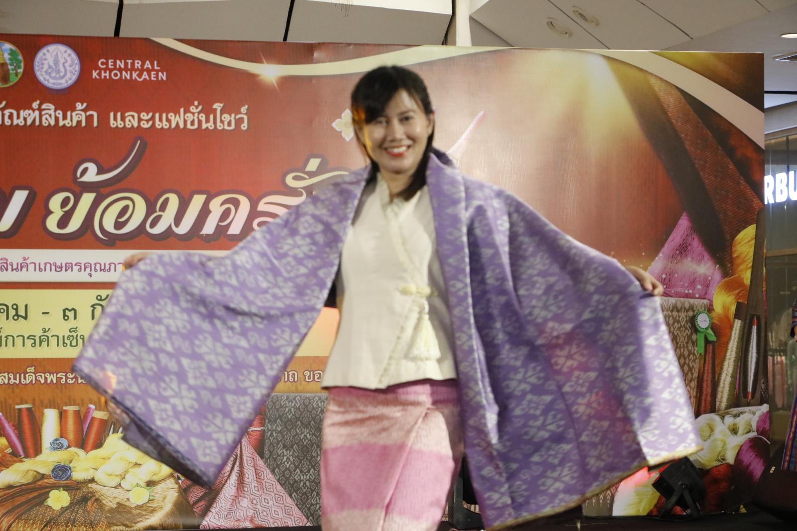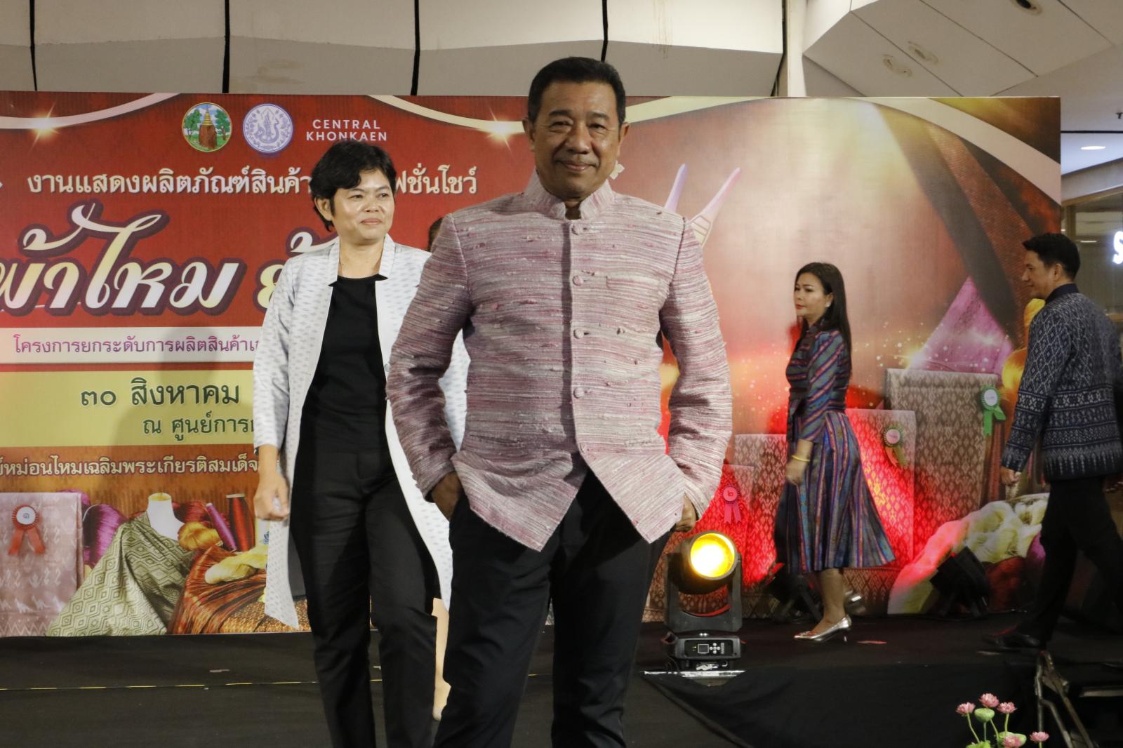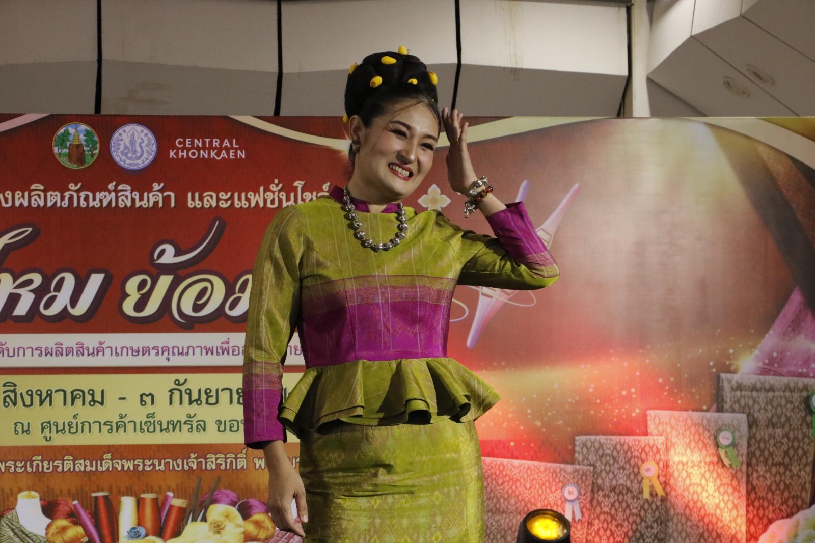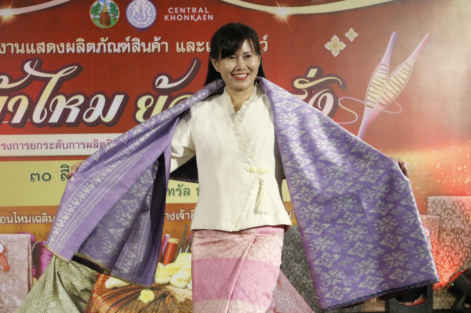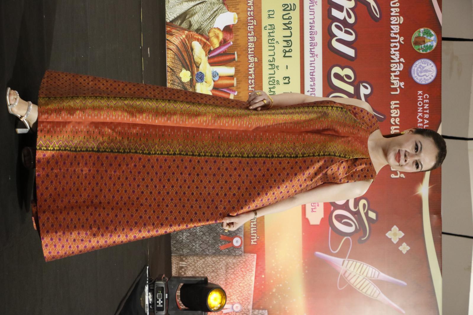 กิจกรรมการเดินแบบด้วยเครื่องแต่งกายชุดผ้าไหม ในงานจัดงานแสดงผลิตภัณฑ์สินค้าผ้าไหมย้อมครั่งและแสดงแฟชั่นโชว์