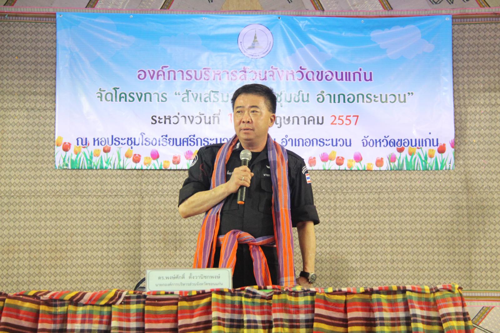 เมื่อวันพฤหัสบดีที่ 1 พฤษภาคม 2557 ณ ห้องประชุมโรงเรียนศรีกระนวนวิทยาคม อ.กระนวน จ.ขอนแก่น ดร.พงษ์ศักดิ์ ตั้งวานิชกพงษ์ นายกองค์การบริหารส่วนจังหวัดขอนแก่น ประธานในพิธีเปิดโครงการฯ โดยมีผู้ร่วมพิธีเปิดได้แก่ พระสุโชติ ปัชโชโต นายบุญเลิศ โพธิ์ชัย สาธารณสุขอำเภอกระนวน นางกรรณิการ์ สืบสารคาม ส.อบจ.ขอนแก่น อ.กระนวน เขต 1 นายตระกูล เจริญเชื้อ ส.อบจ.ขอนแก่น อ.กระนวน เขต 2 นายนพพร ปิติสุวรรณรัตน์ ส.อบจ.ขอนแก่น อ.น้ำพอง เขต 2 นางสาวนงลักษณ์ รัตนจันทร์ รองปลัดองค์การบริหารส่วนจังหวัดขอนแก่น หัวหน้าส่วนราชการองค์การบริหารส่วนจังหวัดขอนแก่น และคณะวิทยากร