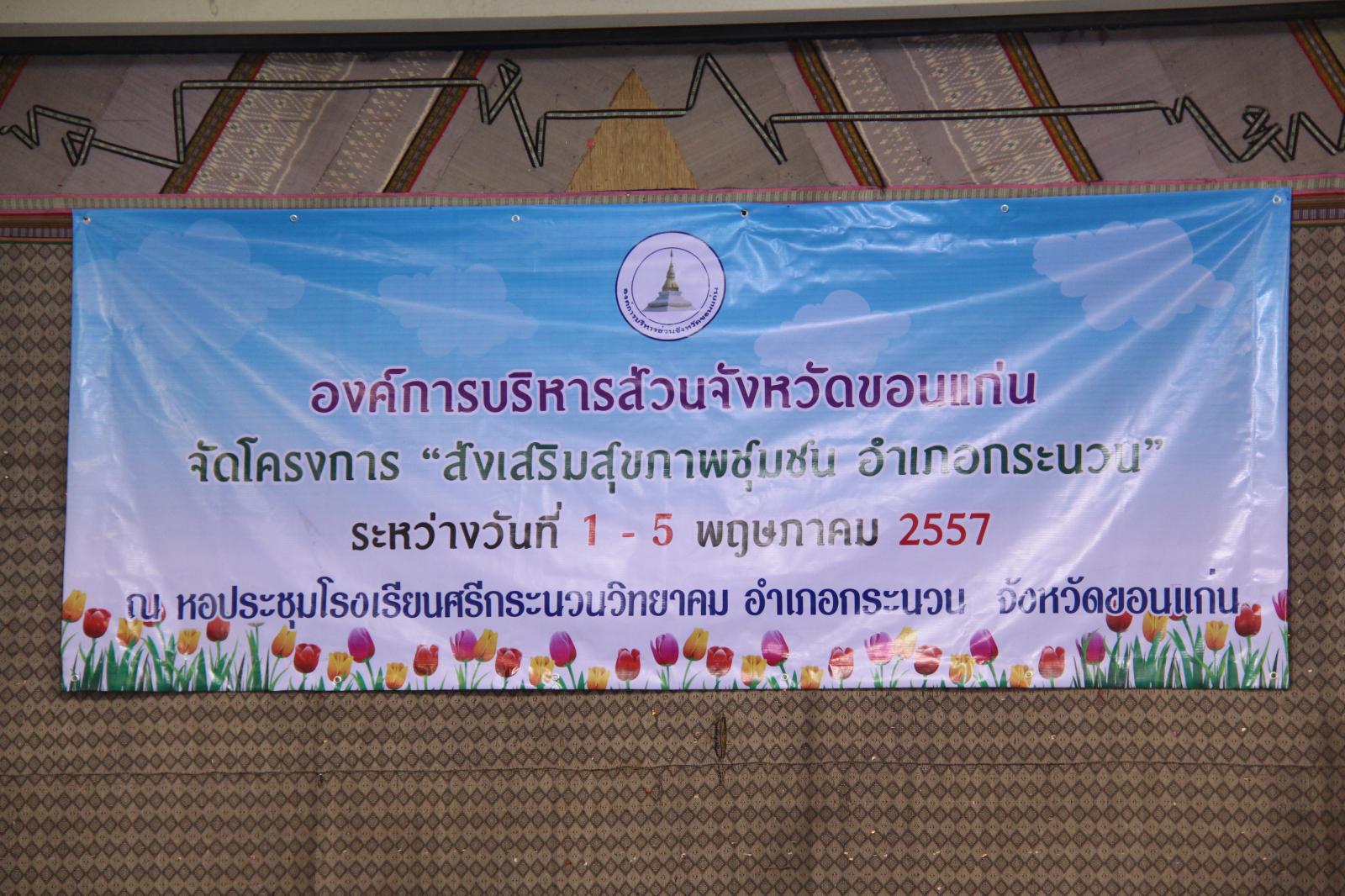 การจัดโครงการครั้งนี้จัดทำขึ้นเพื่อพัฒนาศักยภาพ อสม. แกนนำหมู่บ้าน ประชาชนในเขตพื้นที่อำเภอกระนวน ให้มีความรู้ ความสามารถ ในการดูแลสุขภาพของประชาชนในชุมชนได้อย่างถูกต้อง จำนวน 500 คน ระหว่างวันที่ 1 – 5 พฤษภาคม 2557 หลักสูตรที่อบรมได้แก่ การจัดทำแผนชุมชนในการป้องกันโรค การเฝ้าระวังโรคเบาหวาน การเฝ้าระวังโรคความดันโลหิตสูง การเฝ้าระวังโรคอัมพฤกษ์ อัมพาต/ข้อเข่าเสื่อม การเฝ้าระวังโรคมะเร็ง การจัดการภาวะอ้วนลงพุง และการดูแลผู้ด้อยโอกาสในชุมชน ส่วนผลที่คาดว่าจะได้รับคืออาสาสมัครสาธารณสุขประจำหมู่บ้าน (อสม.) แกนนำหมู่บ้าน ประชาชนได้รับความรู้เพิ่มมากขึ้น ในการที่จะดูแลสุขภาพคนในชุมชนให้มีสุขภาพที่แข็งแรงห่างไกลจากโรคภัยไข้เจ็บ