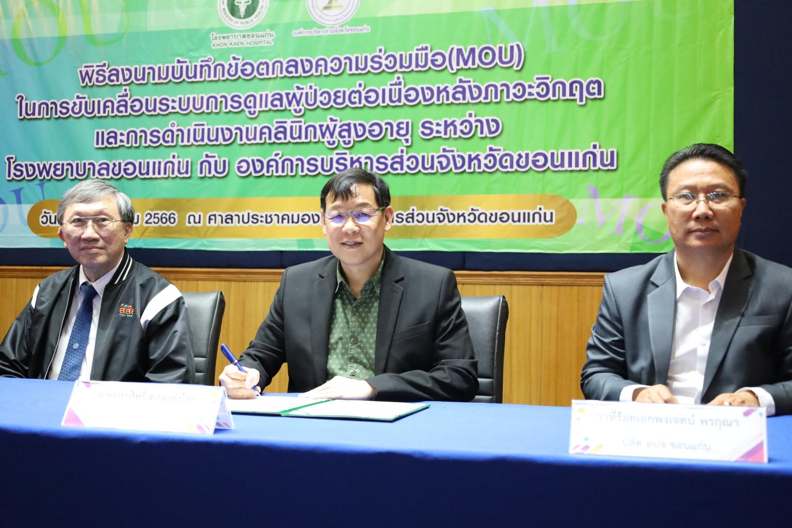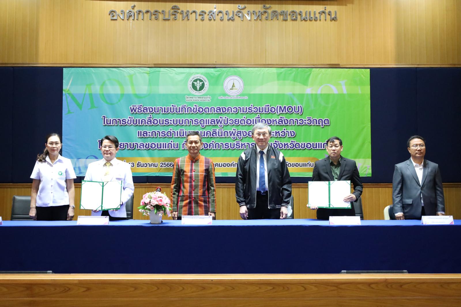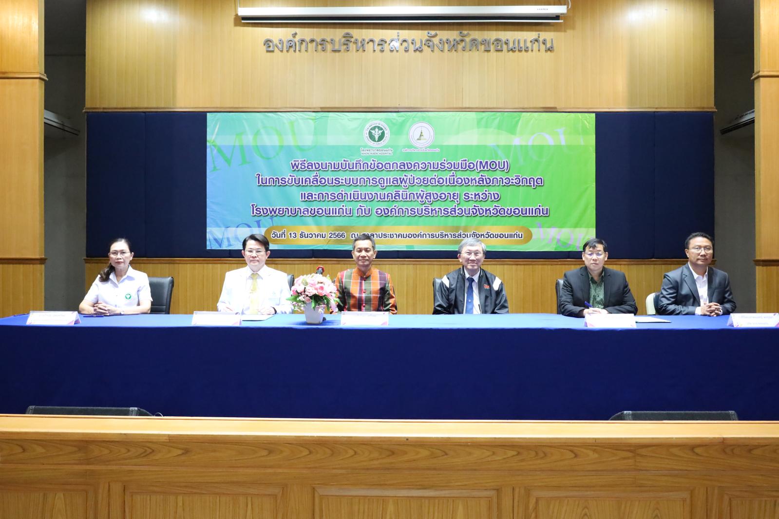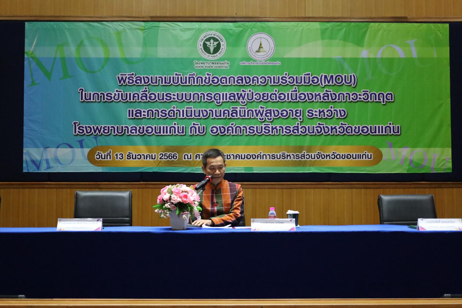 เมื่อวันที่ 13 ธันวาคม 2566 เวลา 14.00 น. ดร.พงษ์ศักดิ์ ตั้งวานิชกพงษ์ นายก อบจ.ขอนแก่น มอบหมายให้ นายประสิทธิ์ ทองแท่งไทย รองนายก อบจ.ขอนแก่น กล่าวต้อนรับในพิธีลงนามความร่วมมือ (MOU) ในการขับเคลื่อนระบบการดูแลผู้ป่วยต่อเนื่องหลังภาวะวิกฤติและดำเนินงานคลินิกผู้สูงอายุ ระหว่างโรงพยาบาลขอนแก่น กับ องค์การบริหารส่วนจังหวัดขอนแก่น โดยมี นายพันธุ์เทพ เสาโกศล รองผู้ว่าราชการจังหวัดขอนแก่น เป็นประธานและร่วมเป็นสักขีพยานในพิธีลงนามความร่วมมือ ในโอกาสนี้มี นายแพทย์เกรียงศักดิ์ วัชรนุกูลเกียรติ ผอ.โรงพยาบาลขอนแก่น, ว่าที่ร้อยเอกพงเจตน์ พรกุณา ปลัด อบจ.ขอนแก่น, นายแพทย์วิทยา ชาติบัญชาชัย ผอ.ศูนย์ความร่วมมือระหว่างองค์การอนามัยโลกด้านการป้องกันการบาดเจ็บ, นางบัวบุญ อุดมทรัพย์ รองนายแพทย์สาธารณสุขจังหวัดขอนแก่น, นางสาวนิศากร ดอนกระสินธุ์ ผอ.กองสาธารณสุข อบจ.ขอนแก่น เข้าร่วมพิธีลงนามและเป็นสักขีพยาน ณ ศาลาประชาคมองค์การบริหารส่วนจังหวัดขอนแก่น อ.เมืองขอนแก่น จ.ขอนแก่น