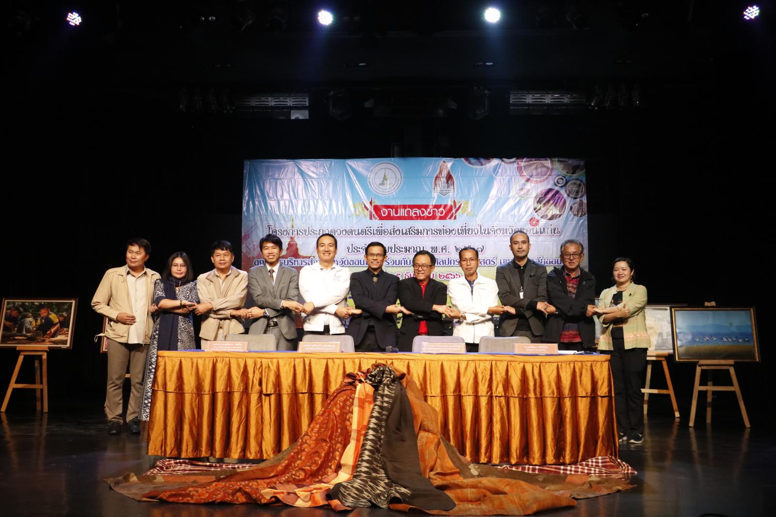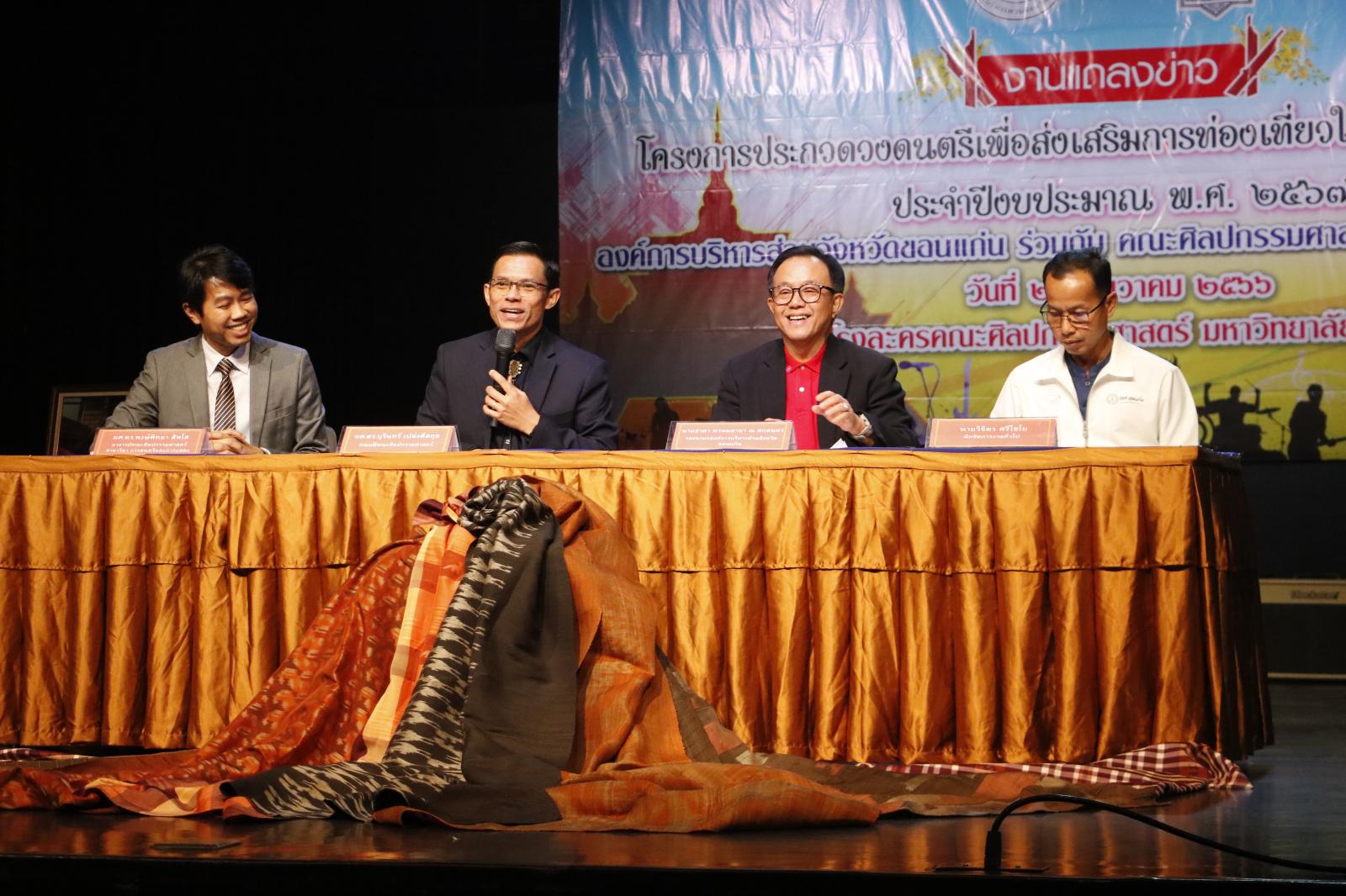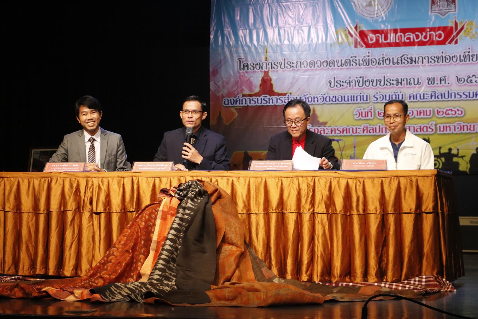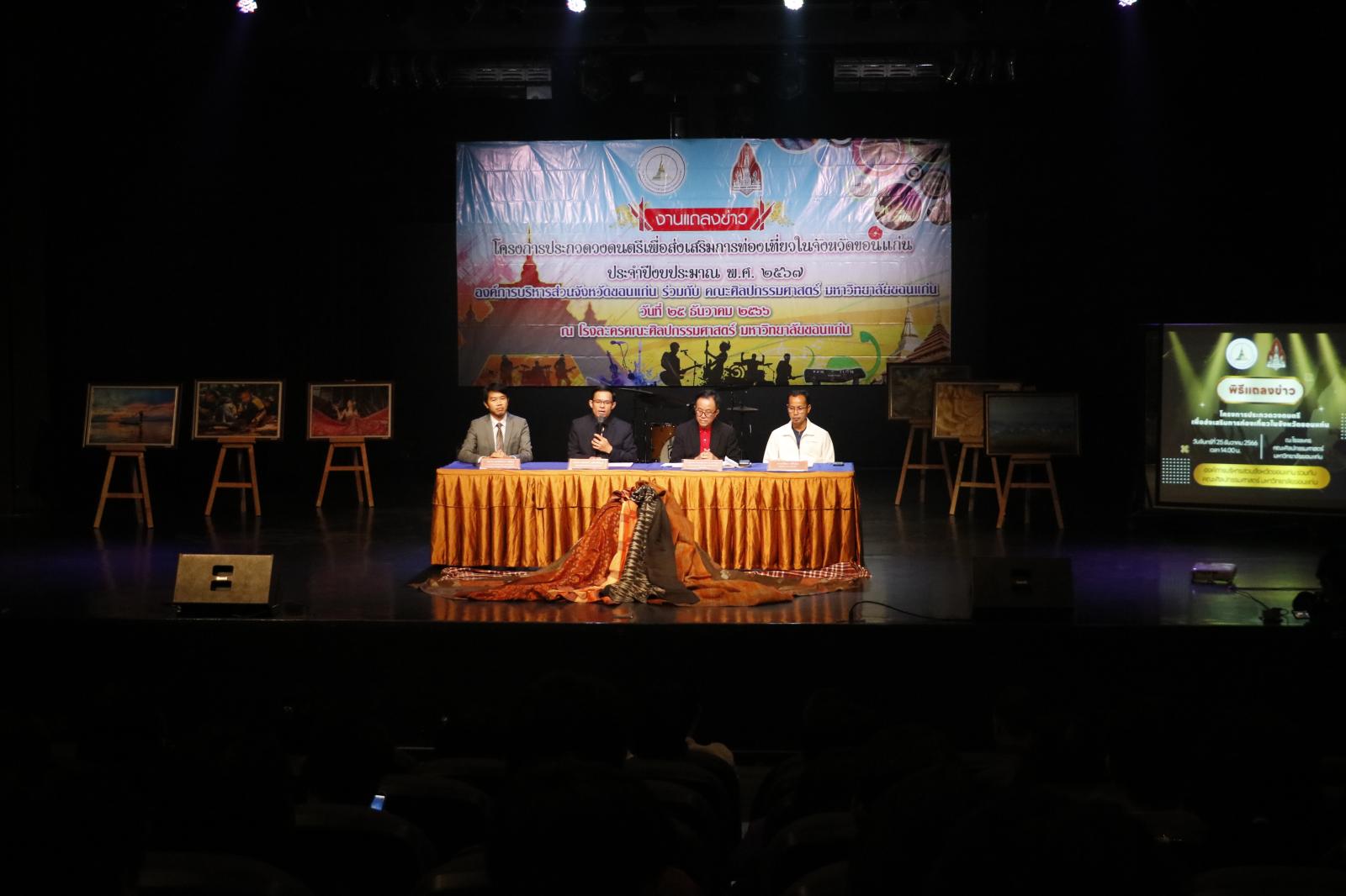 เมื่อวันที่ 25 ธันวาคม 2566 เวลา 14.00 น. องค์การบริหารส่วนจังหวัดขอนแก่น นำโดย ดร.พงษ์ศักดิ์ ตั้งวานิชกพงษ์ นายกองค์การบริหารส่วนจังหวัดขอนแก่น มอบหมายให้ นายธาดา พรหม สาขา ณ สกลนคร รองนายกองค์การบริหารส่วนจังหวัดขอนแก่น เข้าร่วมงานแถลงข่าวโครงการประกวดวงดนตรีเพื่อส่งเสริมการท่องเที่ยวในจังหวัดขอนแก่น ประจำปีงบประมาณ พ.ศ. 2567 พร้อมด้วย ผศ.ดร.บุรินทร์ เปล่งดีสกุล คณะบดีคณะศิลปกรรมศาสตร์ , ผศ.ดร.พงษ์พิทยา สัพโส อาจารย์คณะศิลปกรรมศาสตร์ และนายวิจิตร ศรีไชโย ในโอกาสนี้มี นายณณท์พัชธี กันตวธีระณัต ส.อบจ.ขอนแก่น อ.เมือง เขต 1 นายประชิต อึ้งประเสริฐ ผู้อำนวยการกองการท่องเที่ยวและกีฬา ,นายบุญมี ราญมีชัย ผู้อำนวยการส่วนบริการและเผยแพร่วิชาการ หัวหน้าส่วนราชการ นักศึกษา เยาวชนและประชาชนที่สนใจ เข้าร่วมงานแถลงข่าว ณ บริเวณหอศิลป์ มหาวิทยาลัยขอนแก่น