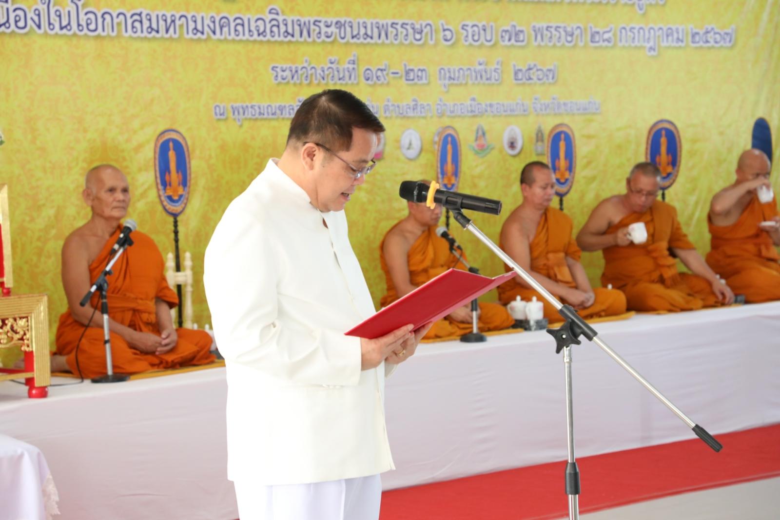 วันที่ 20 กุมภาพันธ์ ๒๕๖๗ เวลา ๐๙.๐๐ น. องค์การบริหารส่วนจังหวัดขอนแก่น นำโดย ดร.พงษ์ศักดิ์ ตั้งวานิชกพงษ์ นายกองค์การบริหารส่วนจังหวัดขอนแก่น มอบหมายให้นางบุษกร ศรีสุวรรณ์ ผู้อำนวยการส่วนส่งเสริมการศึกษา ศาสนาและวัฒนธรรม เข้าร่วมพิธีเปิดโครงการปฏิบัติธรรมเฉลิมพระเกียรติ พระบาทสมเด็จพระเจ้าอยู่หัว เนื่องในโอกาสมหามงคลเฉลิมพระชนมพรรษา ๖ รอบ ๗๒ พรรษา ๒๘ กรกฎาคม ๒๕๖๗ โดยมีนายจิรศักดิ์ สีหามาตย์ รองผู้ว่าราชการจังหวัดขอนแก่น เป็นประธานในพิธี ณ พุทธมณฑลอีสานจังหวัดขอนแก่น