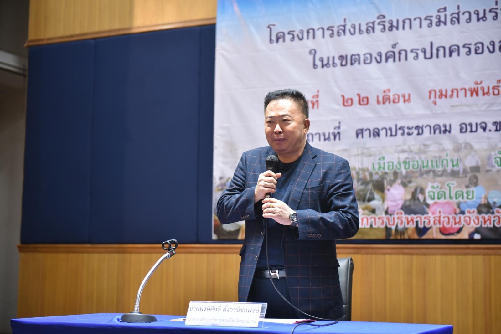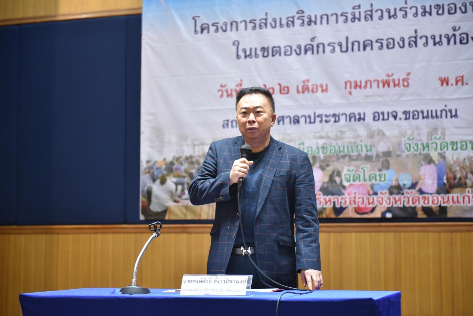 วันที่ 22 กุมภาพันธ์ 2567 เวลา 11.00 น.องค์การบริหารส่วนจังหวัดขอนแก่น ดร.พงษ์ศักดิ์ ตั้งวานิชกพงษ์ นายกองค์การบริหารส่วนจังหวัดขอนแก่น เป็นประธานเปิดโครงการส่งเสริมการมีส่วนร่วมของประชาชนในเขตองค์กรปกครองส่วนท้องถิ่น อ.เมืองขอนแก่น เขต 2 และ เขต4 จำนวน 400 คน โอกาสนี้มี นายสิทธิกุล ภูคำวงศ์ รอง นายก อบจ.ขอนแก่น, นายเพ็ชร มูลป้อม ที่ปรึกษานายก อบจ.ขอนแก่น ,นางอัญชลี เฟื่องทอง และ นายจรูญ อ่วยนอก รองประธานสภา อบจ.ขอนแก่น พร้อมด้วย นายวุฒิพร ศรีมังกรแก้ว ส.อบจ.ขอนแก่น อ.เมือง เขต 2 ,นายยุทธนา ชูพันธ์ ส.อบจ.ขอนแก่น อ.เมือง เขต 6 ผู้นำท้องที่ ผู้นำท้องถิ่น และคณะผู้บริหาร หัวหน้าส่วนราชการ เจ้าหน้าที่ อบจ.ขอนแก่น ร่วมเป็นเกียรติในพิธี ณ ศาลาประชาคมองค์การบริหารส่วนจังหวัดขอนแก่น