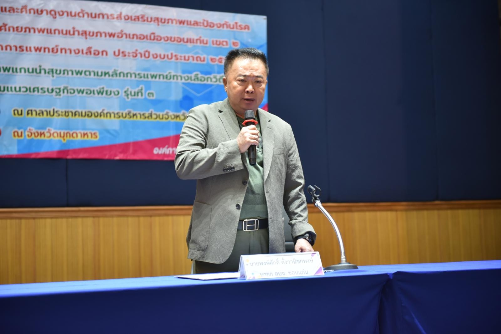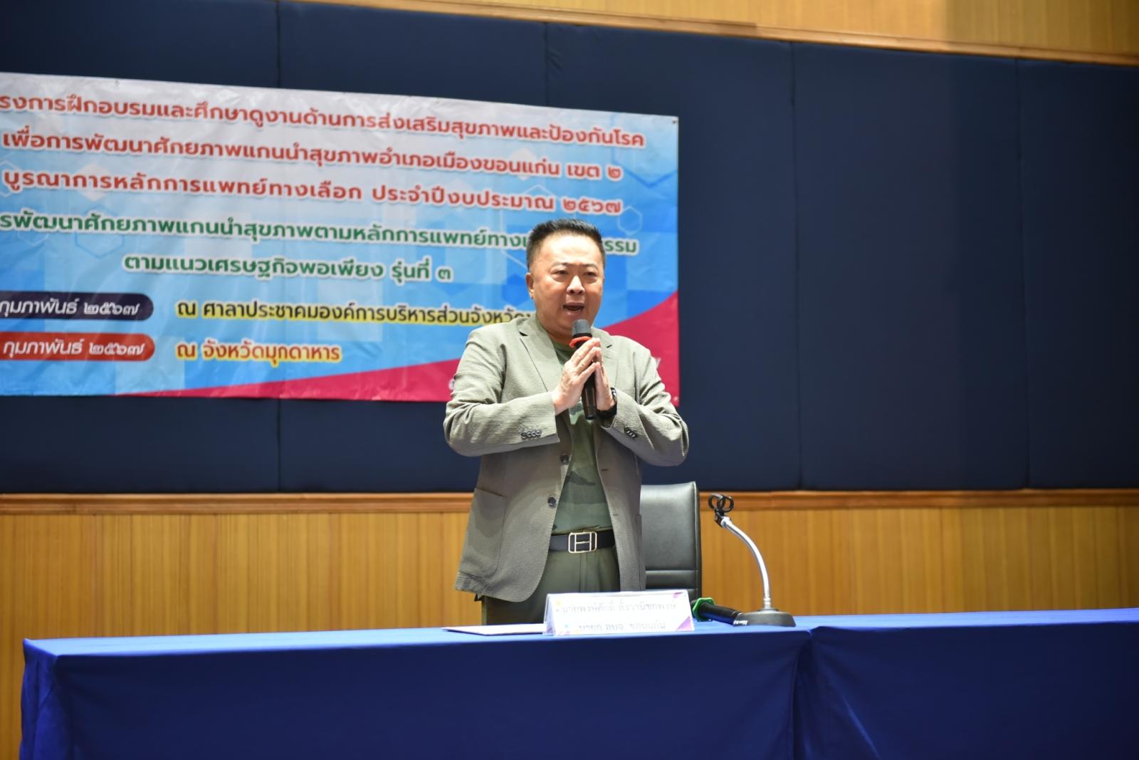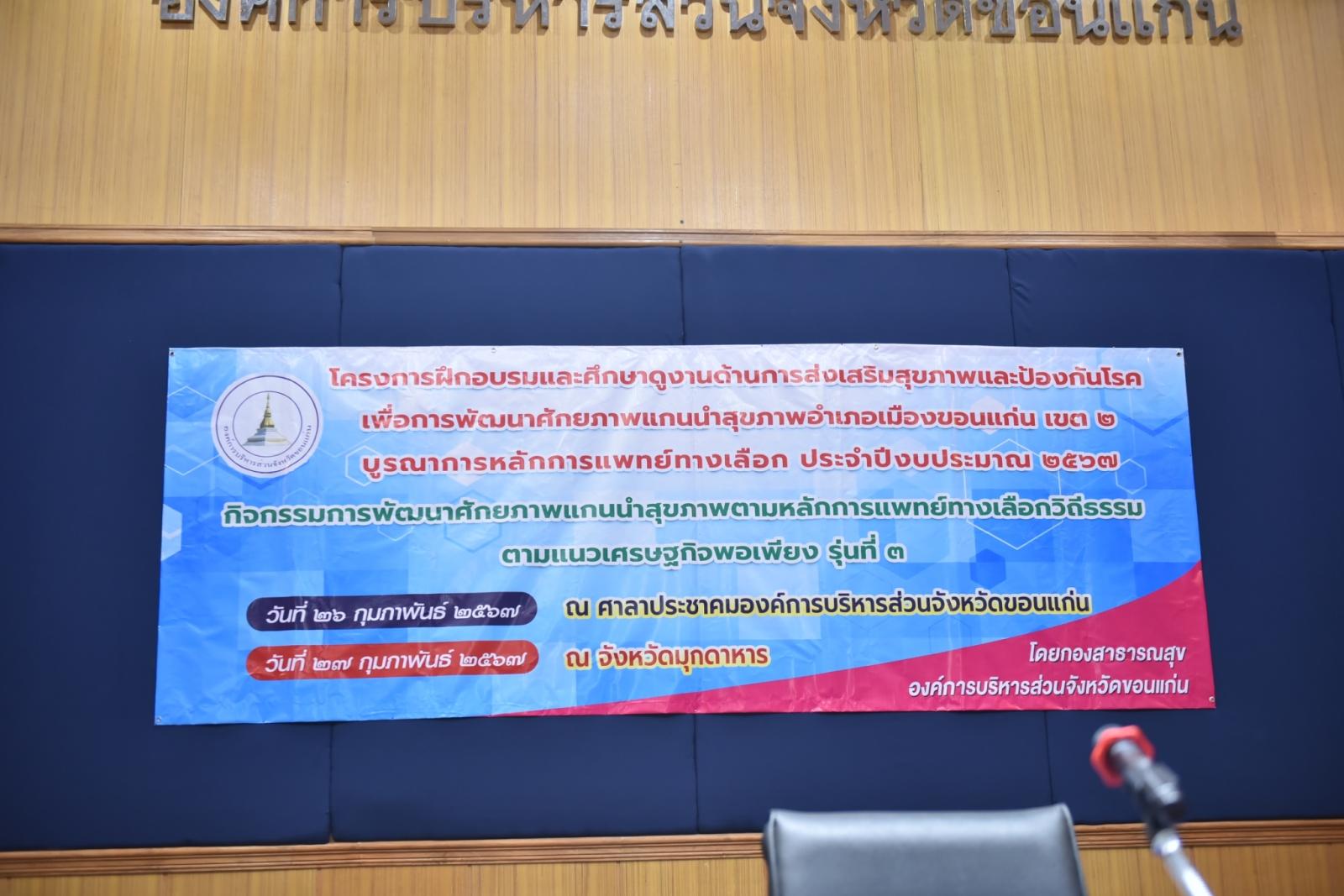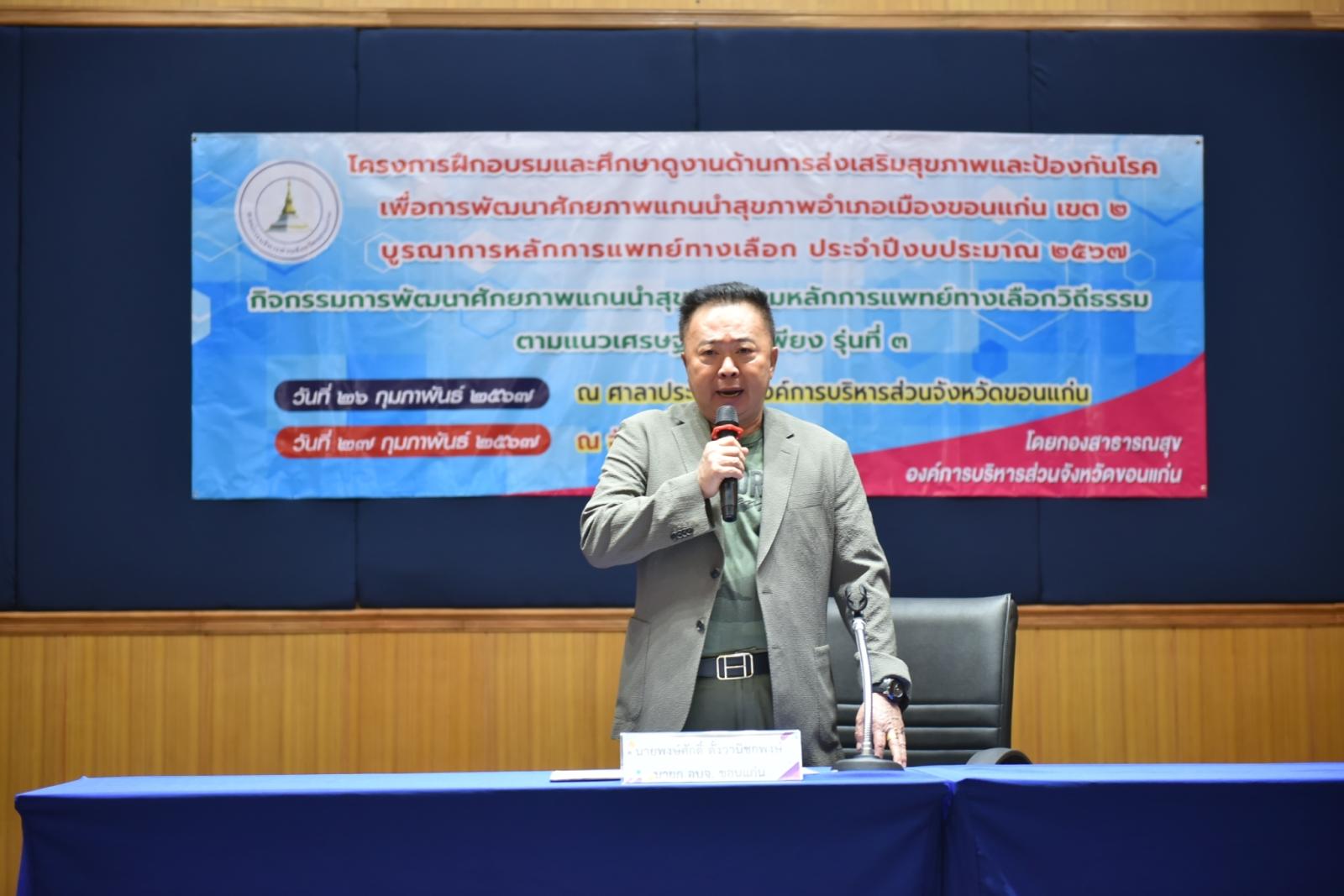 วันที่ 26 กุมภาพันธ์ 2567 เวลา 11.30 น. องค์การบริหารส่วนจังหวัดขอนแก่น นำโดย ดร.พงษ์ศักดิ์ ตั้งวานิชกพงษ์ นายกองค์การบริหารส่วนจังหวัดขอนแก่น เป็นประธานเปิดโครงการฝึกอบรมและศึกษาดูงานด้านการส่งเสริมสุขภาพและป้องกันโรคเพื่อการพัฒนาแกนนำสุขภาพอำเภอเมืองเขต 2 บูรณาการหลักการแพทย์ทางเลือก ประจำปีงบประมาณ 2567 กิจกรรมการพัฒนาศักยภาพแกนนำตามหลักการแพทย์ทางเลือกวิถีธรรมตามแนวเศรษฐกิจพอเพียง รุ่นที่ 3โดยมี น.ส.นิศากร ดอนกระสินธุ์ ผู้อำนวยการกองสาธารณสุข กล่าวรายงาน ในโอกาสนี้มี นายวุฒิพร ศรีมังกรแก้ว ส.อบจ.ขอนแก่น อ.เมือง เขต 2, นางอาซีซะห์ ว่องไวรองปลัดองค์การบริหารส่วนจังหวัดขอนแก่น พร้อมด้วย ผู้นำท้องที่ ผู้นำท้องถิ่น และคณะผู้บริหาร หัวหน้าส่วนราชการ เจ้าหน้าที่ อบจ.ขอนแก่น ร่วมเป็นเกียรติในพิธี ณ ศาลาประชาคมองค์การบริหารส่วนจังหวัดขอนแก่น