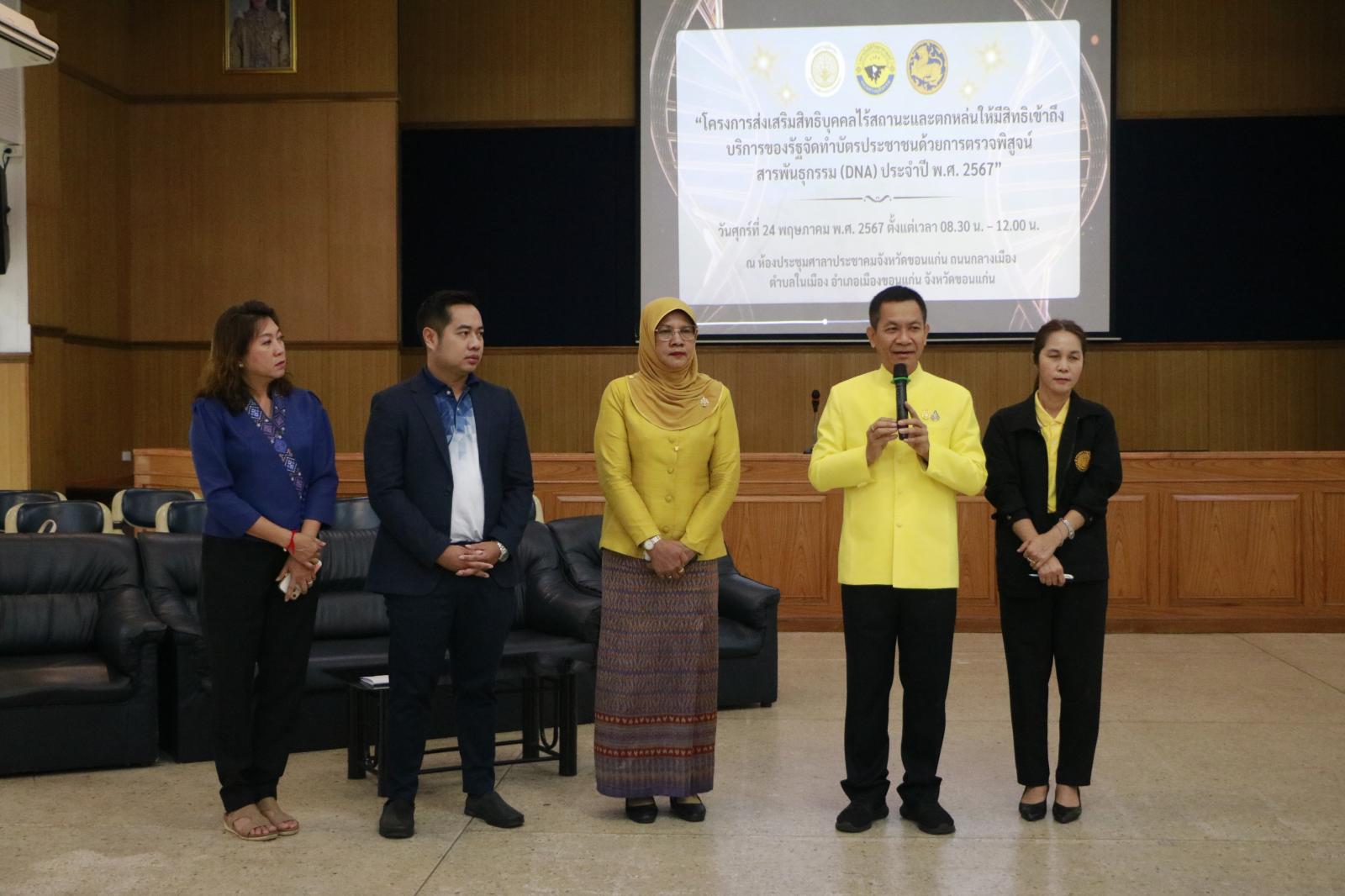 เมื่อวันที่ 24 พฤษภาคม 2567 เวลา 09:00 น. องค์การบริหารส่วนจังหวัดขอนแก่น นำโดยดร.พงษ์ศักดิ์ ตั้งวานิชกพงษ์ นายกองค์การบริหารส่วนจังหวัดขอนแก่น มอบหมายให้ นางอาซีซะห์ ว่องไว รองปลัดองค์การบริหารส่วนจังหวัดขอนแก่น เข้าร่วม โครงการส่งเสริมสิทธิบุคคลไร้สถานะและตกหล่นให้มีสิทธิเข้าถึงบริการของรัฐจัดทำบัตรประชาชนด้วยการตรวจพิสูจน์สารพันธุกรรม (DNA) ประจำปี พ.ศ.2567 โดยมี นายพันธุ์เทพ เสาโกศล รองผู้ว่าราชการจังหวัดขอนแก่น ได้ร่วมเป็นเกียรติและพบปะให้กำลังใจผู้เข้าร่วมโครงการดังกล่าว พร้อมด้วยข้าราชการเจ้าหน้าที่จากสำนักงานยุติธรรมจังหวัดขอนแก่น และสถาบันนิติวิทยาศาสตร์ กระทรวงยุติธรรม ณ ศาลาประชาคมจังหวัดขอนแก่น อำเภอเมือง จังหวัดขอนแก่น