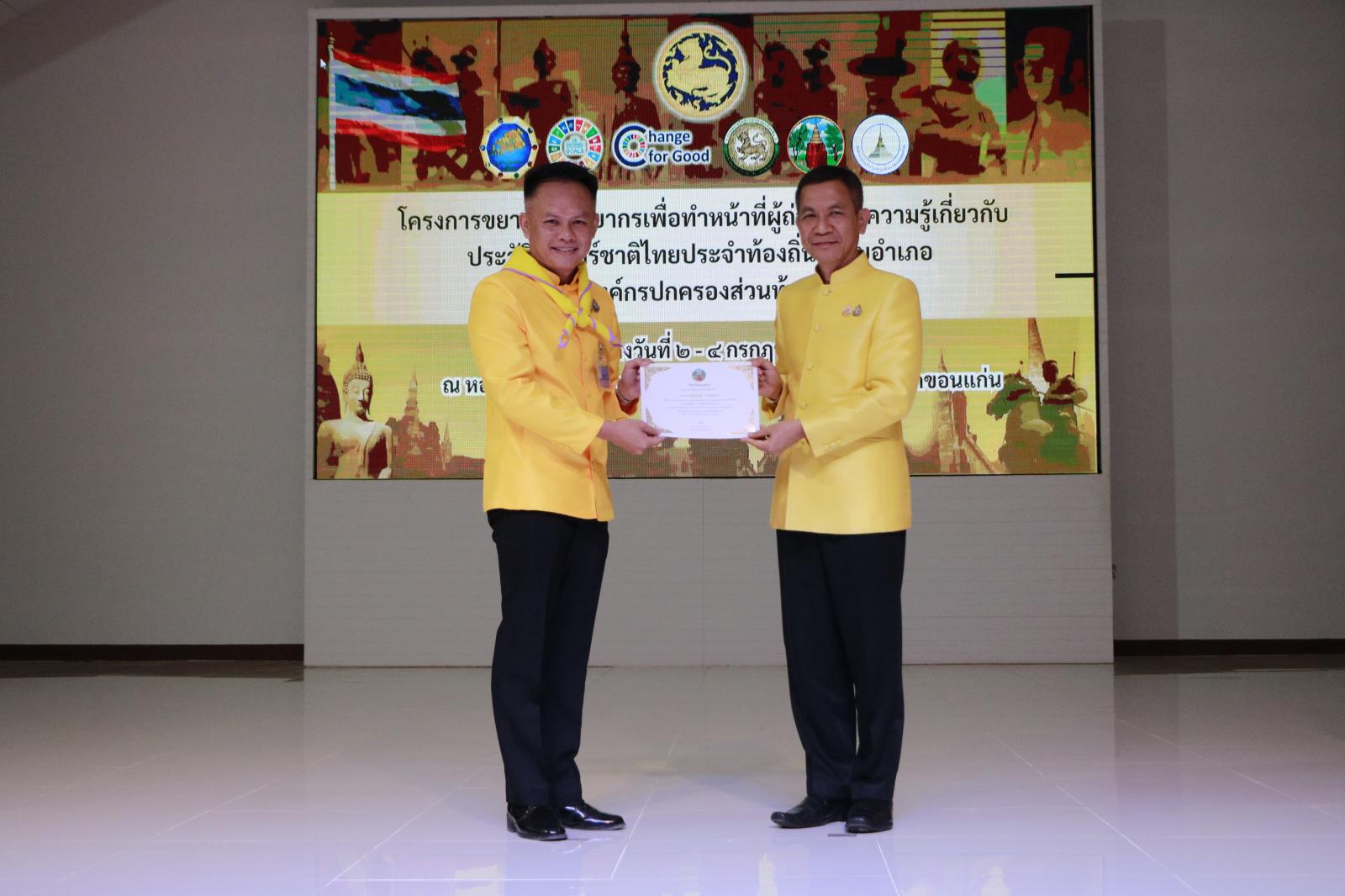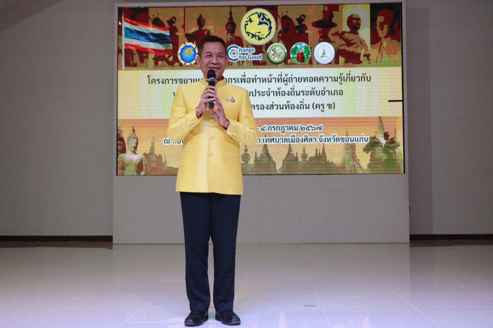 วันที่ 4 กรกฎาคม 2567 เวลา 16.00 ดร.พงษ์ศักดิ์ ตั้งวานิชกพงษ์ นายกองค์การบริหารส่วนจังหวัดขอนแก่น มอบหมายให้ ว่าที่ร้อยเอกพงเจตน์ พรกุณา ปลัดองค์การบริหารส่วนจังหวัดขอนแก่น เข้าร่วมเป็นเกียรติในพิธีมอบใบประกาศนียบัตรผู้เข้าร่วมโครงการอบรมเชิงปฏิบัติการขยายผลวิทยากรเพื่อทำหน้าที่ผู้ถ่ายทอดความรู้เกี่ยวกับประวัติศาสตร์ชาติไทยประจำท้องถิ่นระดับอำเภอ (ครู ข) จังหวัดขอนแก่น พร้อมด้วย นายนำศิลป์ วิเศษ ผู้อำนวยการสำนักการศึกษา ศาสนาและวัฒนธรรม นายกิตติชัย อุทธา ผู้อำนวยการส่วนบริหารการศึกษา ในการนี้ นายพันธ์เทพ เสาโกศล รองผู้ว่าราชการจังหวัดขอนแก่น เป็นประธานในพิธีมอบใบประกาศนียบัตรดังกล่าว นายโชคชัย ศรีหิรัญรัตน์ ท้องถิ่นจังหวัดขอนแก่น เข้าร่วมเป็นเกียรติในพิธีมอบใบประกาศนียบัตร ณ หอประชุมยอดขวัญ เทศบาลเมืองศิลา อำเภอเมือง จังหวัดขอนแก่น