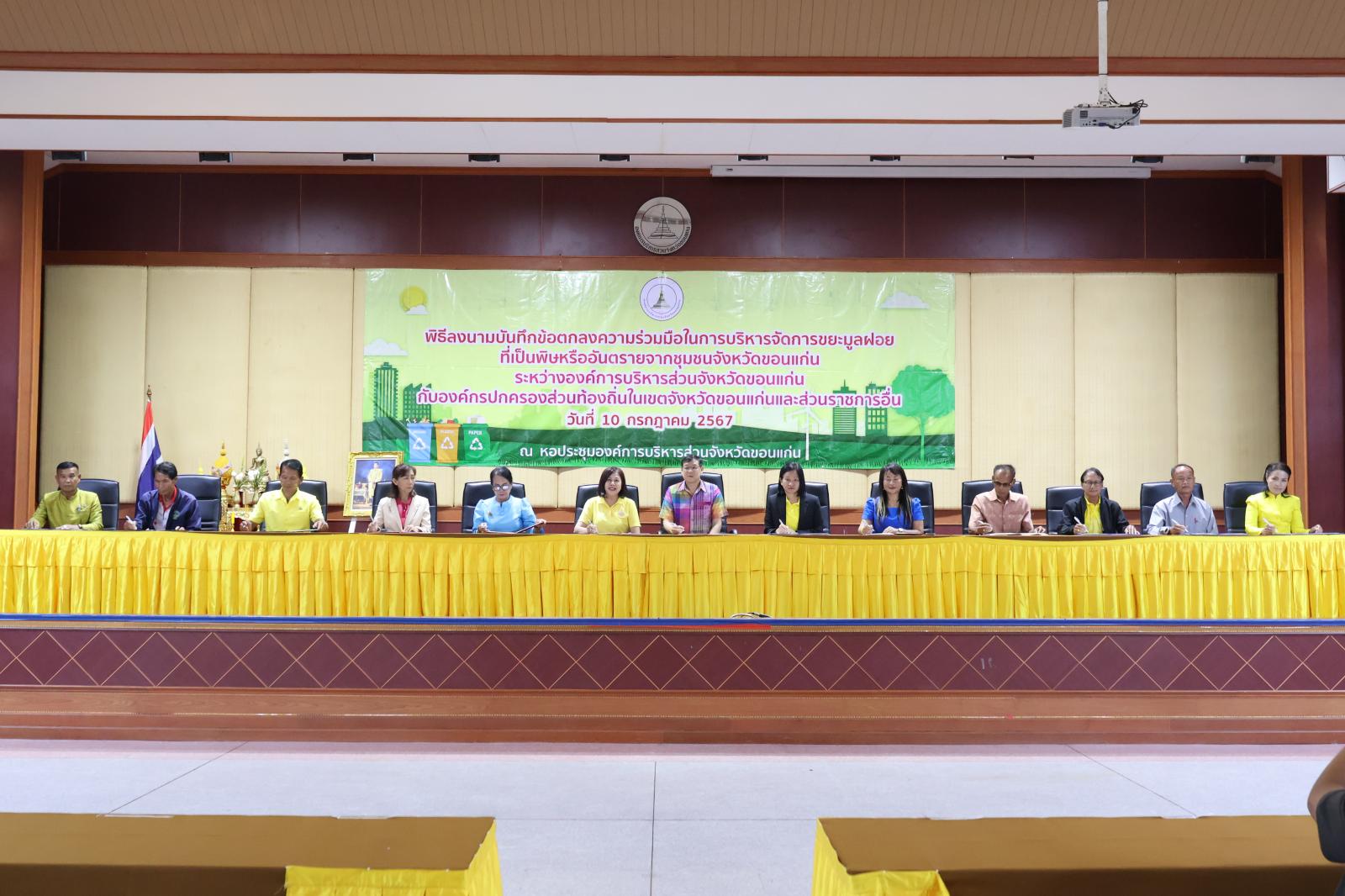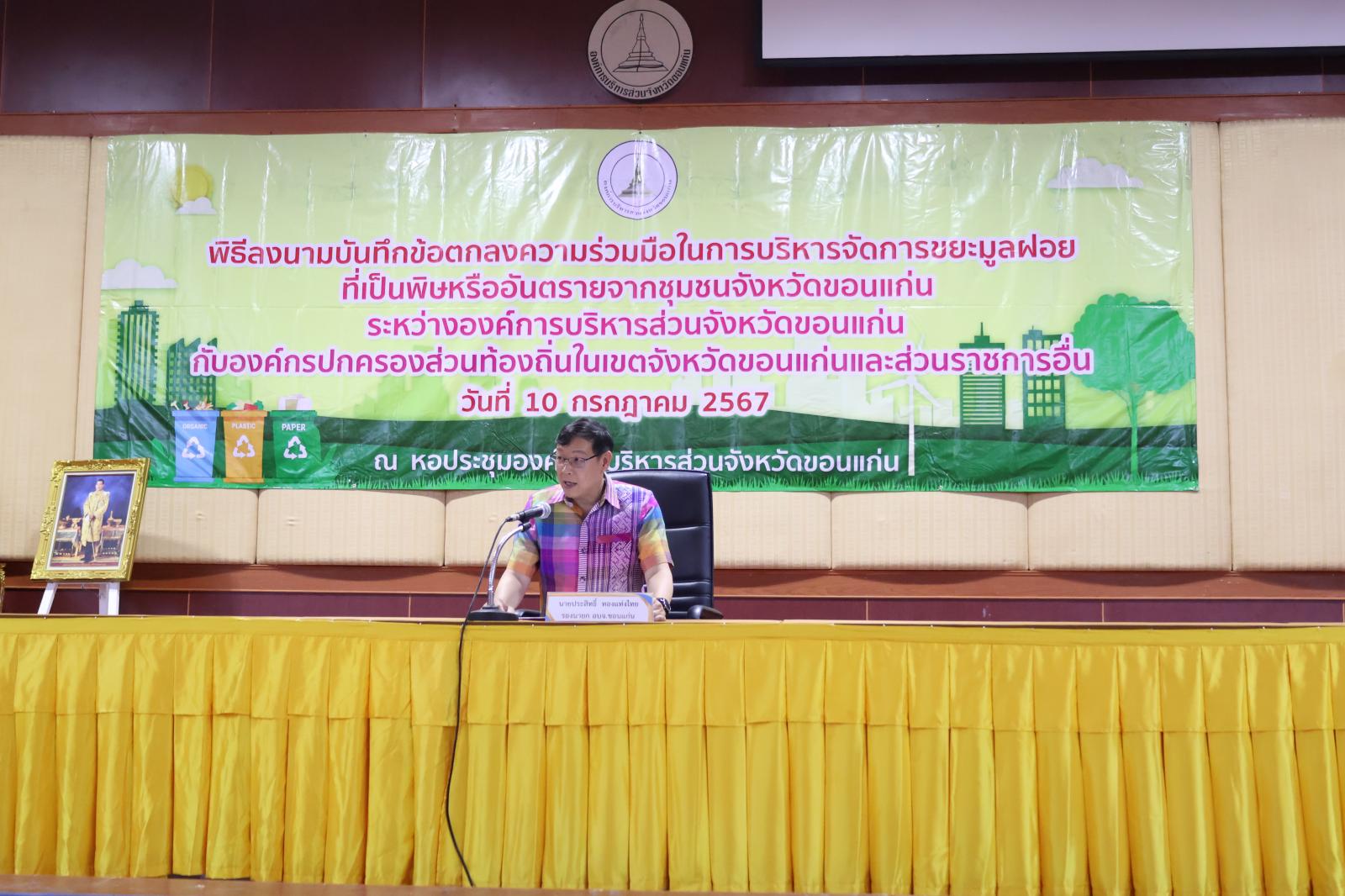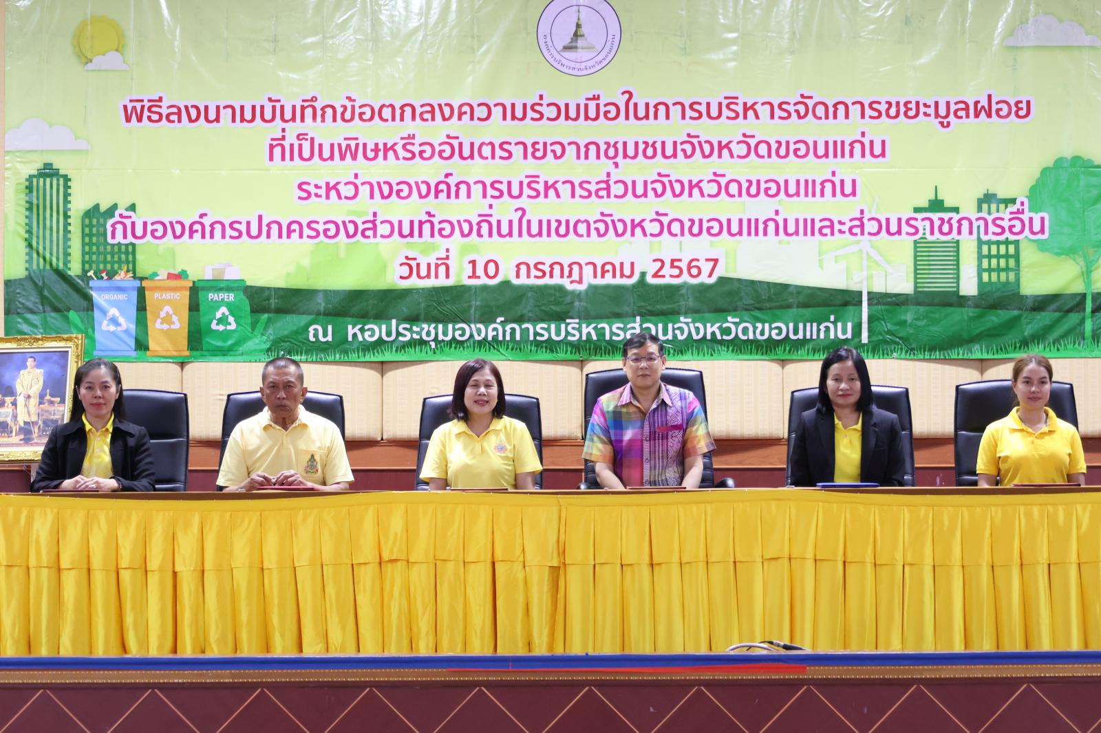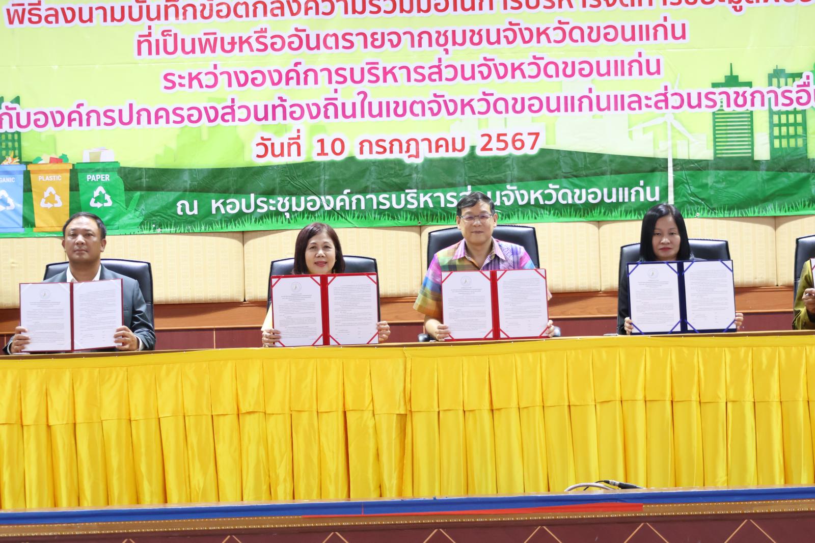 เมื่อวันที่ 10 กรกฎาคม 2567 เวลา 13.30 น. องค์การบริหารส่วนจังหวัดขอนแก่น นำโดย ดร.พงษ์ศักดิ์ ตั้งวานิชกพงษ์ นายกองค์การบริหารส่วนจังหวัดขอนแก่น มอบหมายให้ นายประสิทธิ์ ทองแท่งไทย รองนายกองค์การบริหารส่วนจังหวัดขอนแก่น เป็นประธานในพิธีลงนามบันทึกข้อตกลงว่าด้วยความร่วมมือในการบริหารจัดการขยะมูลฝอยที่เป็นพิษหรืออันตรายจากชุมชนจังหวัดขอนแก่น ระหว่างองค์การบริหารส่วนจังหวัดขอนแก่น กับองค์กรปกครองส่วนท้องถิ่นและส่วนราชการอื่นจำนวน 225 แห่ง โดยมี นางสาวนิศากร ดอนกระสินธุ์ ผู้อำนวยการกองสาธารณสุข กล่าวรายงาน ในโอกาสนี้มี นางอาซีซะ ว่องไว รองปลัดองค์การบริหารส่วนจังหวัดขอนแก่น นายอัครพงษ์ เขียวแจ่ม ผู้อำนวยการสำนักงานทรัพยากรธรรมชาติและสิ่งแวดล้อม นางศริญญา วิถีเทพ ผู้อำนวยการกลุ่มงานบริการสาธารณภัยท้องถิ่น นายบุญมี ราญมีชัยผู้อำนวยการส่วนบริการและเผยแพร่วิชาการสำนักยุทธศาสตร์และงบประมาณ ข้าราชการและเจ้าหน้าที่ อบจ.ขอนแก่น เข้าร่วมเป็นเกียรติในพิธี ณ หอประชุมองค์การบริหารส่วนจังหวัดขอนแก่น อ.เมือง จ.ขอนแก่น