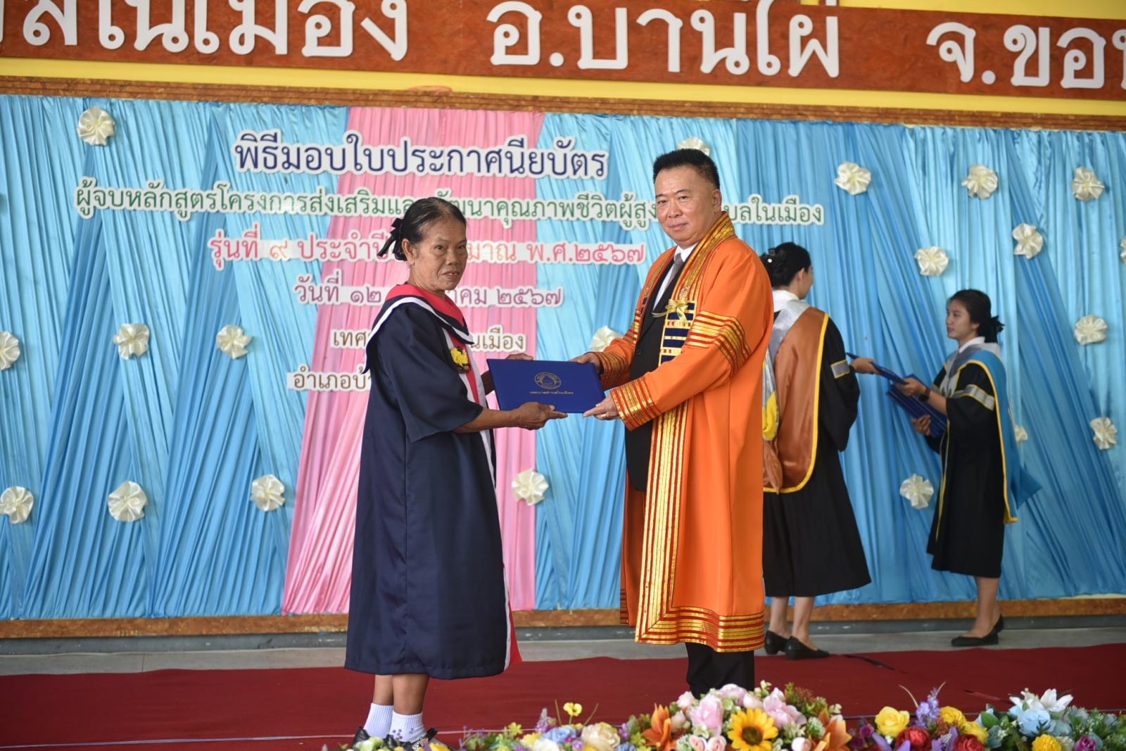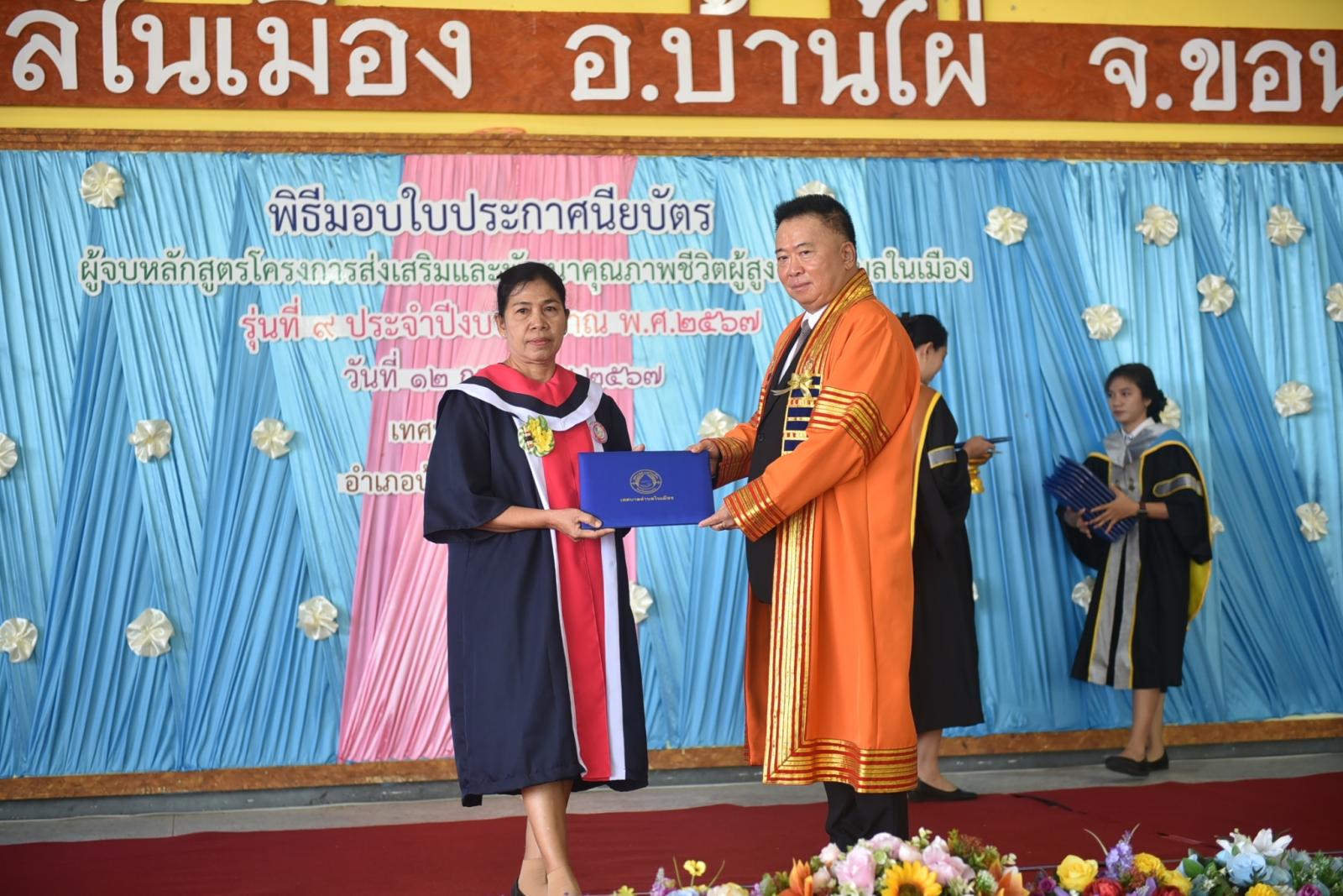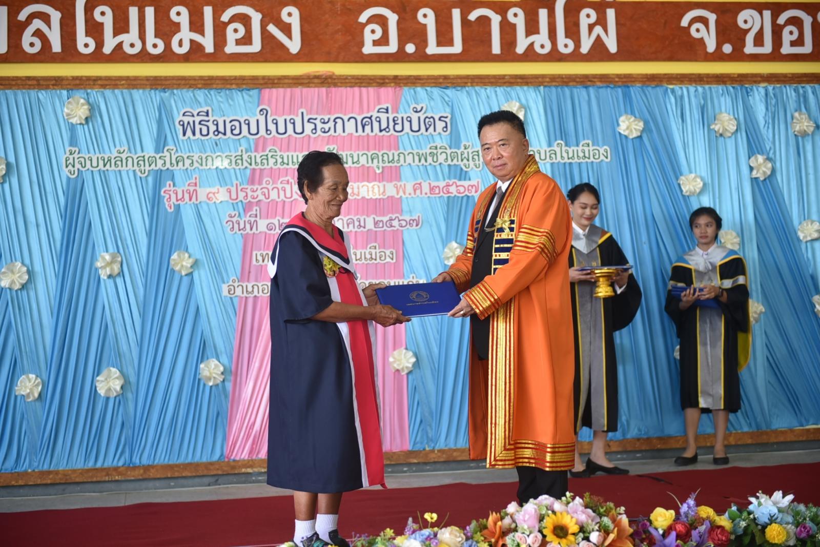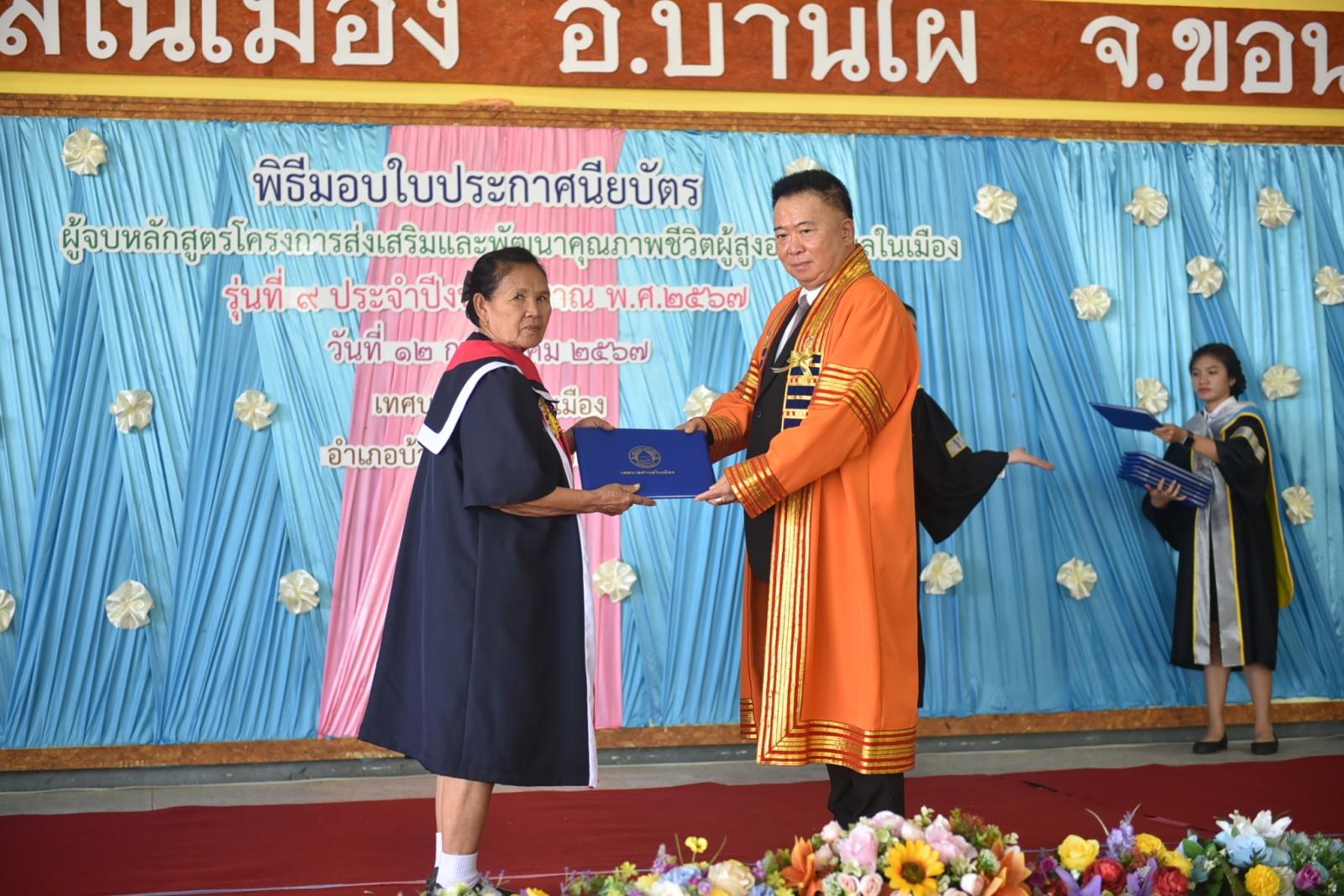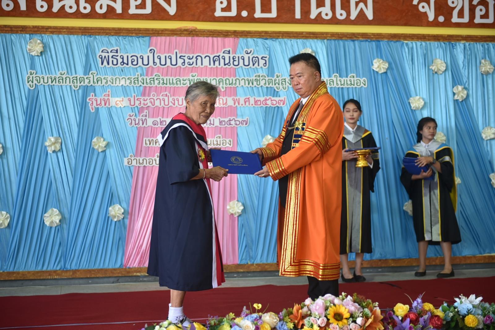 พิธีมอบประกาศนียบัตรให้แก่ผู้สูงอายุที่จบหลักสูตร ตามโครงการส่งเสริมและพัฒนาคุณภาพชีวิตผู้สูงอายุตำบลในเมือง รุ่นที่9 ประจำปีงบประมาณ 2567