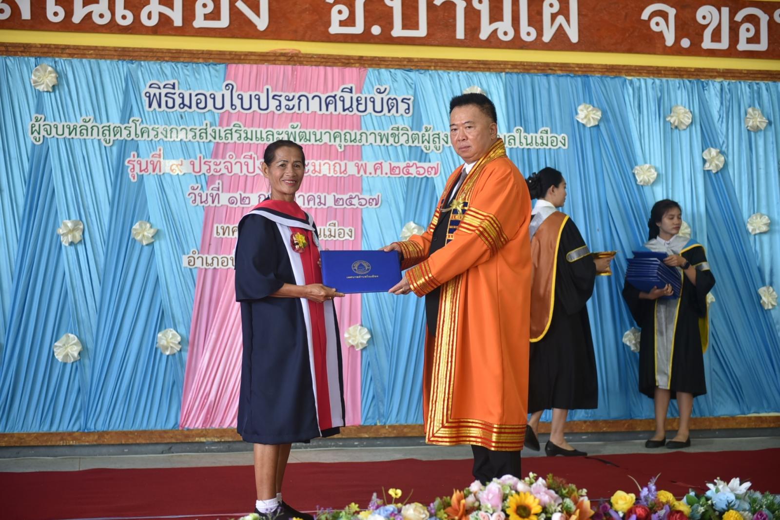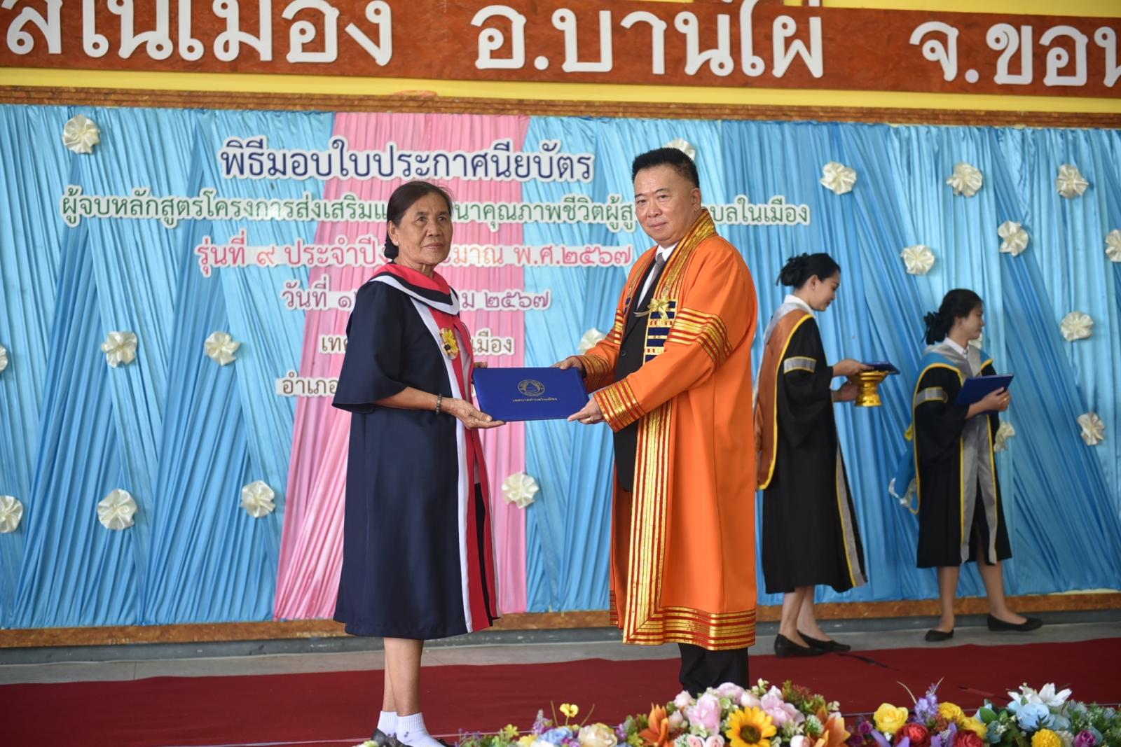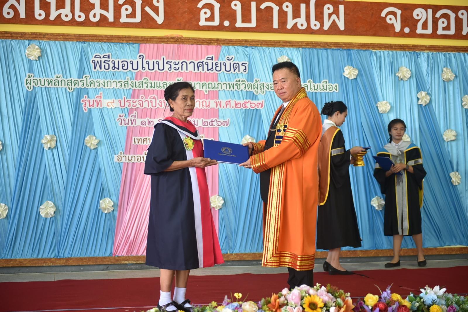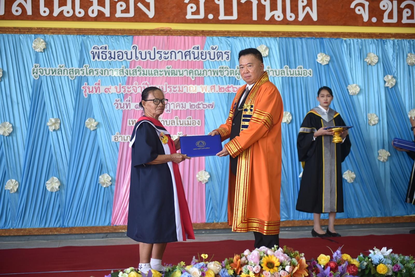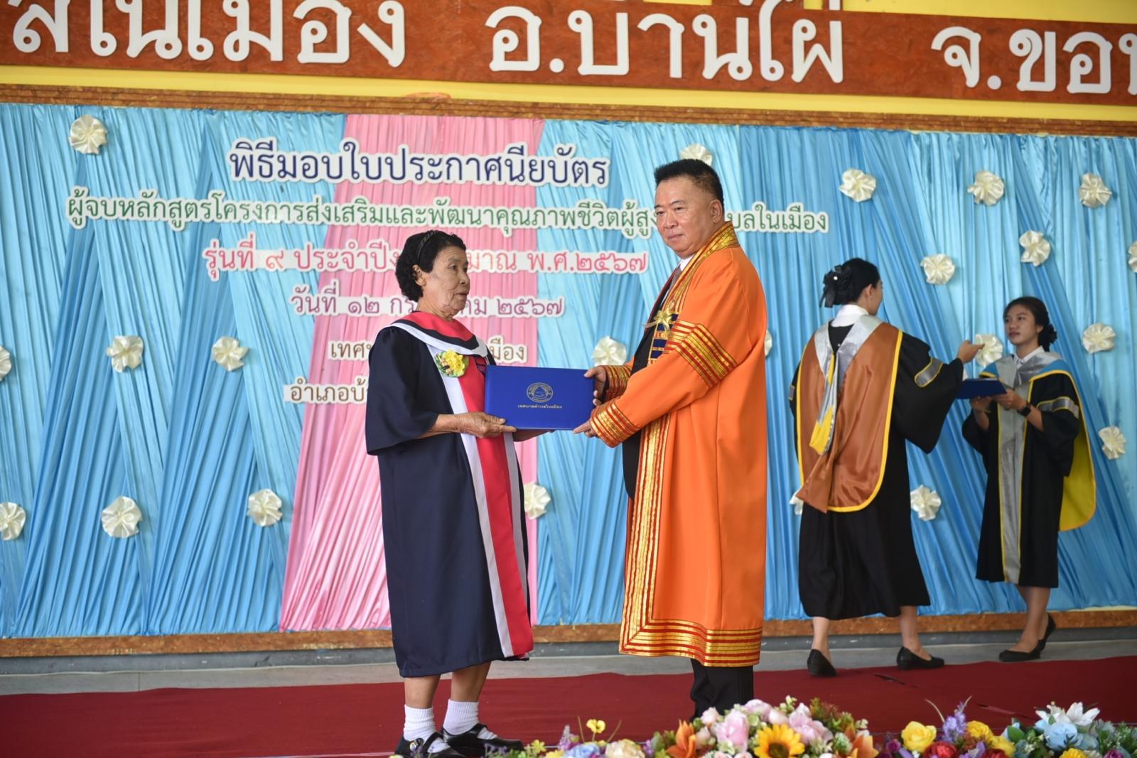 พิธีมอบประกาศนียบัตรให้แก่ผู้สูงอายุที่จบหลักสูตร ตามโครงการส่งเสริมและพัฒนาคุณภาพชีวิตผู้สูงอายุตำบลในเมือง รุ่นที่9 ประจำปีงบประมาณ 2567