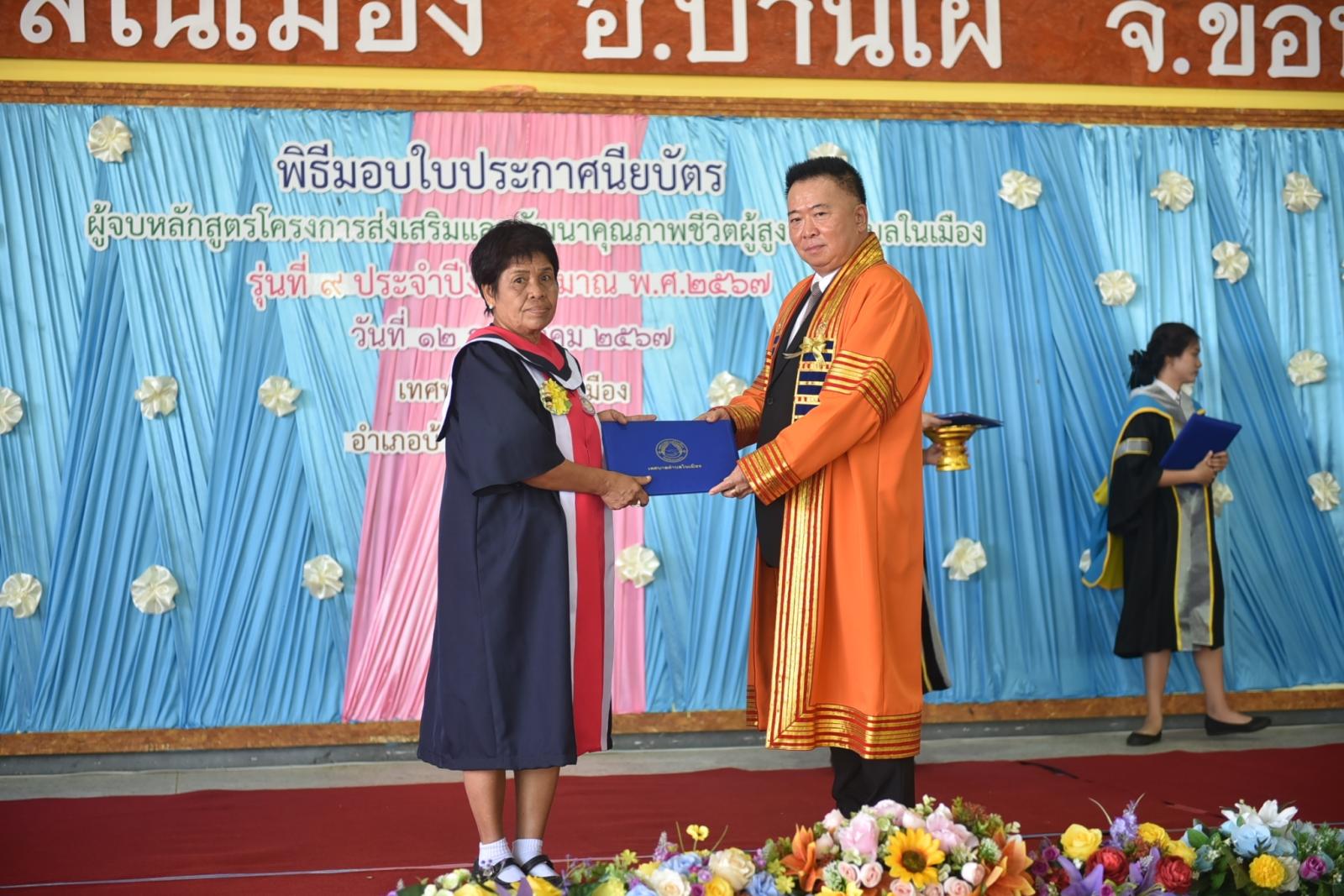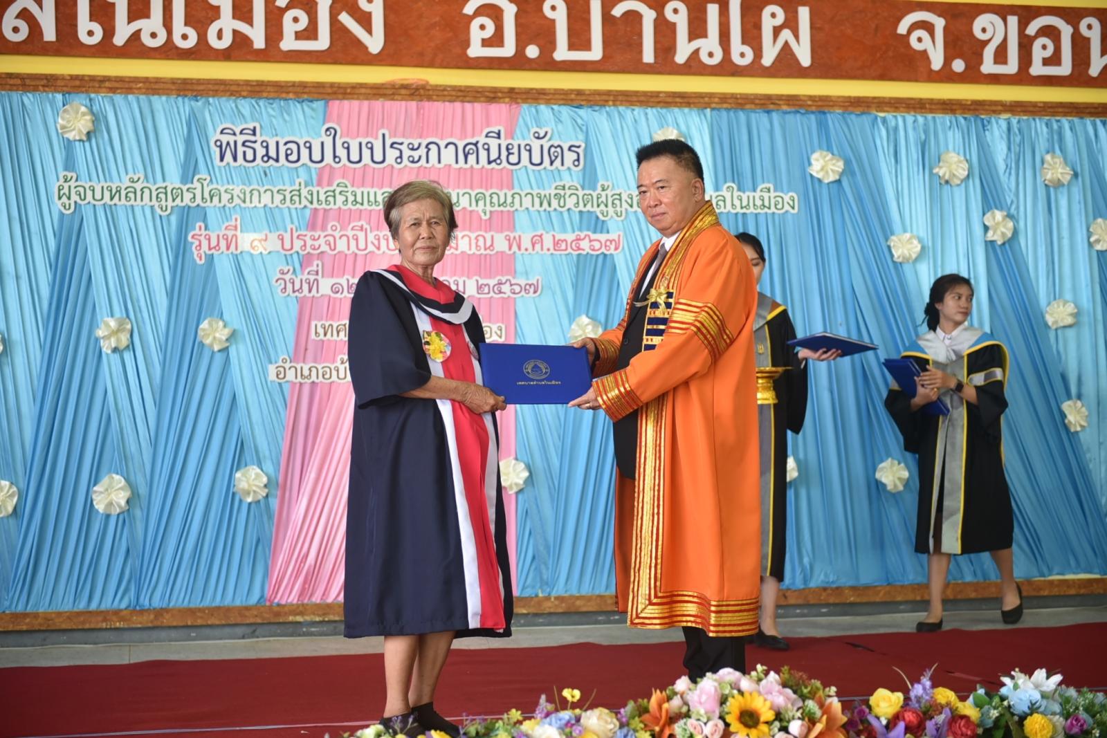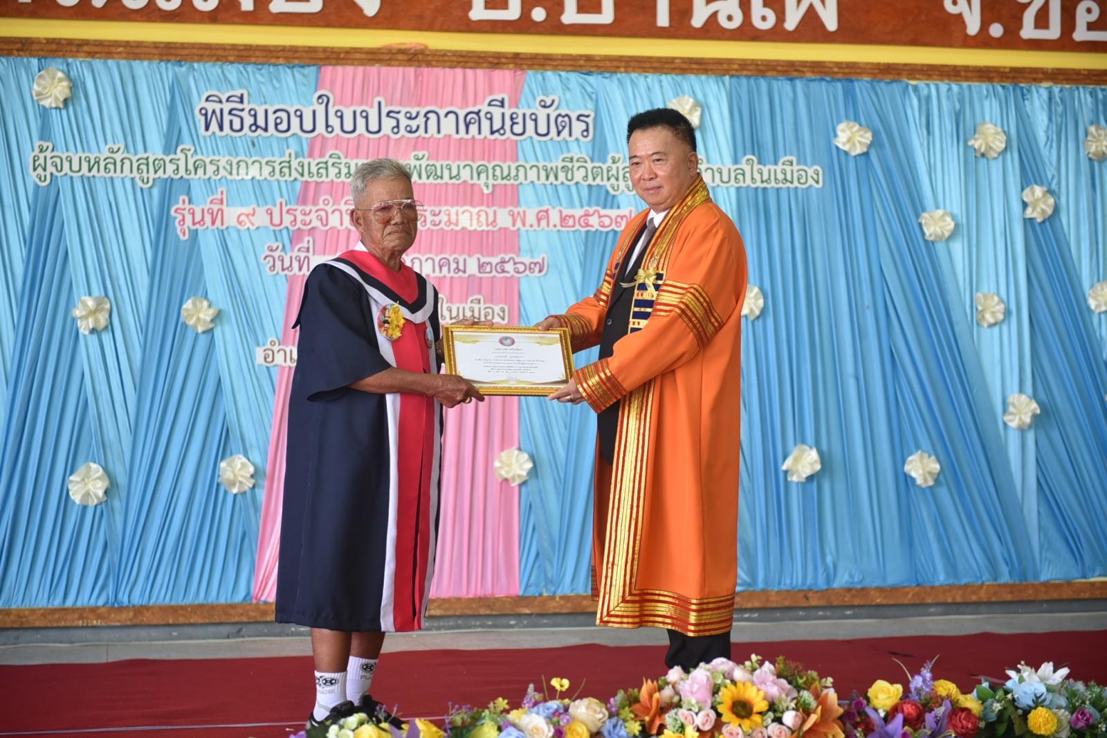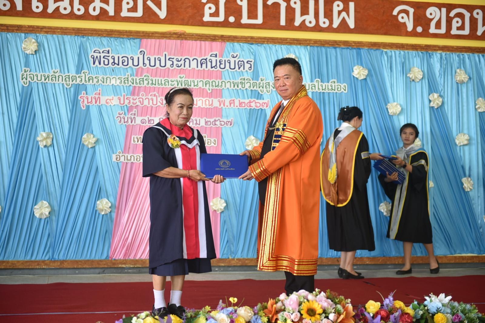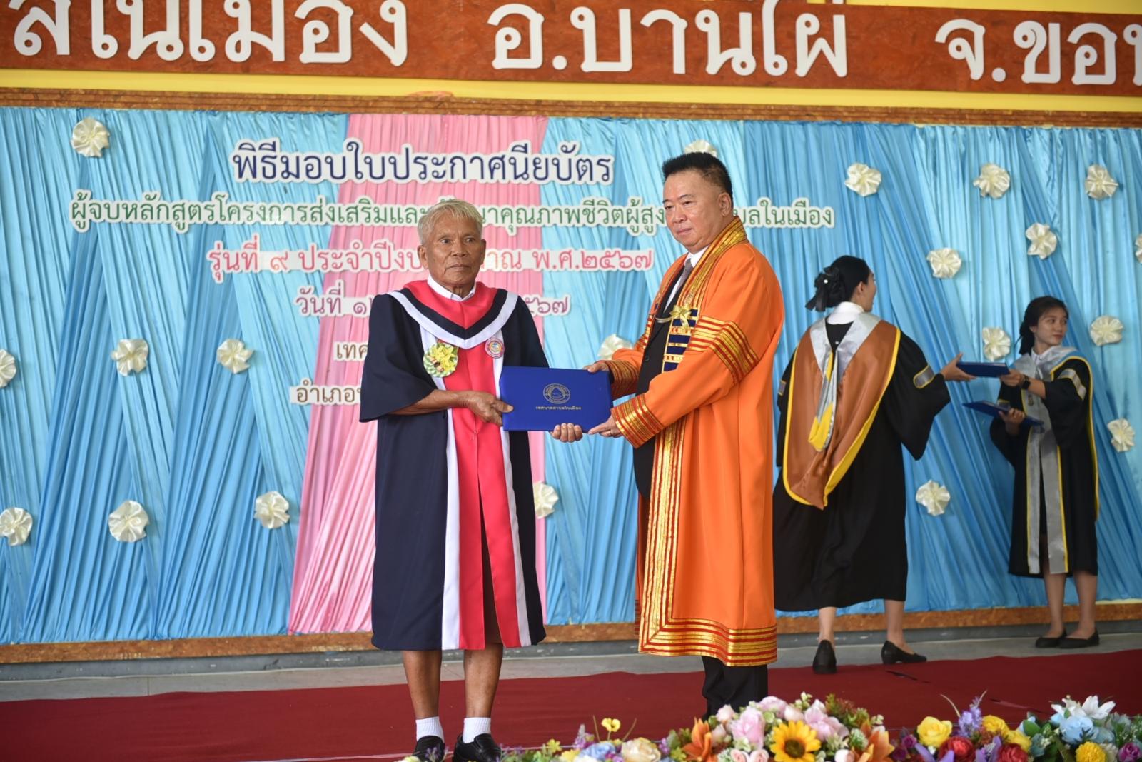 พิธีมอบประกาศนียบัตรให้แก่ผู้สูงอายุที่จบหลักสูตร ตามโครงการส่งเสริมและพัฒนาคุณภาพชีวิตผู้สูงอายุตำบลในเมือง รุ่นที่9 ประจำปีงบประมาณ 2567