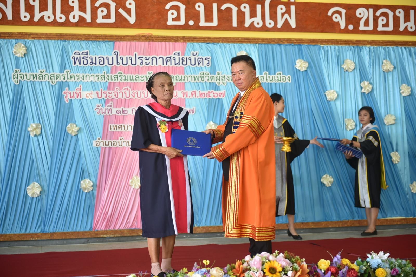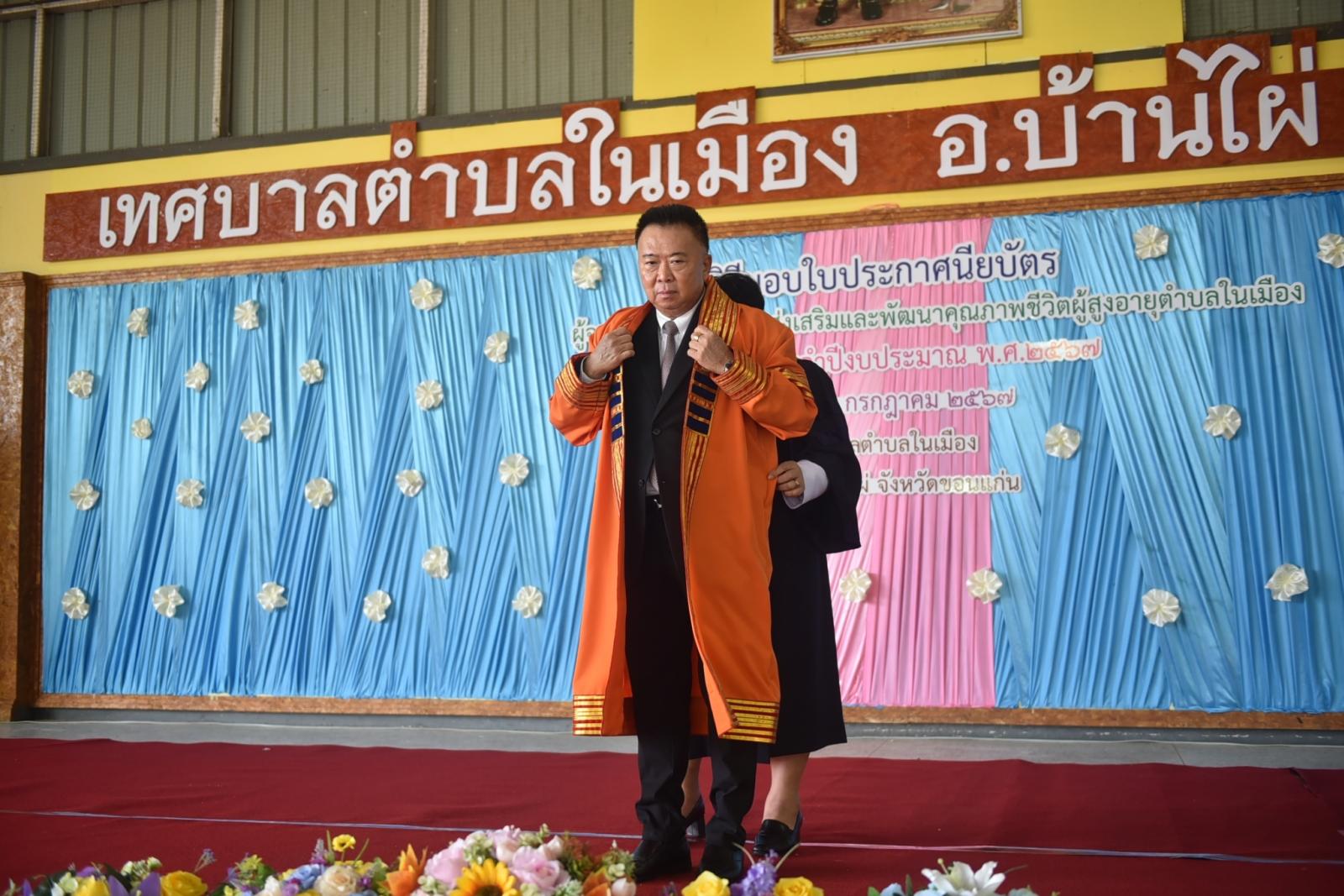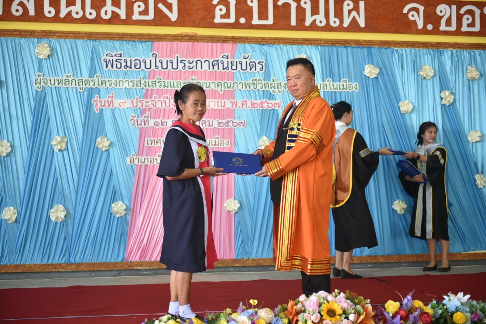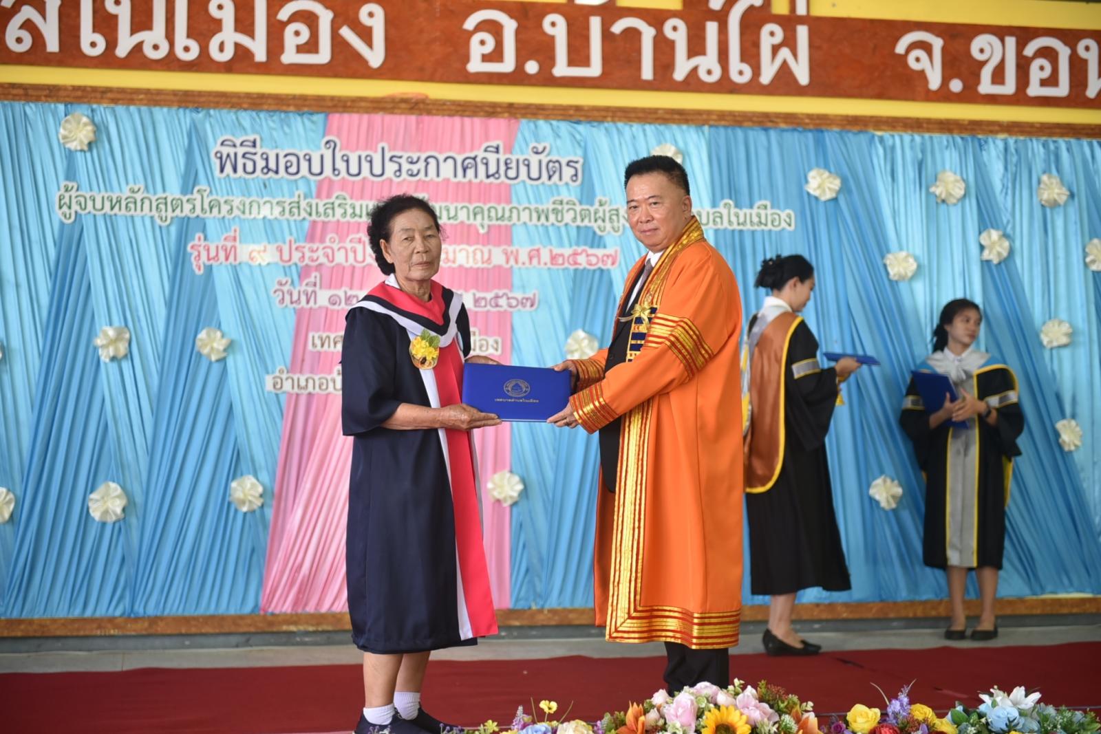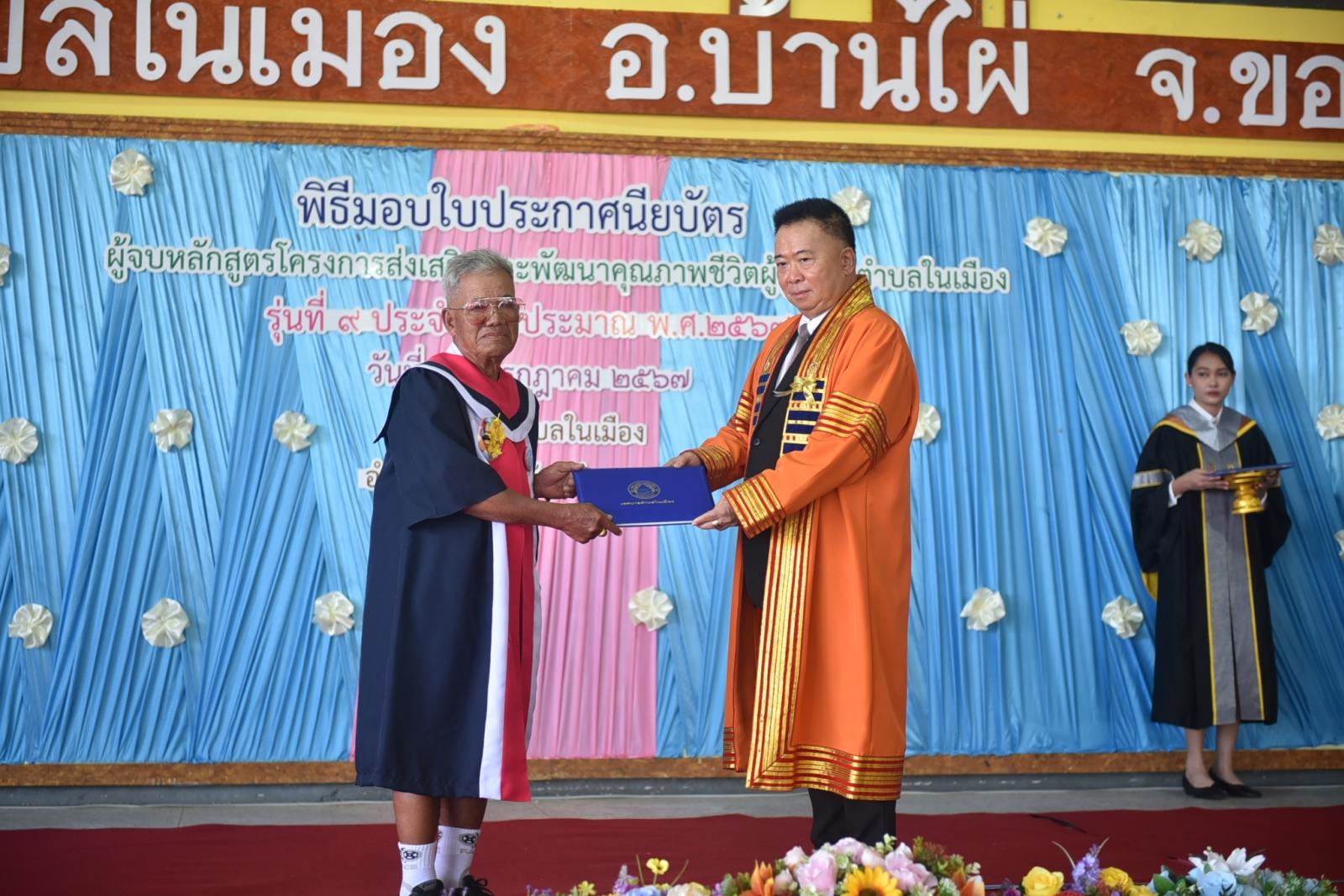 พิธีมอบประกาศนียบัตรให้แก่ผู้สูงอายุที่จบหลักสูตร ตามโครงการส่งเสริมและพัฒนาคุณภาพชีวิตผู้สูงอายุตำบลในเมือง รุ่นที่9 ประจำปีงบประมาณ 2567