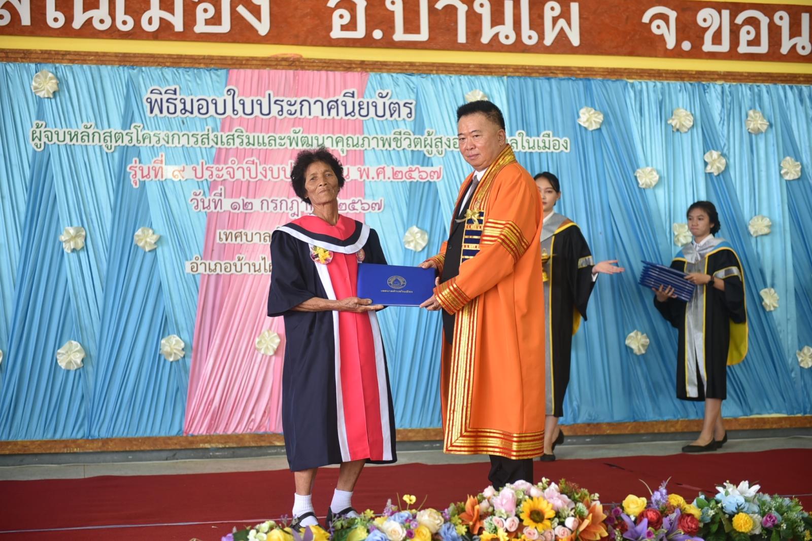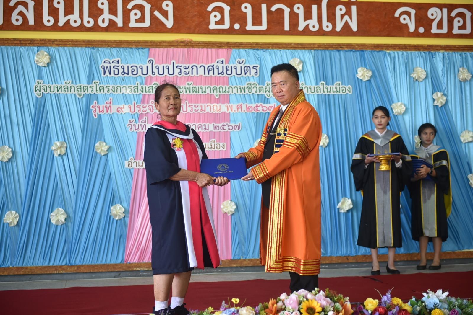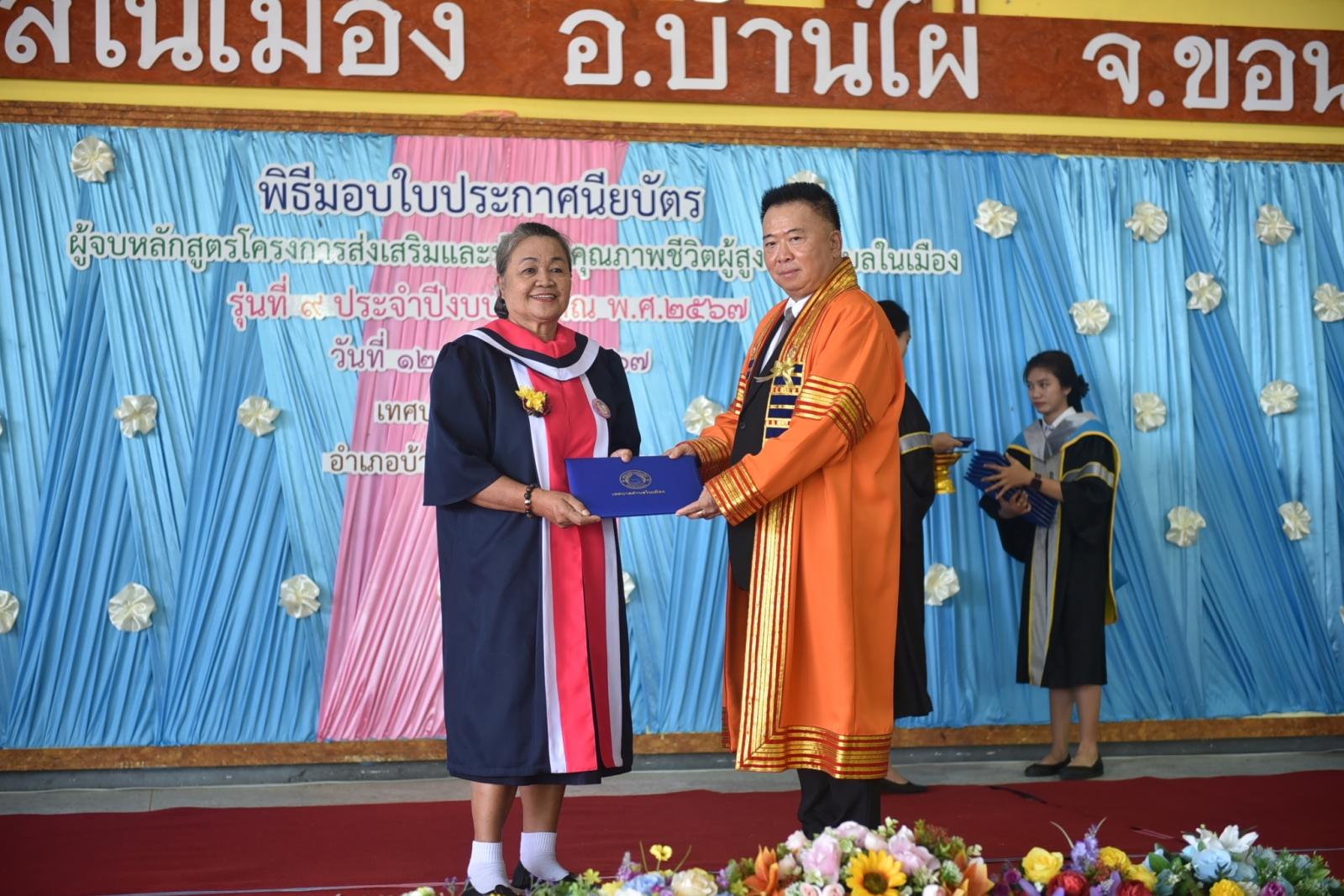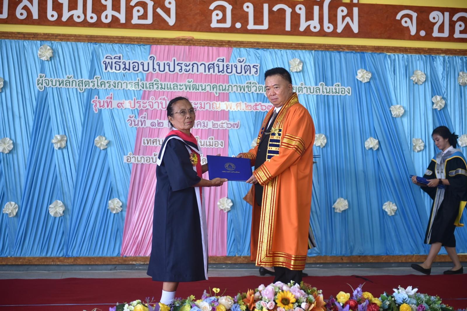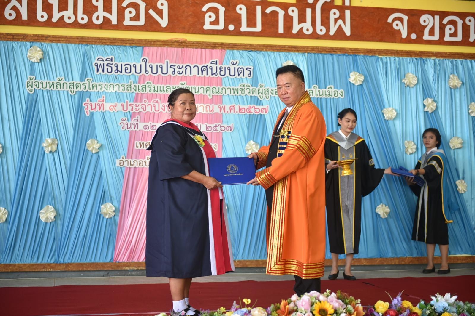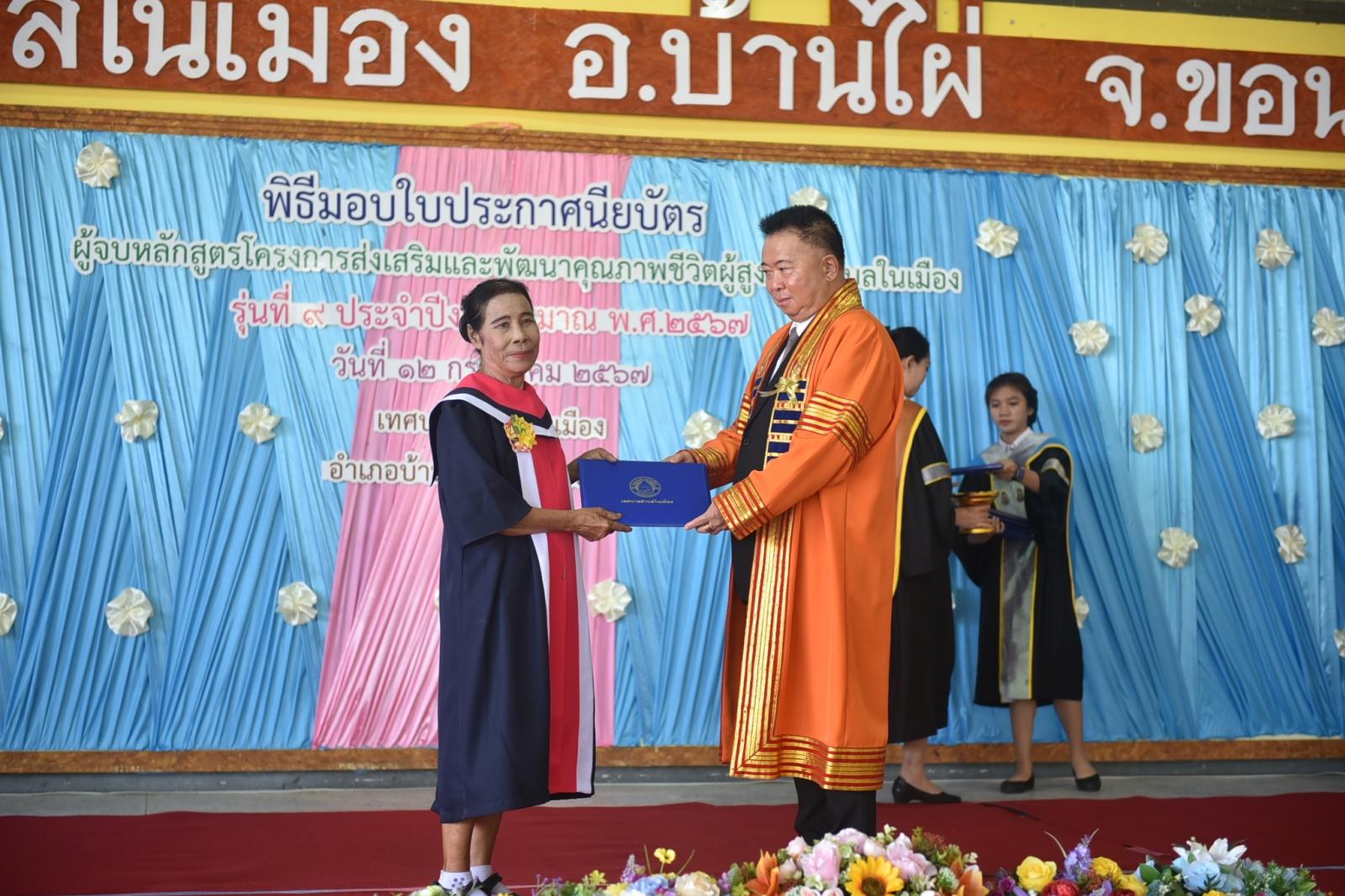 พิธีมอบประกาศนียบัตรให้แก่ผู้สูงอายุที่จบหลักสูตร ตามโครงการส่งเสริมและพัฒนาคุณภาพชีวิตผู้สูงอายุตำบลในเมือง รุ่นที่9 ประจำปีงบประมาณ 2567