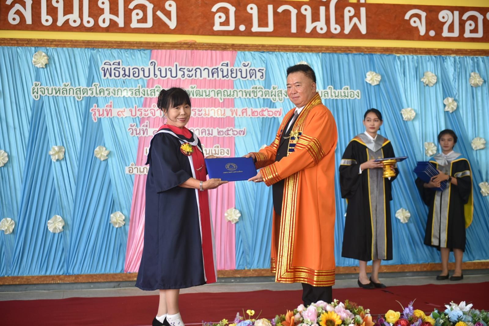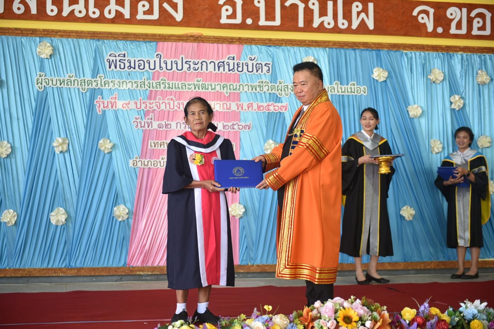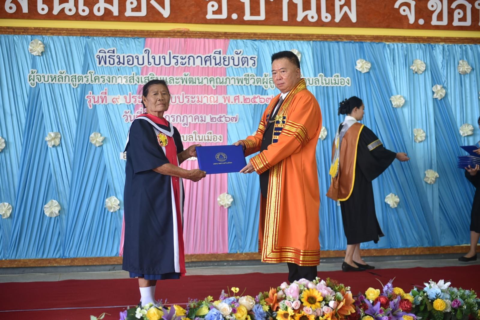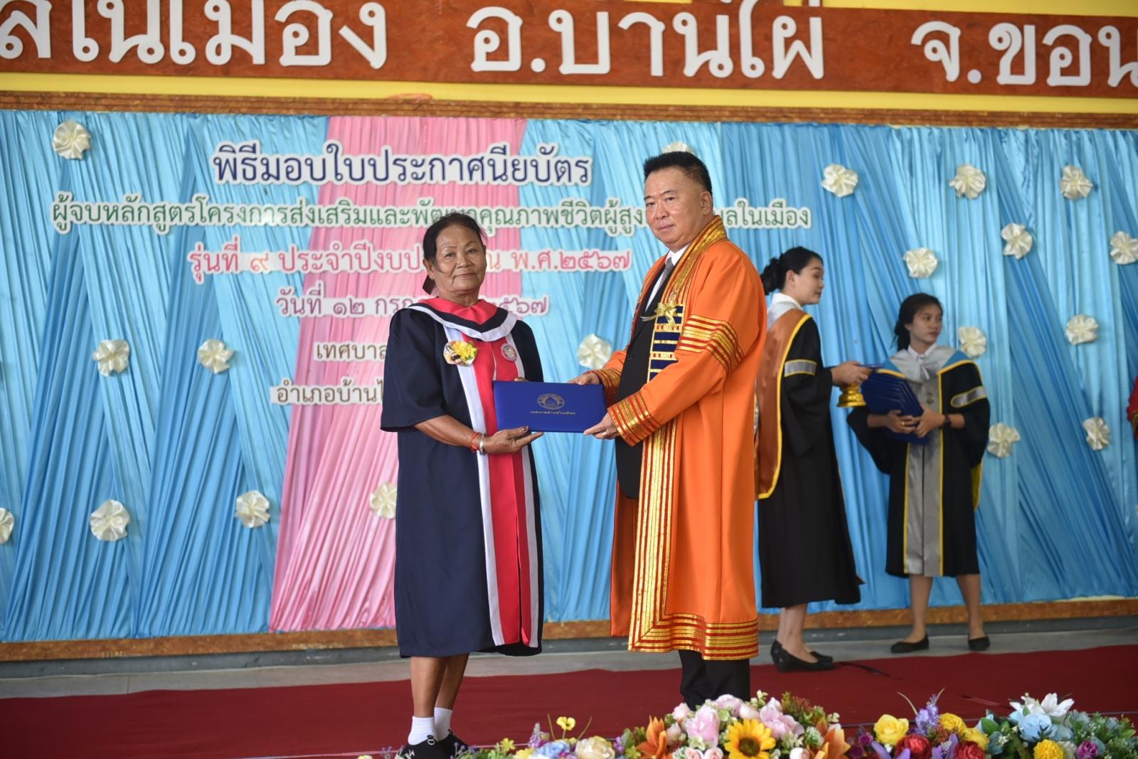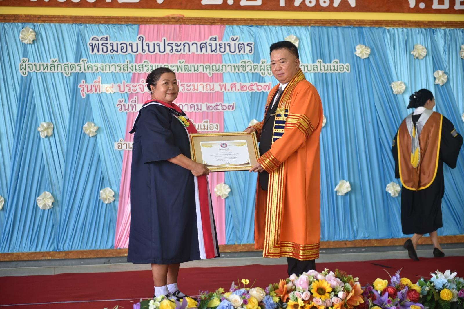 พิธีมอบประกาศนียบัตรให้แก่ผู้สูงอายุที่จบหลักสูตร ตามโครงการส่งเสริมและพัฒนาคุณภาพชีวิตผู้สูงอายุตำบลในเมือง รุ่นที่9 ประจำปีงบประมาณ 2567