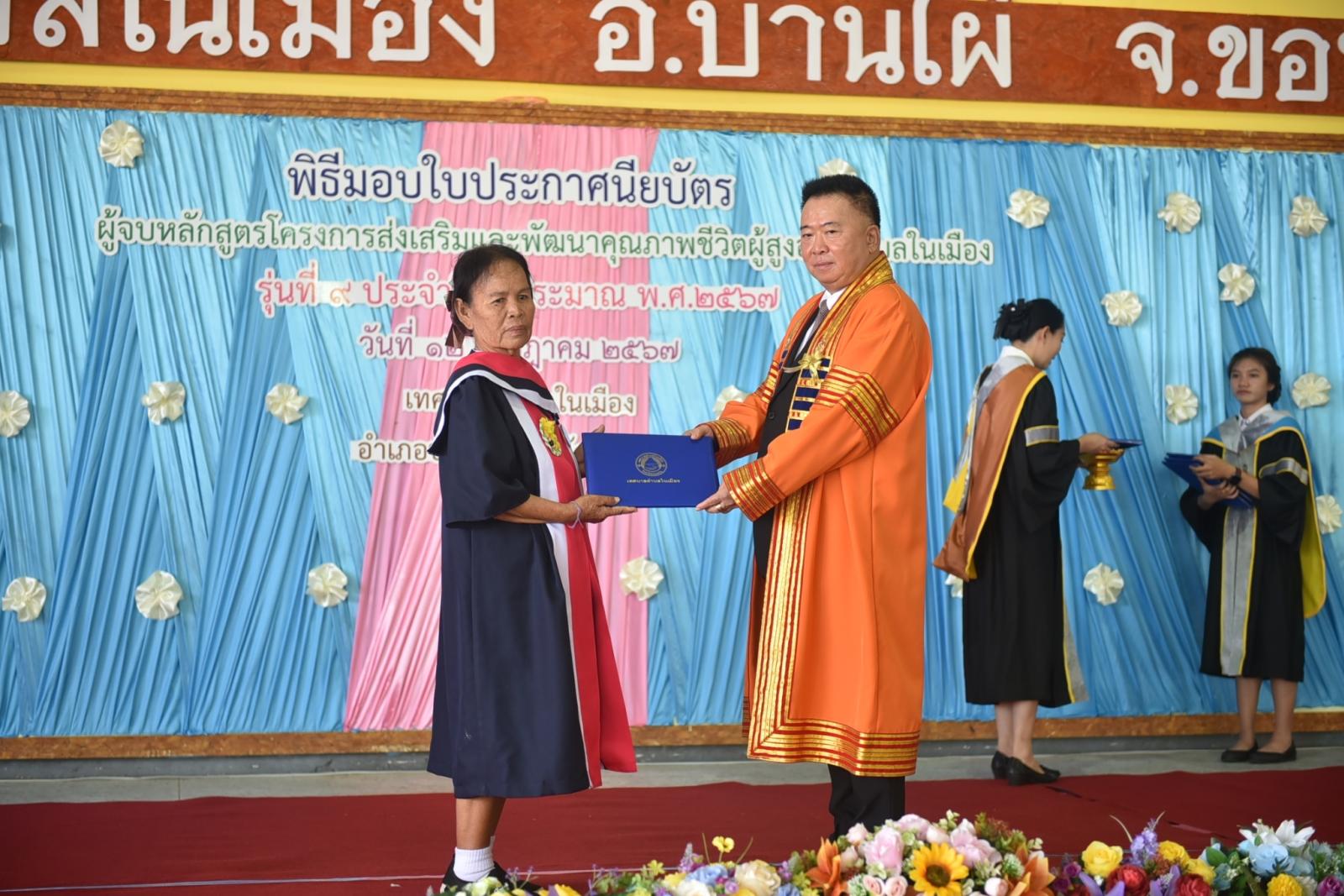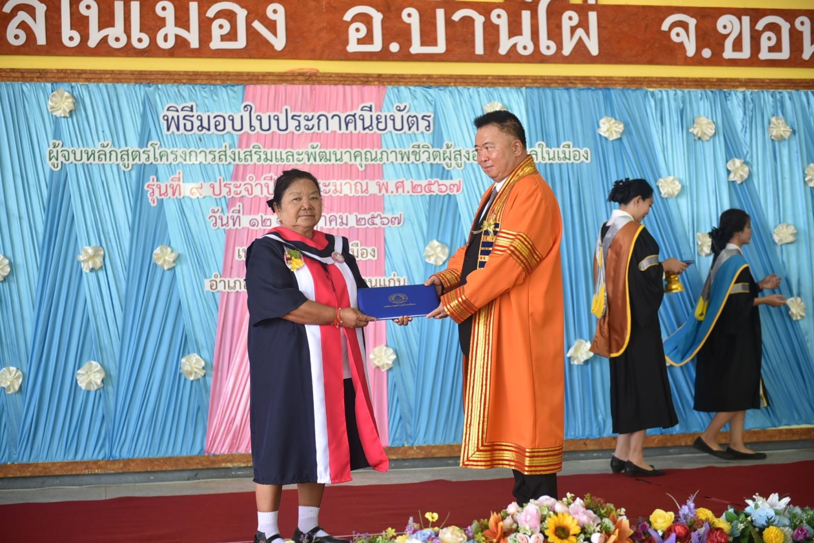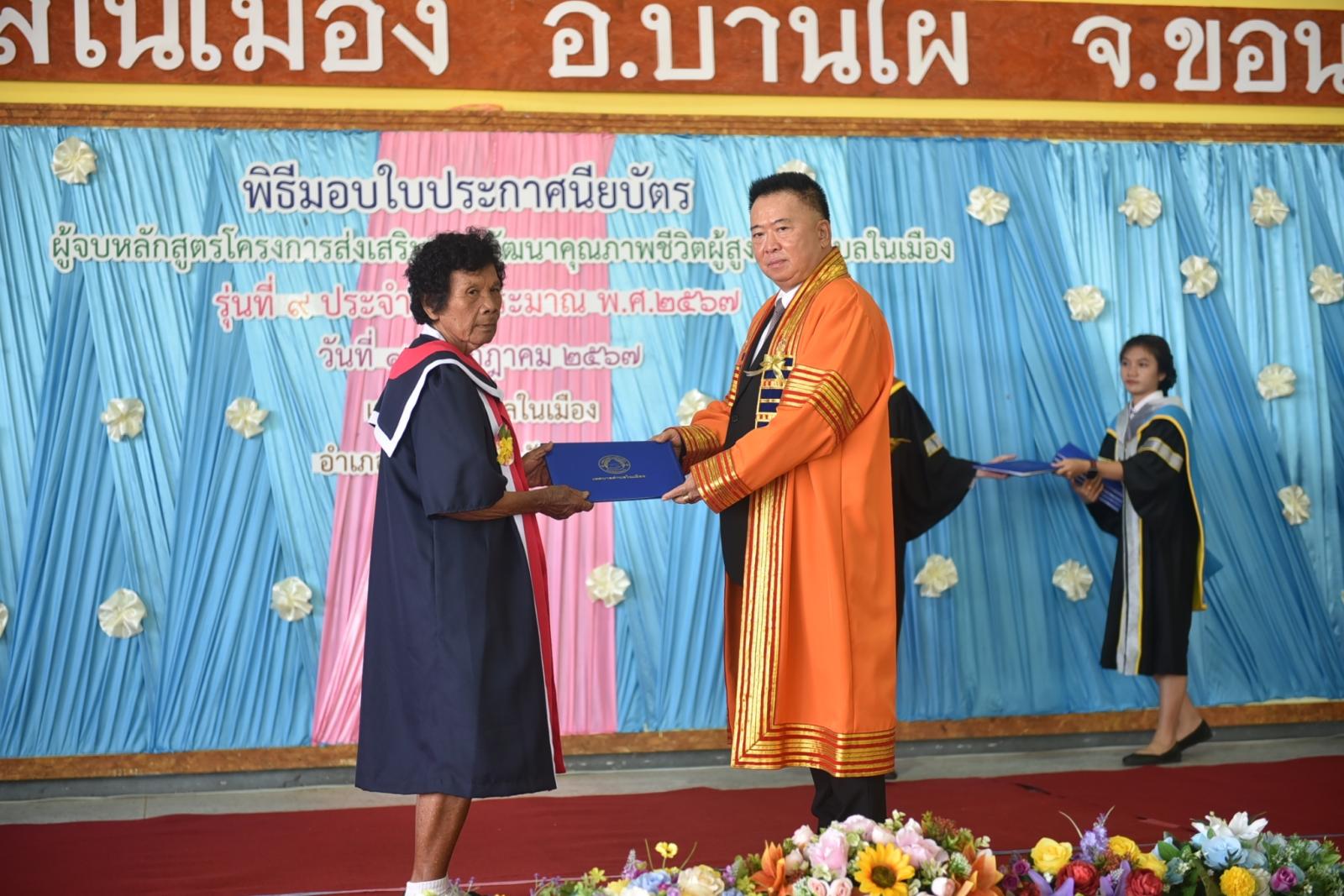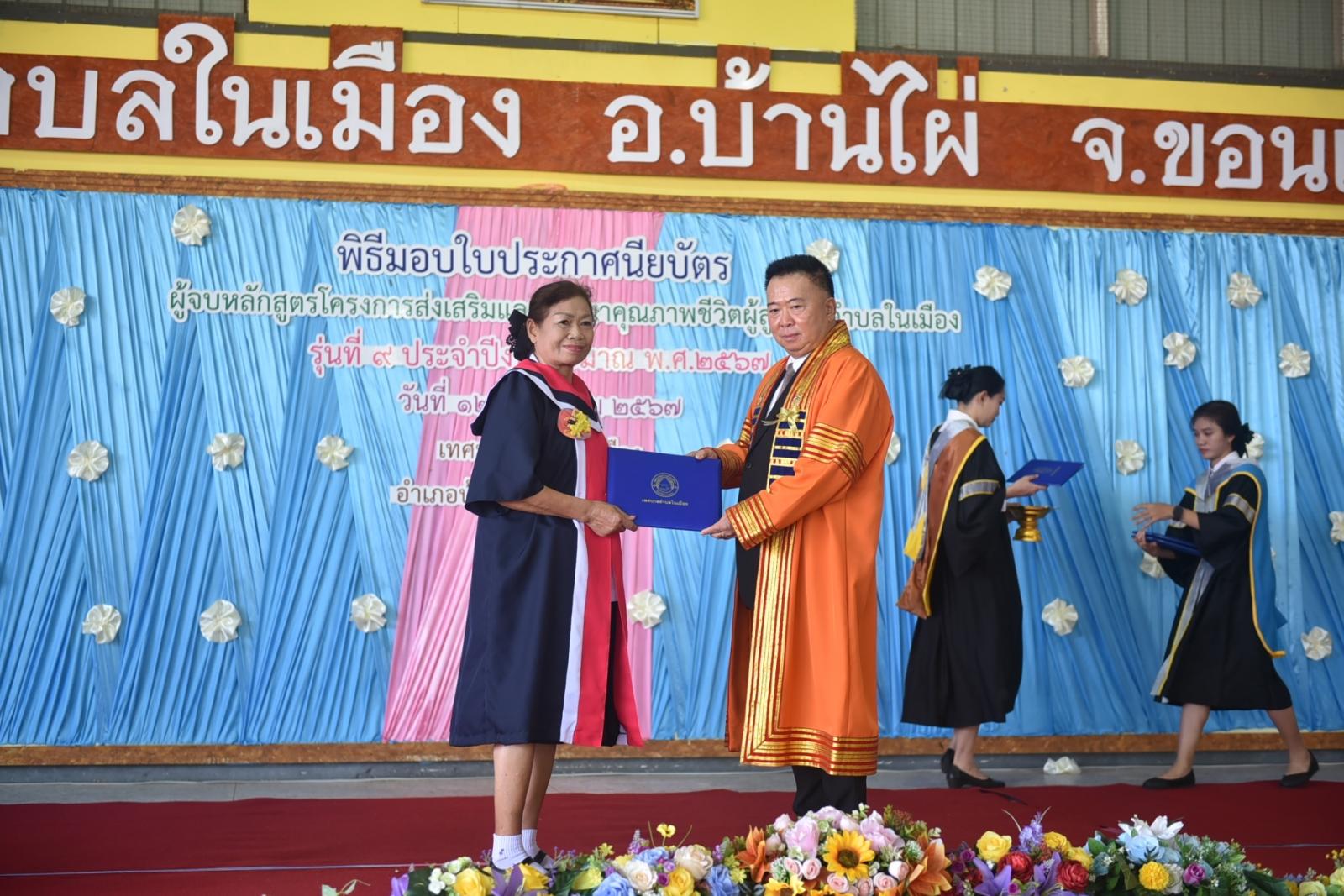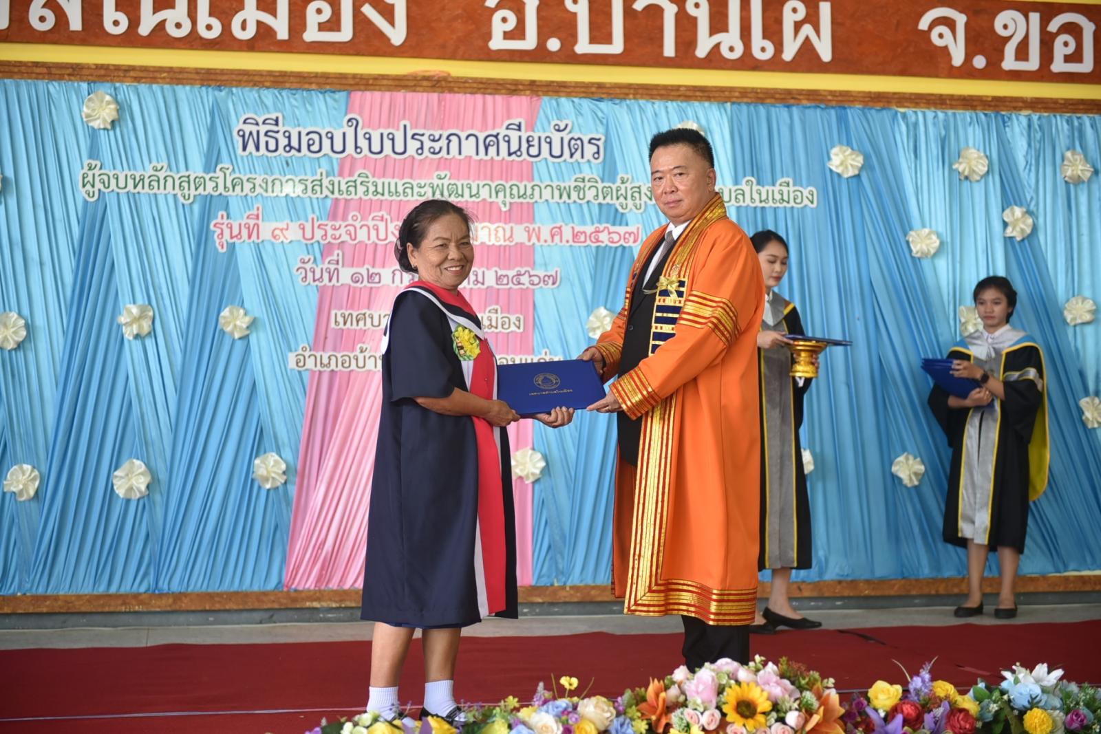 พิธีมอบประกาศนียบัตรให้แก่ผู้สูงอายุที่จบหลักสูตร ตามโครงการส่งเสริมและพัฒนาคุณภาพชีวิตผู้สูงอายุตำบลในเมือง รุ่นที่9 ประจำปีงบประมาณ 2567
