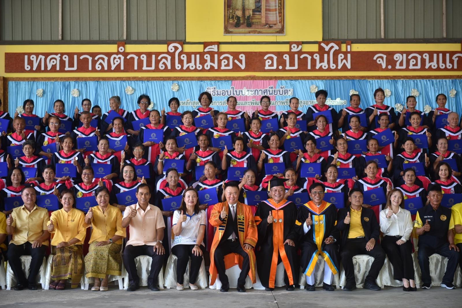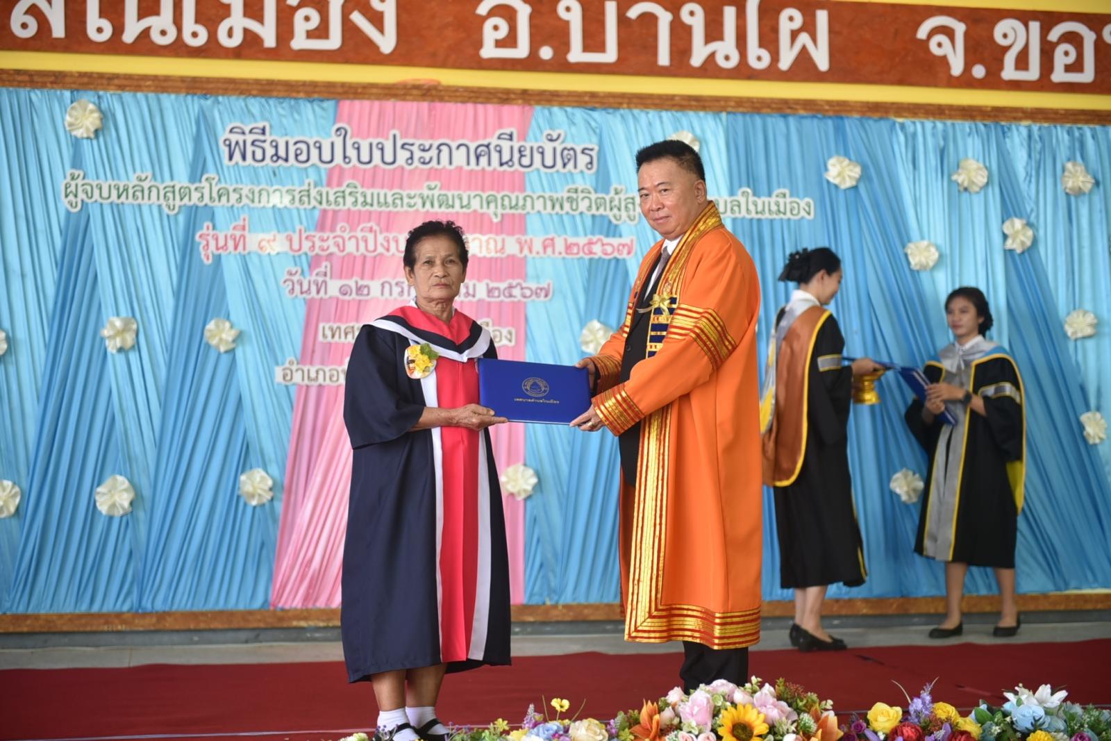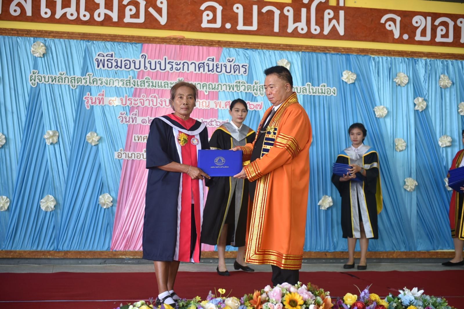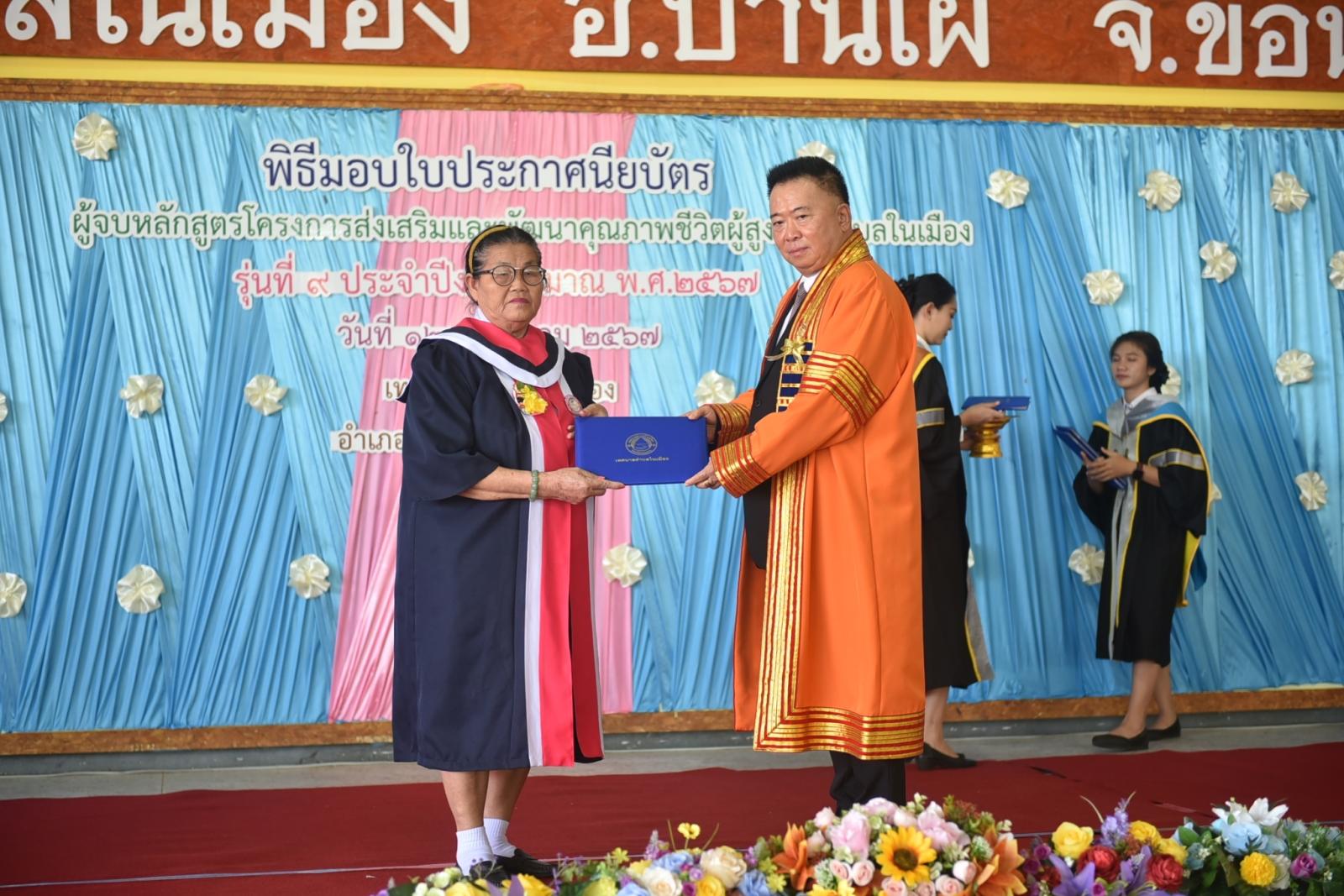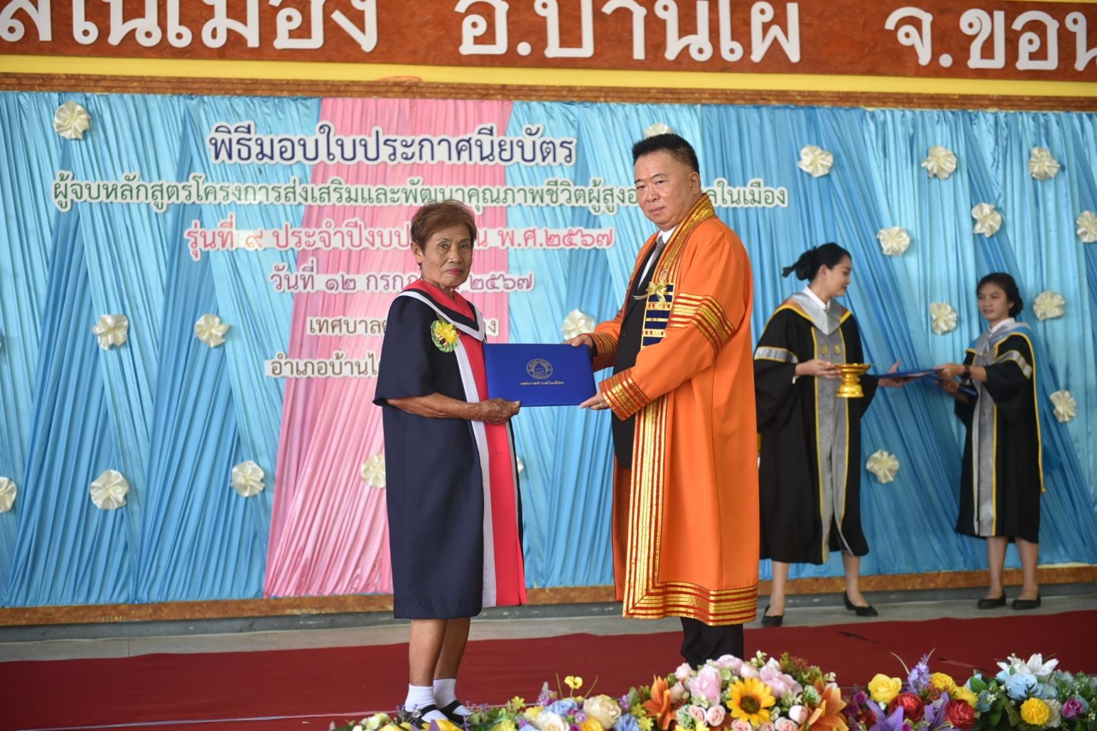 พิธีมอบประกาศนียบัตรให้แก่ผู้สูงอายุที่จบหลักสูตร ตามโครงการส่งเสริมและพัฒนาคุณภาพชีวิตผู้สูงอายุตำบลในเมือง รุ่นที่9 ประจำปีงบประมาณ 2567