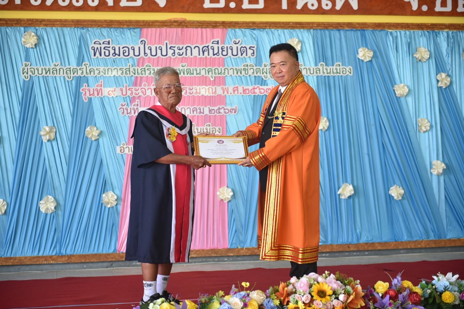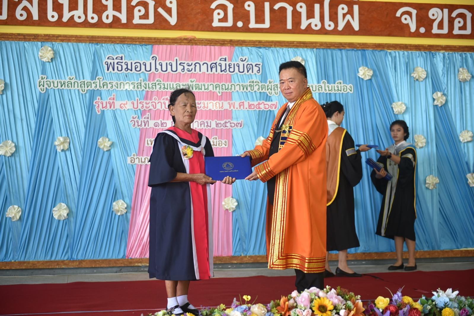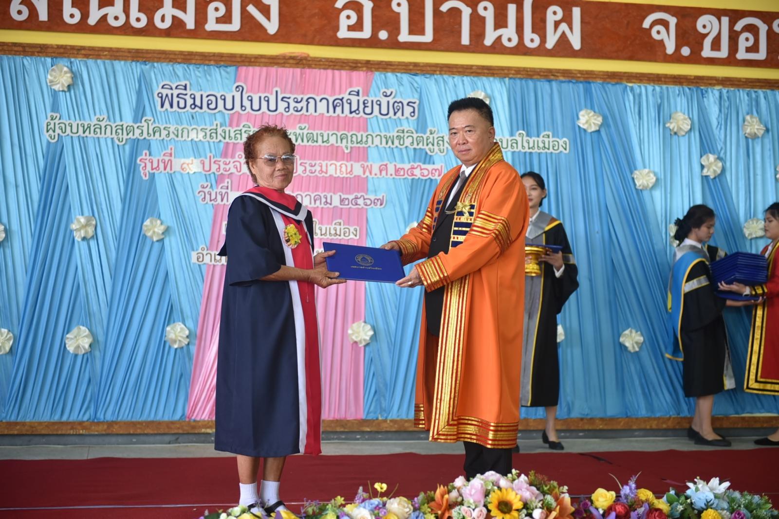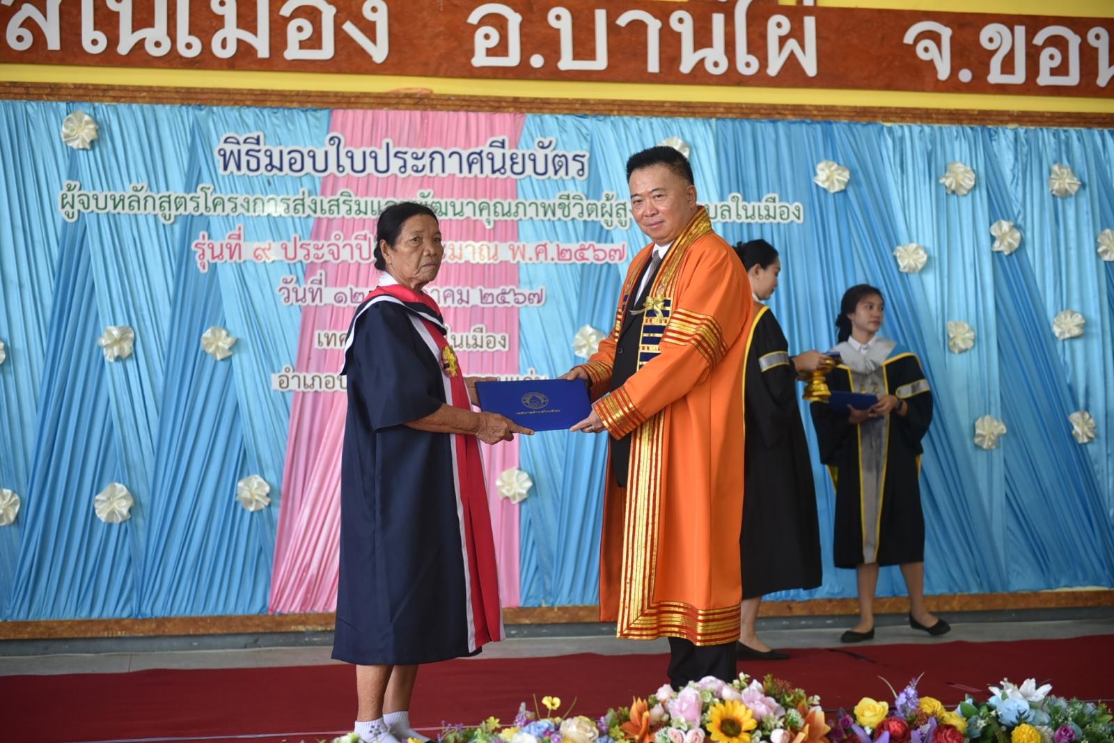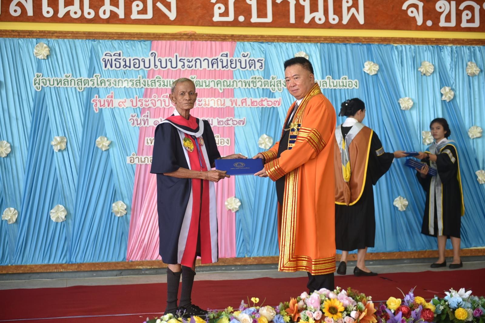 พิธีมอบประกาศนียบัตรให้แก่ผู้สูงอายุที่จบหลักสูตร ตามโครงการส่งเสริมและพัฒนาคุณภาพชีวิตผู้สูงอายุตำบลในเมือง รุ่นที่9 ประจำปีงบประมาณ 2567